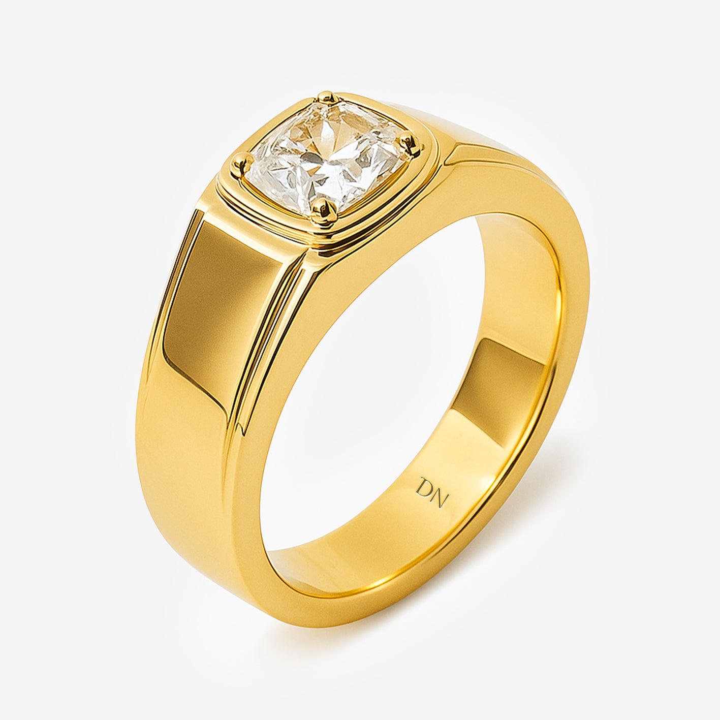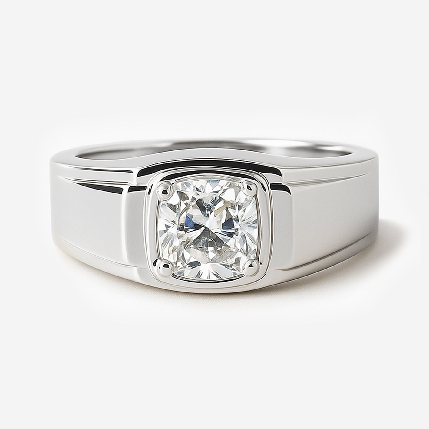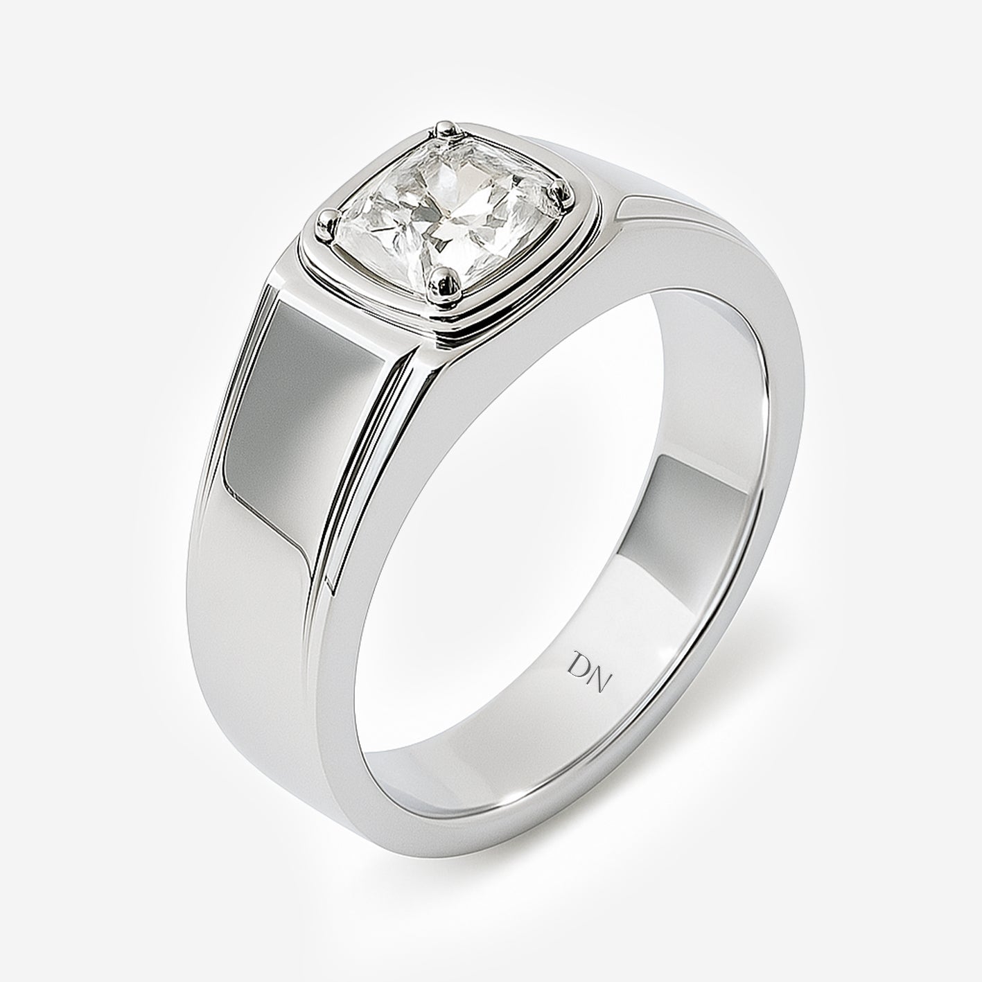 Arden Cushion-Cut Diamond Men’s Ring. Arden is designed for strength and presence. Featuring a cushion-cut diamond securely set within bold, structured lines, this ring embodies confidence and modern refinement. The substantial band adds weight and balance, while the diamond’s brilliance offers a striking contrast to the solid metal. Purposeful and powerful, Arden is crafted for those who value distinction in every detail.