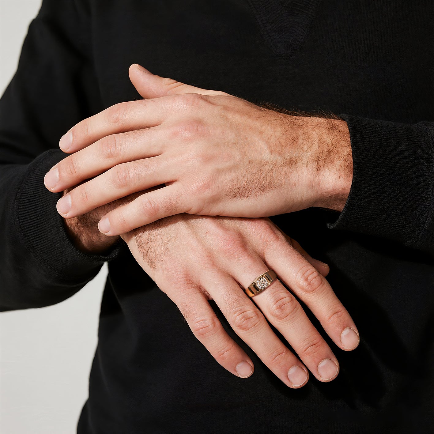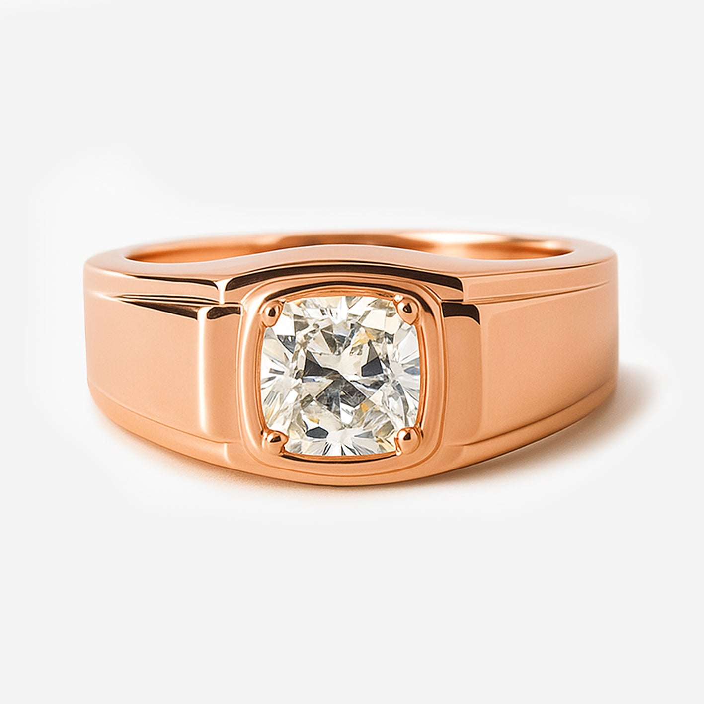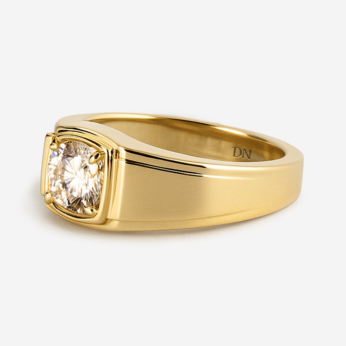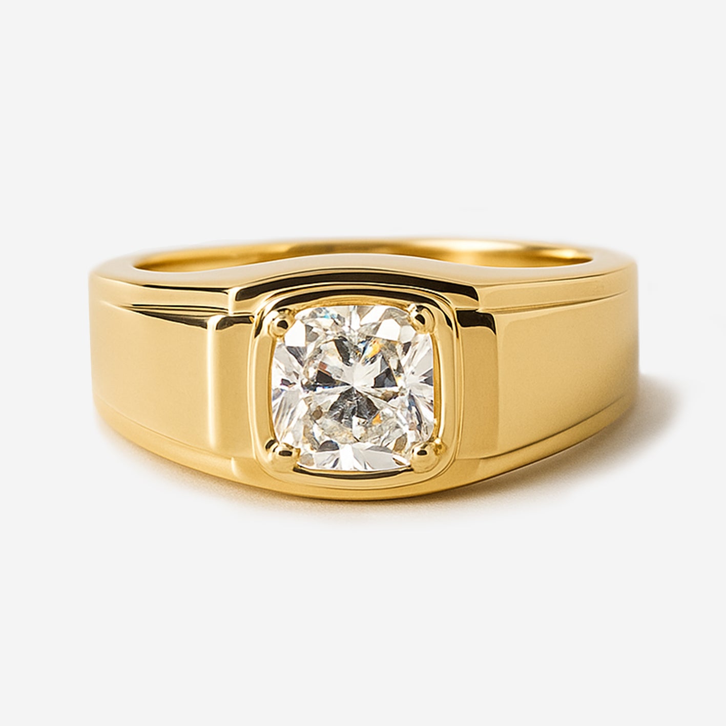 Arden Cushion-Cut Diamond Men’s Ring. Arden is designed for strength and presence. Featuring a cushion-cut diamond securely set within bold, structured lines, this ring embodies confidence and modern refinement. The substantial band adds weight and balance, while the diamond’s brilliance offers a striking contrast to the solid metal. Purposeful and powerful, Arden is crafted for those who value distinction in every detail.