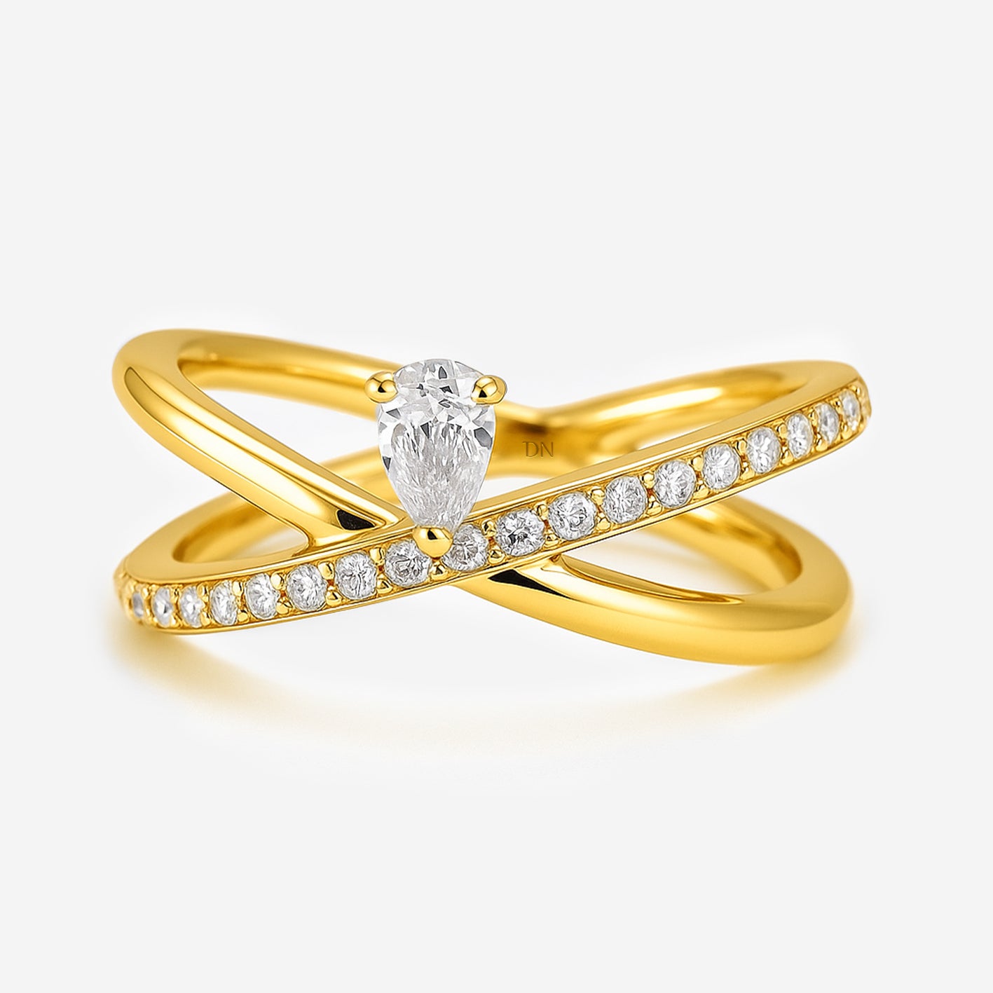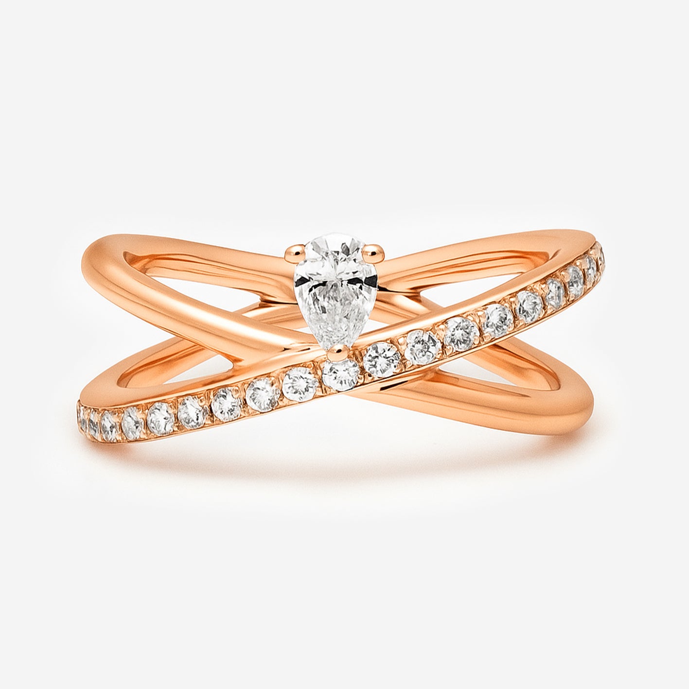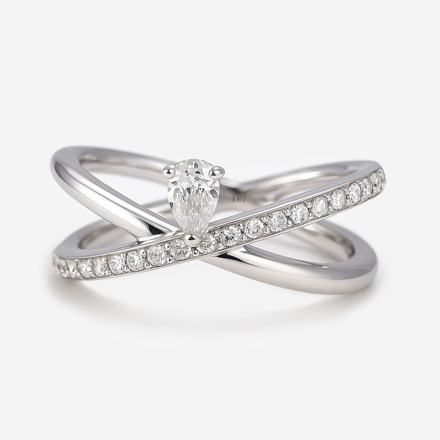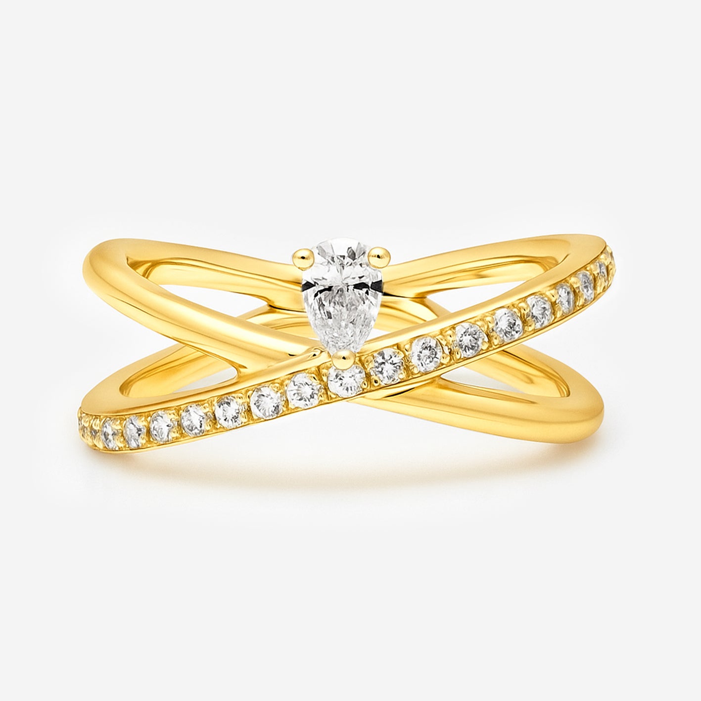 Aurelia Pear Cut & Pavé Crossover Lab Grown Diamond Ring. The Aurelia Ring features a modern crossover design, highlighted by a brilliant pear-cut lab grown diamond and a sleek band accented with pavé-set diamonds. Elegant and versatile, it brings a touch of contemporary sparkle to everyday wear or special occasions.