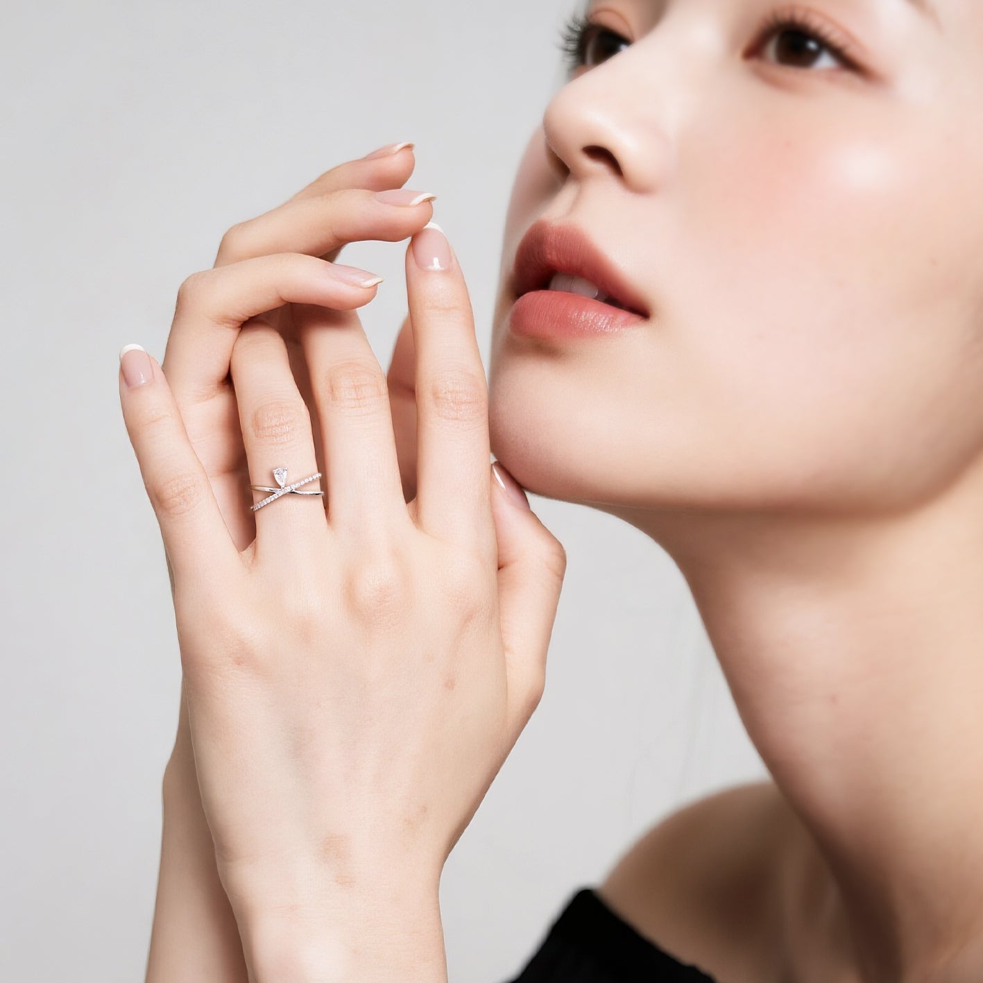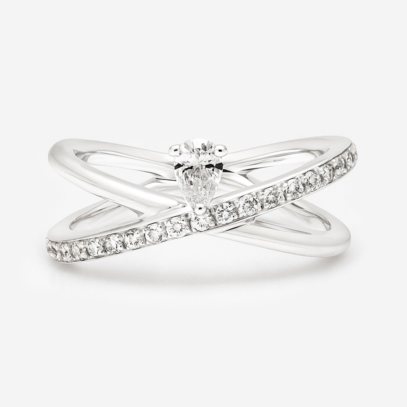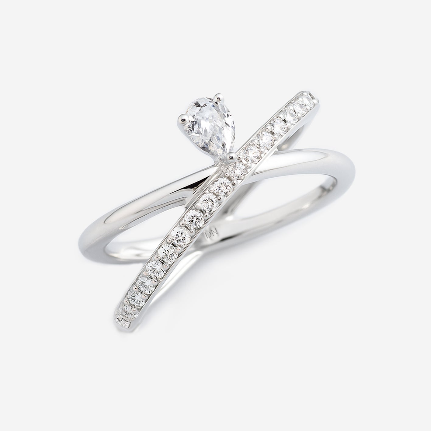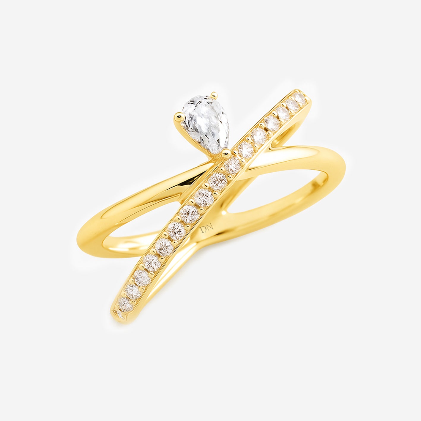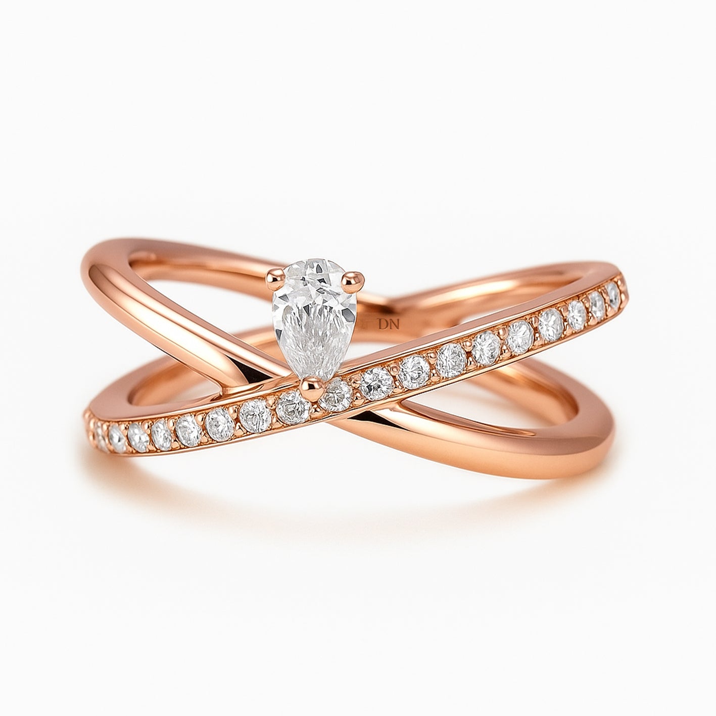 Aurelia Pear Cut & Pavé Crossover Lab Grown Diamond Ring. The Aurelia Ring features a modern crossover design, highlighted by a brilliant pear-cut lab grown diamond and a sleek band accented with pavé-set diamonds. Elegant and versatile, it brings a touch of contemporary sparkle to everyday wear or special occasions.