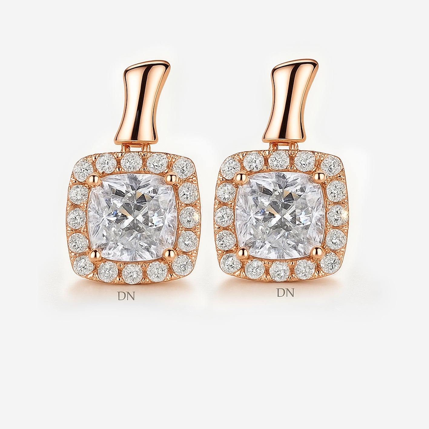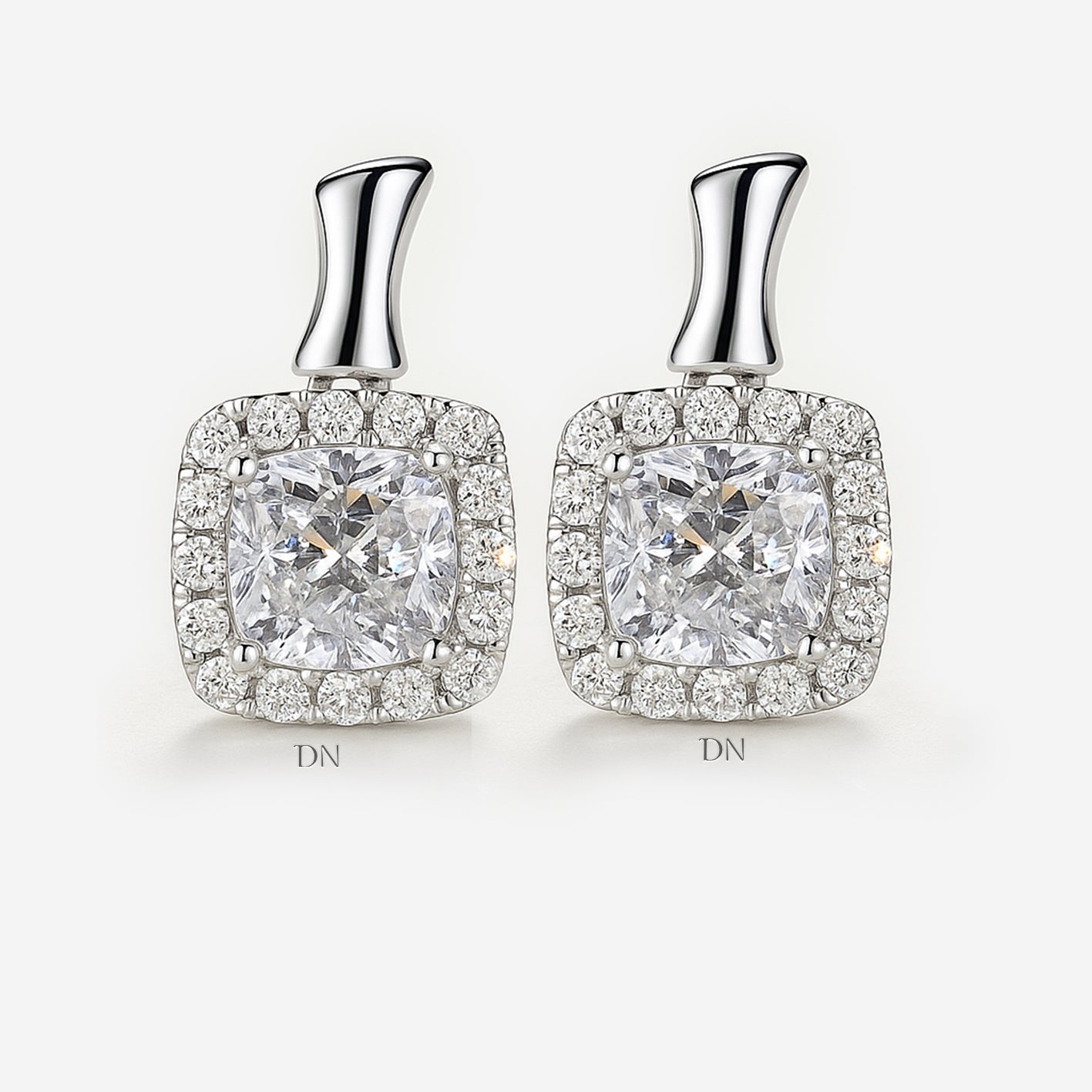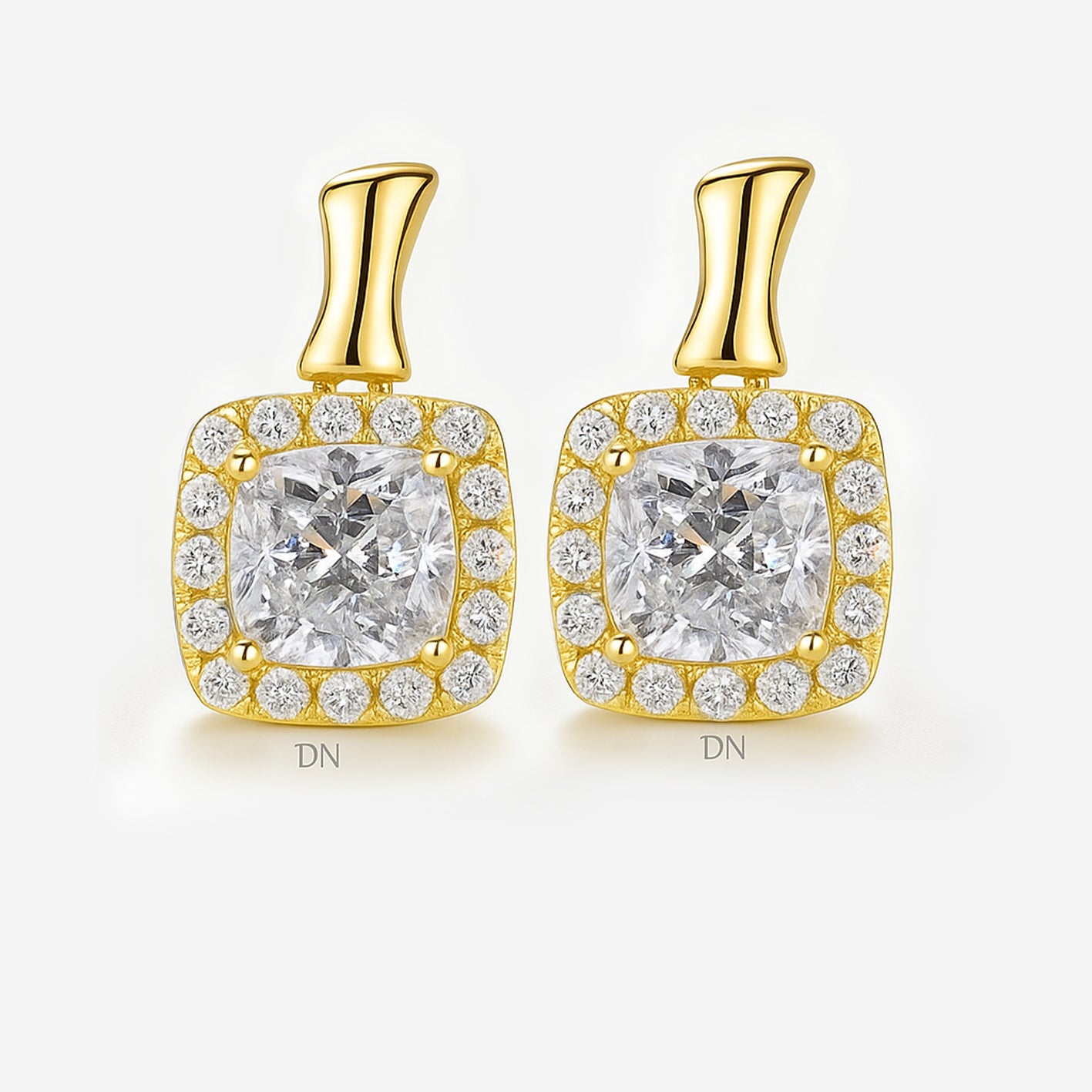 Averie highlights cushion-cut center diamonds encircled by delicate halos, creating a luminous soft-square silhouette. Suspended from polished curved studs, the earrings offer refined sparkle with graceful movement, making them a radiant choice for both daily elegance and celebratory moments.