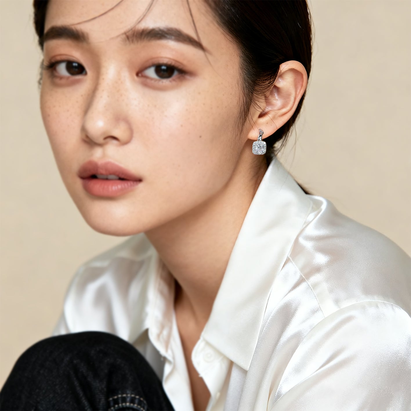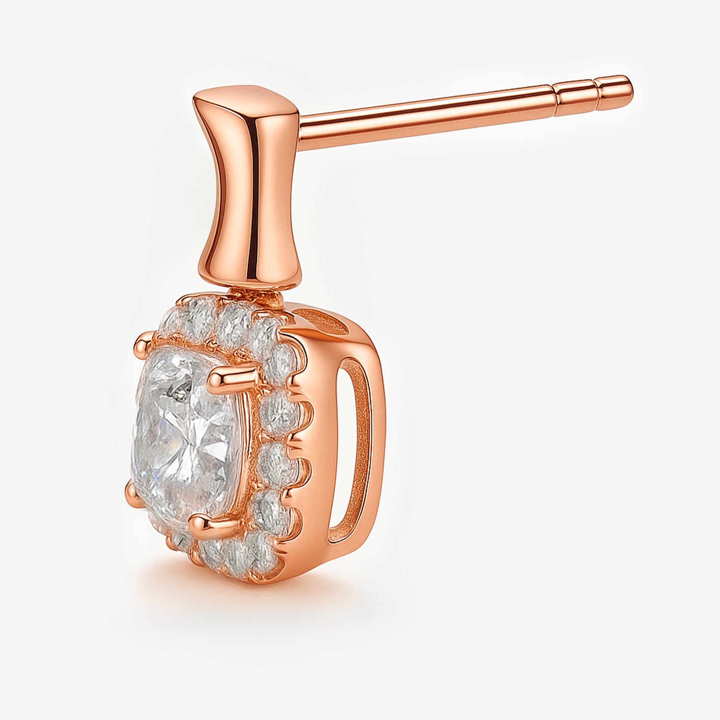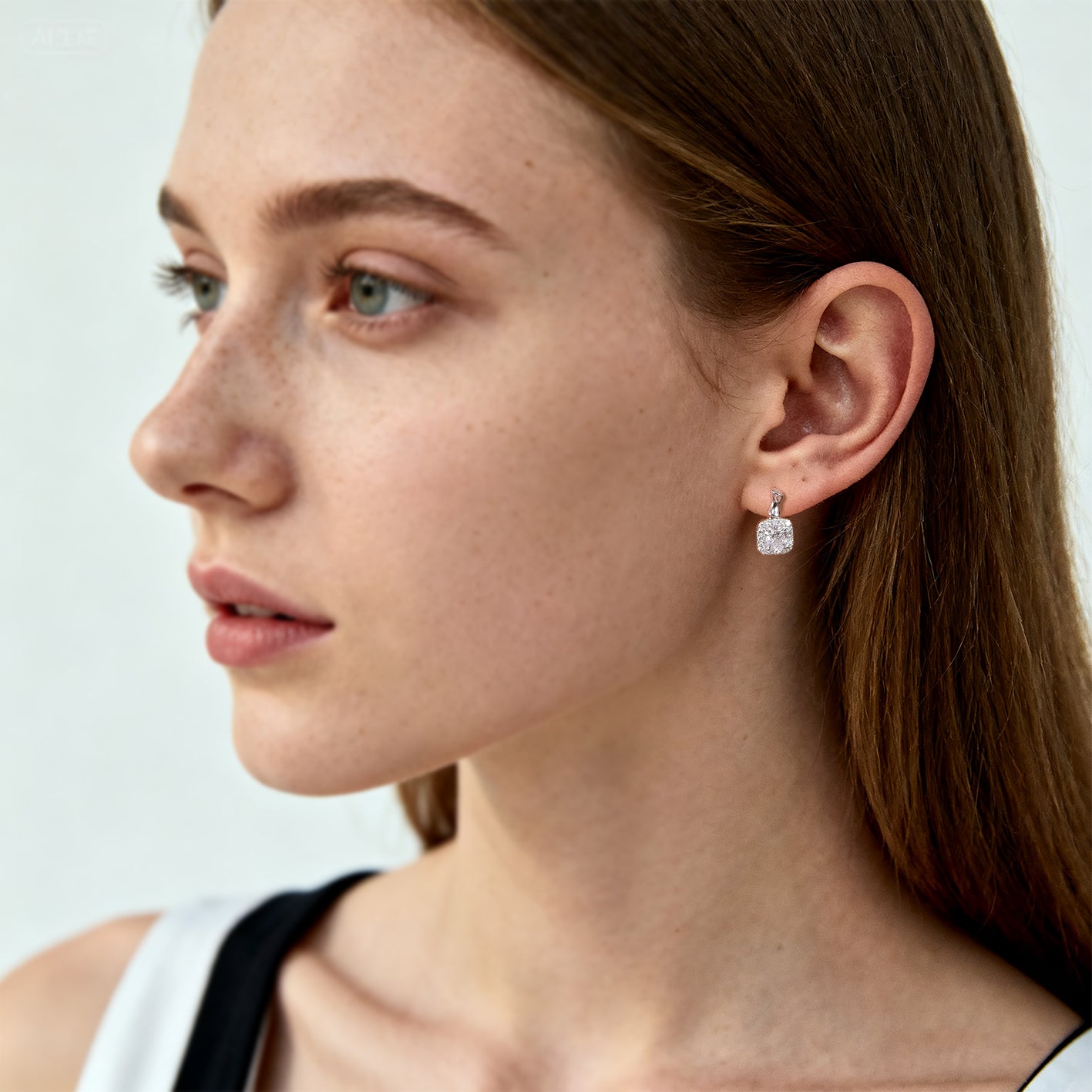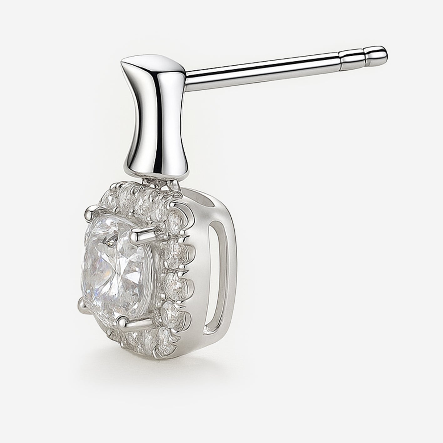 Averie highlights cushion-cut center diamonds encircled by delicate halos, creating a luminous soft-square silhouette. Suspended from polished curved studs, the earrings offer refined sparkle with graceful movement, making them a radiant choice for both daily elegance and celebratory moments.