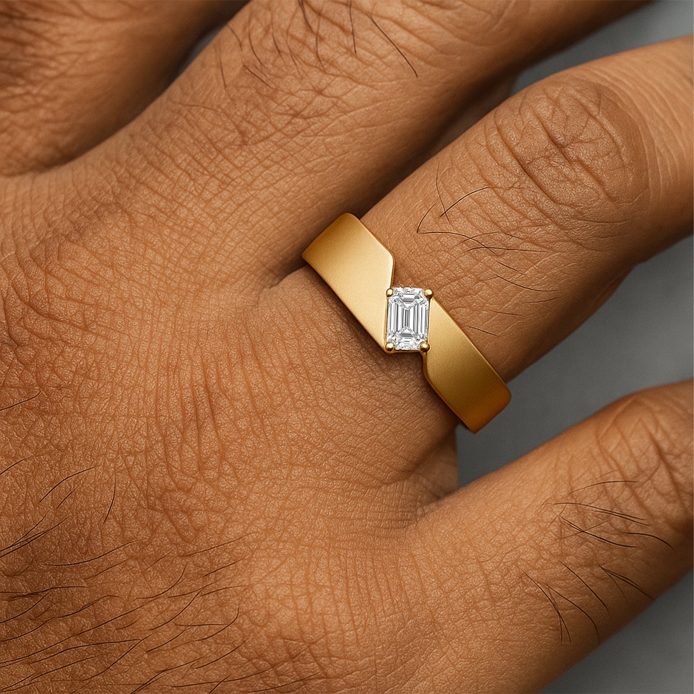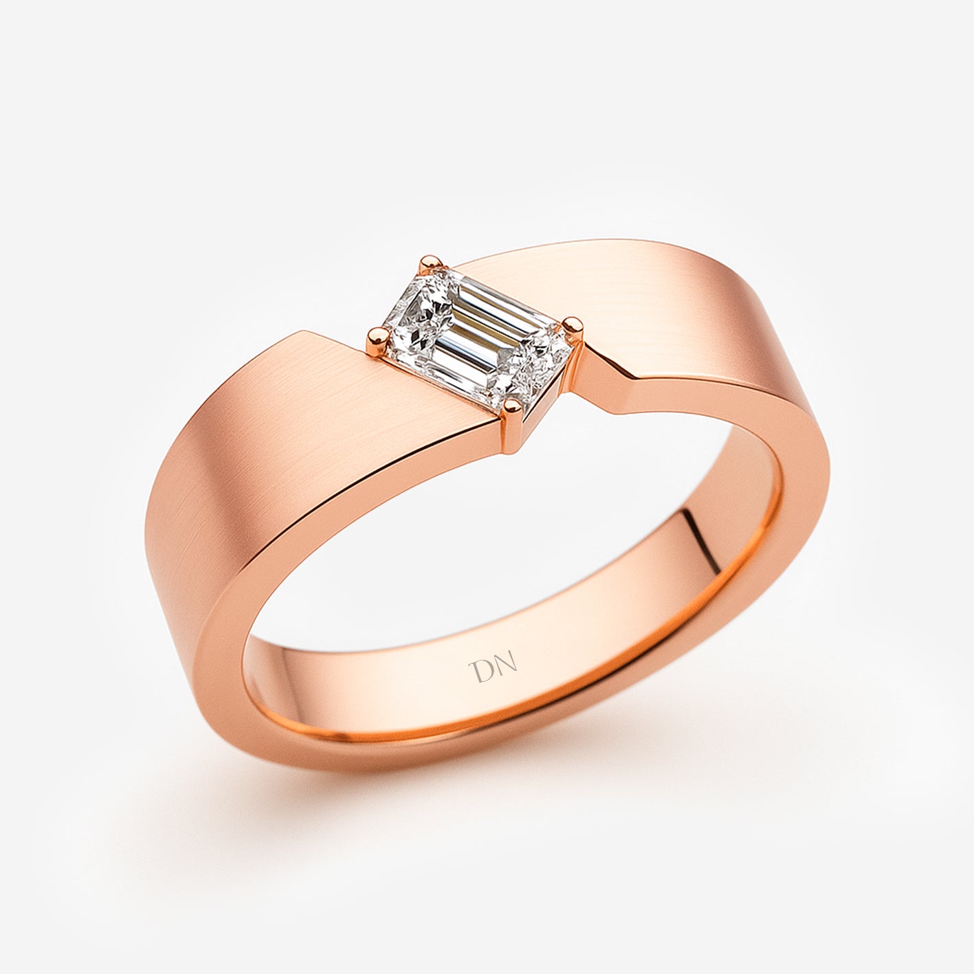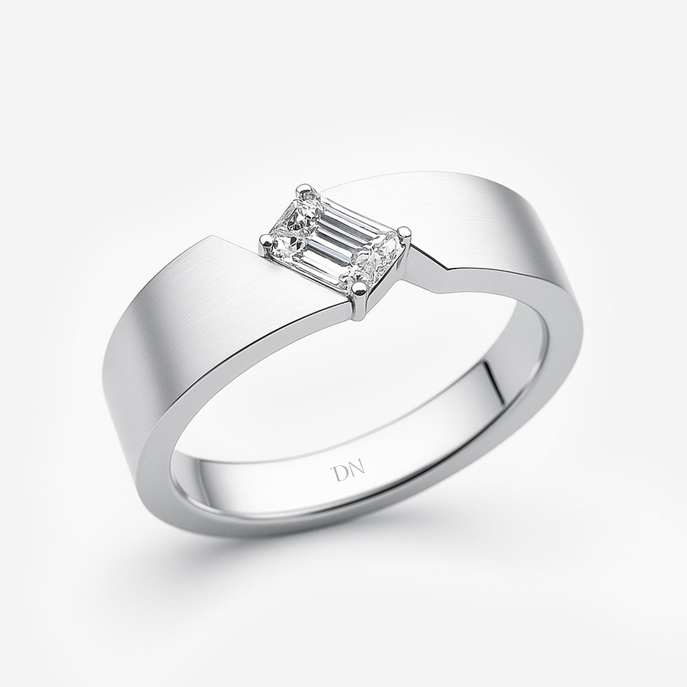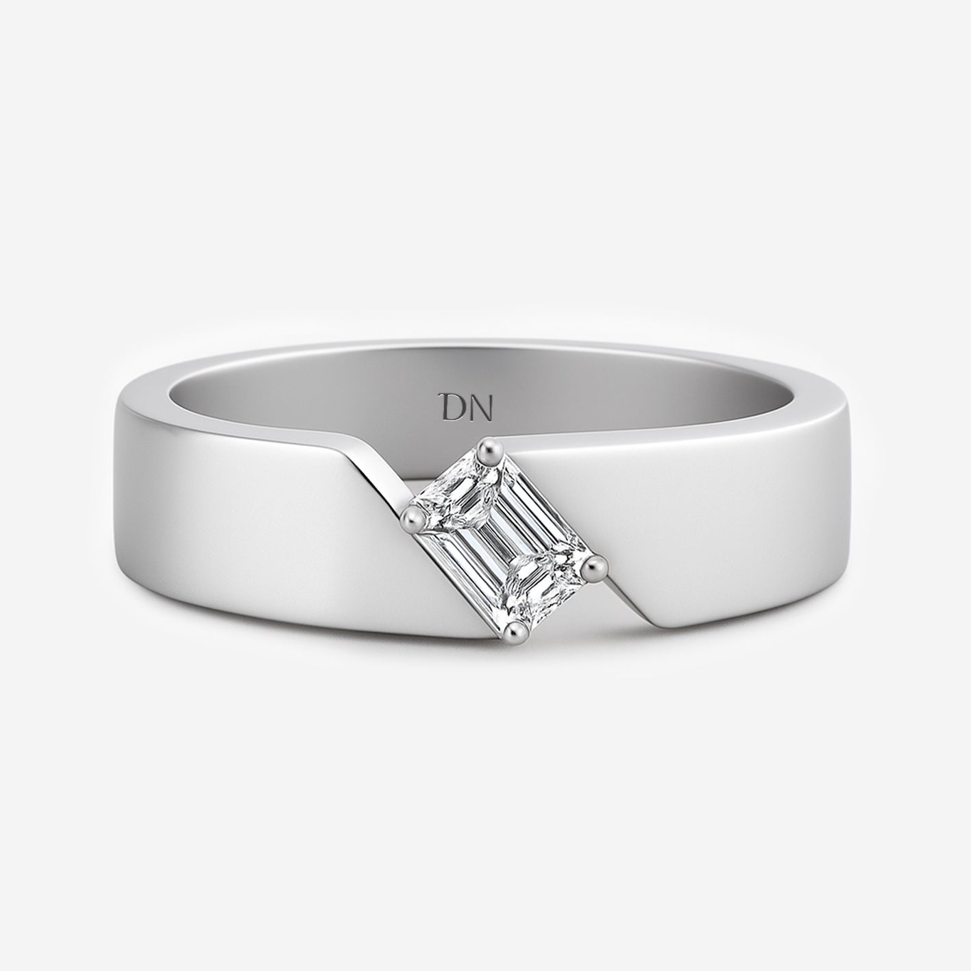 Elias Asymmetrical Band Men’s Ring with Emerald-Cut Diamond. Elias embraces modern design with an emerald-cut diamond set against an asymmetrical band. The bold geometry highlights both contrast and balance, giving the ring a distinctive architectural character. Refined yet powerful, Elias is crafted for men who value individuality expressed through precision and strength.