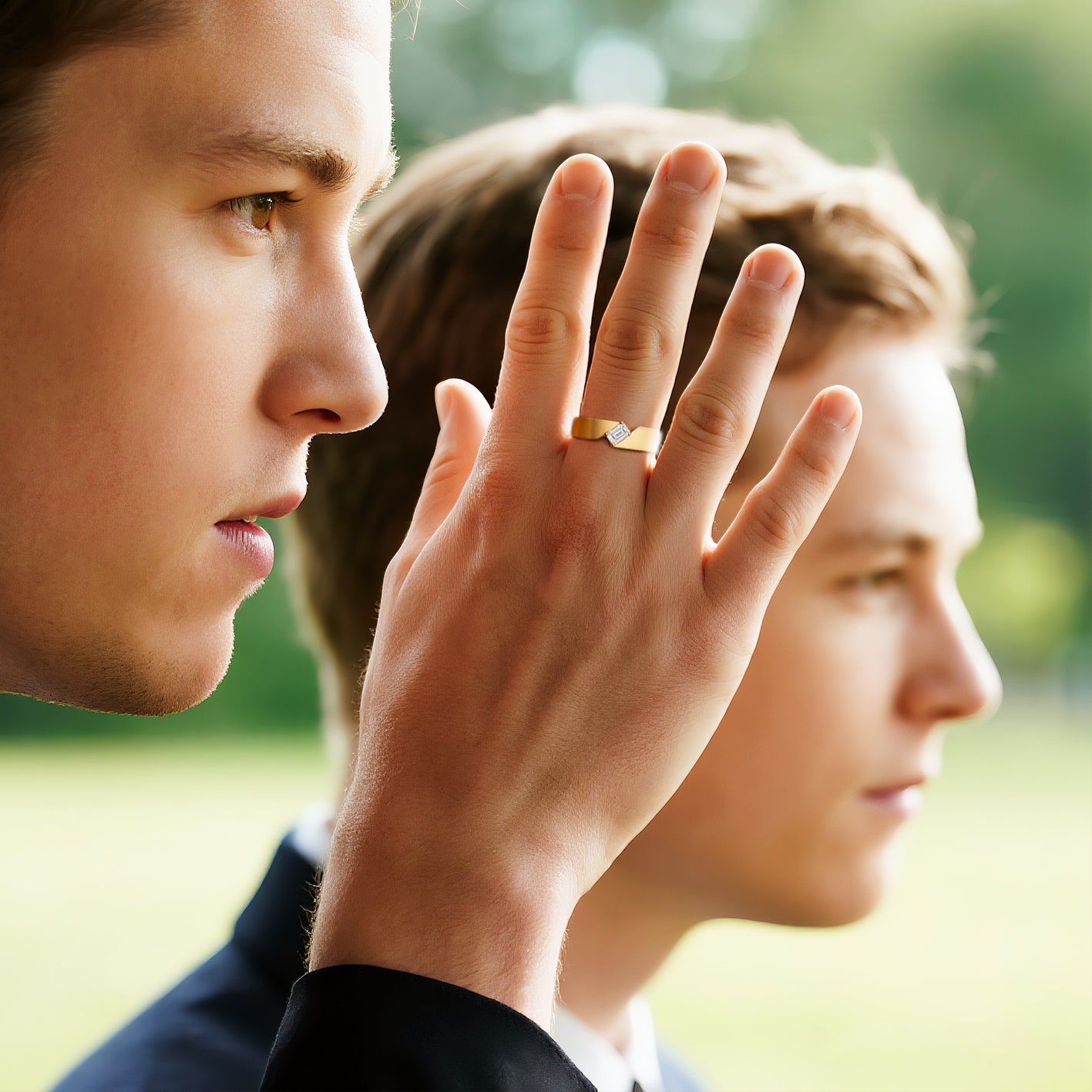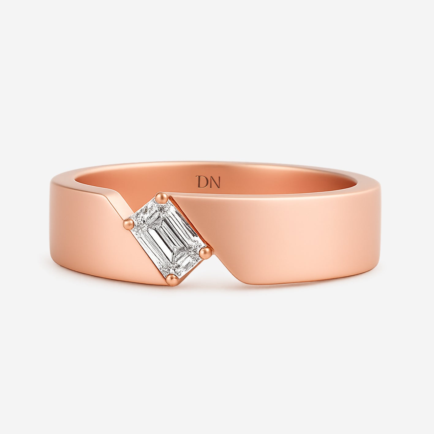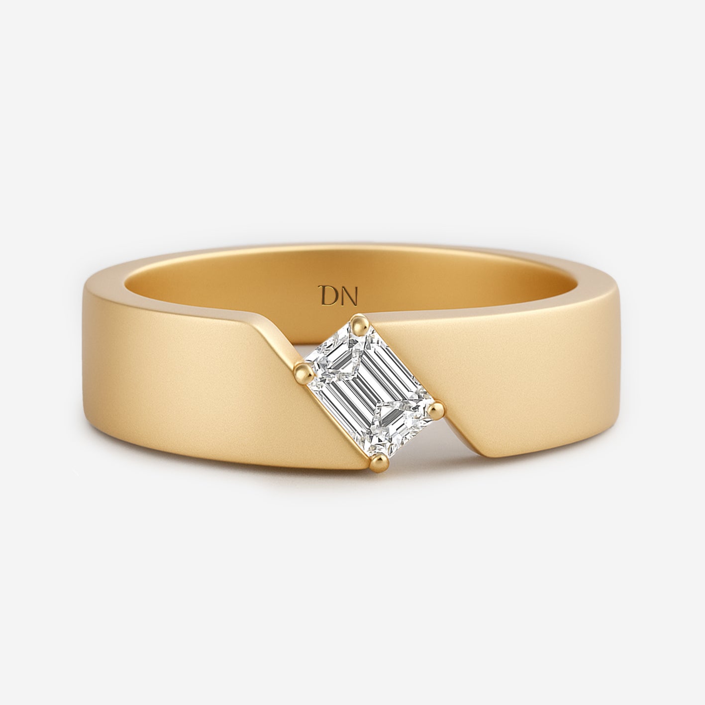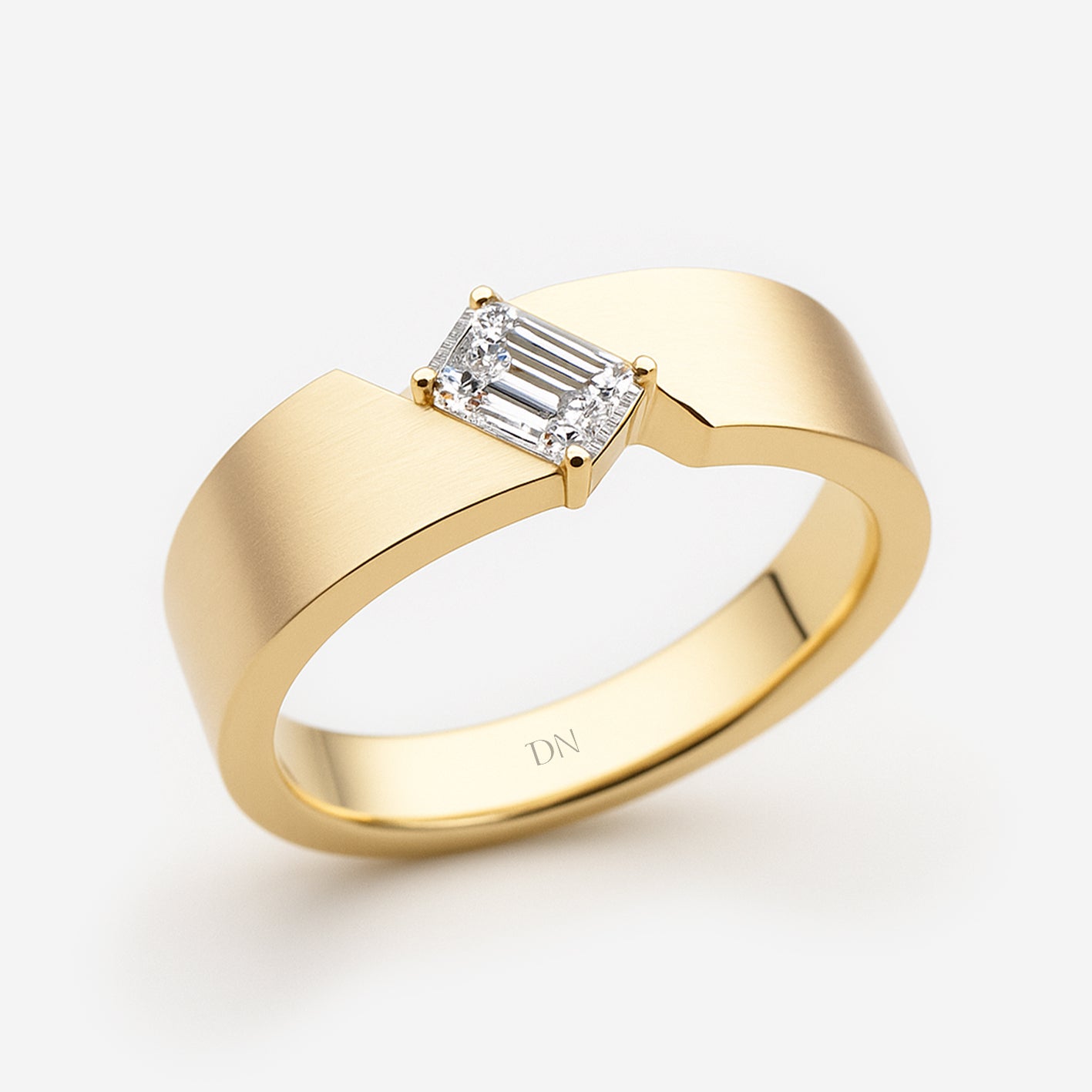 Elias Asymmetrical Band Men’s Ring with Emerald-Cut Diamond. Elias embraces modern design with an emerald-cut diamond set against an asymmetrical band. The bold geometry highlights both contrast and balance, giving the ring a distinctive architectural character. Refined yet powerful, Elias is crafted for men who value individuality expressed through precision and strength.
