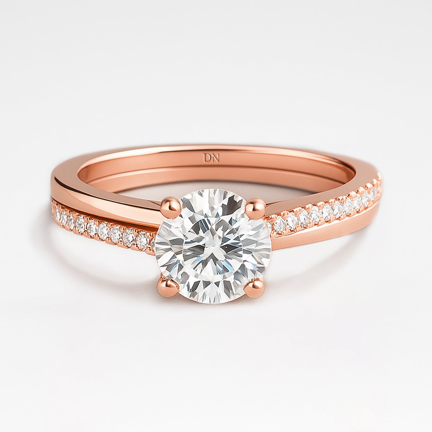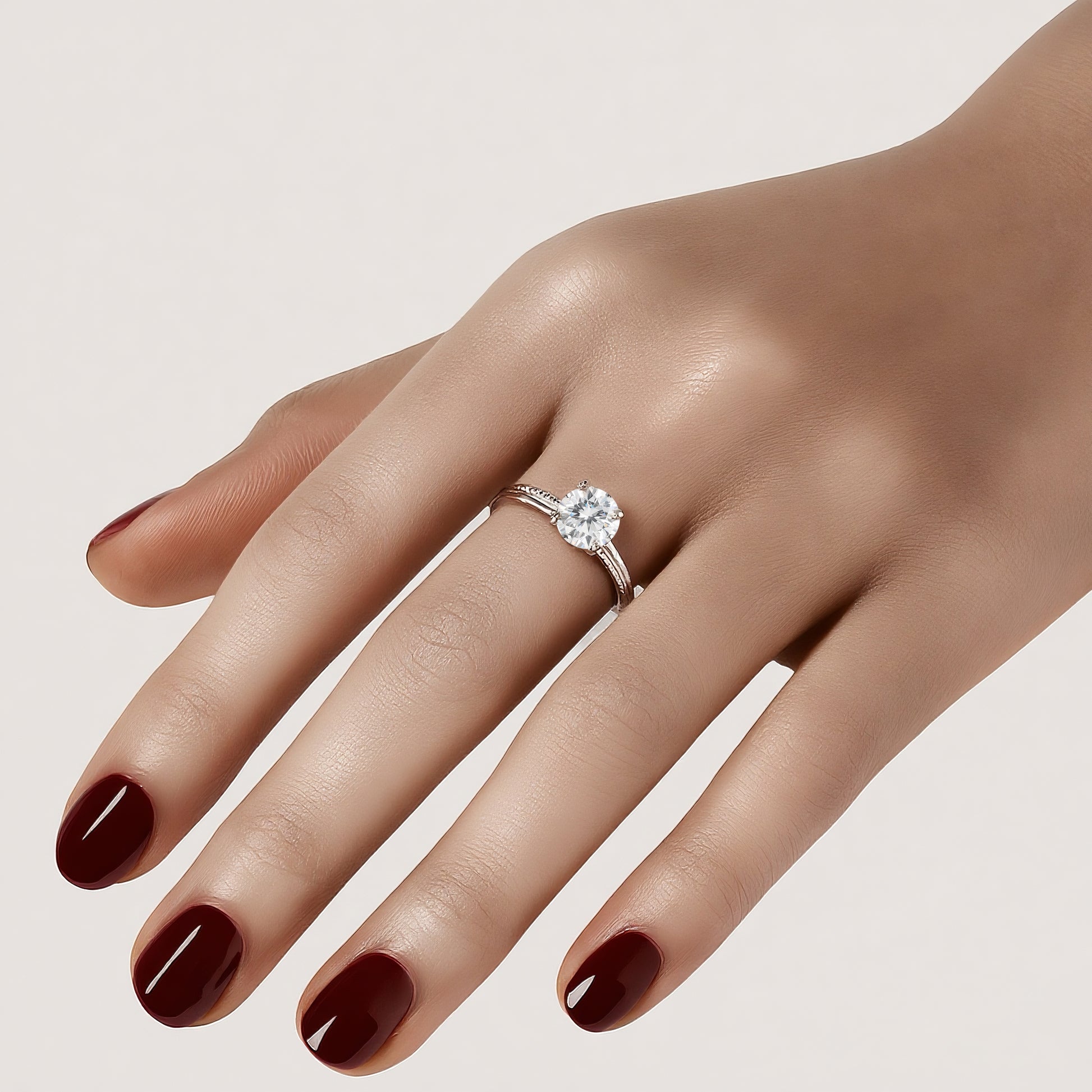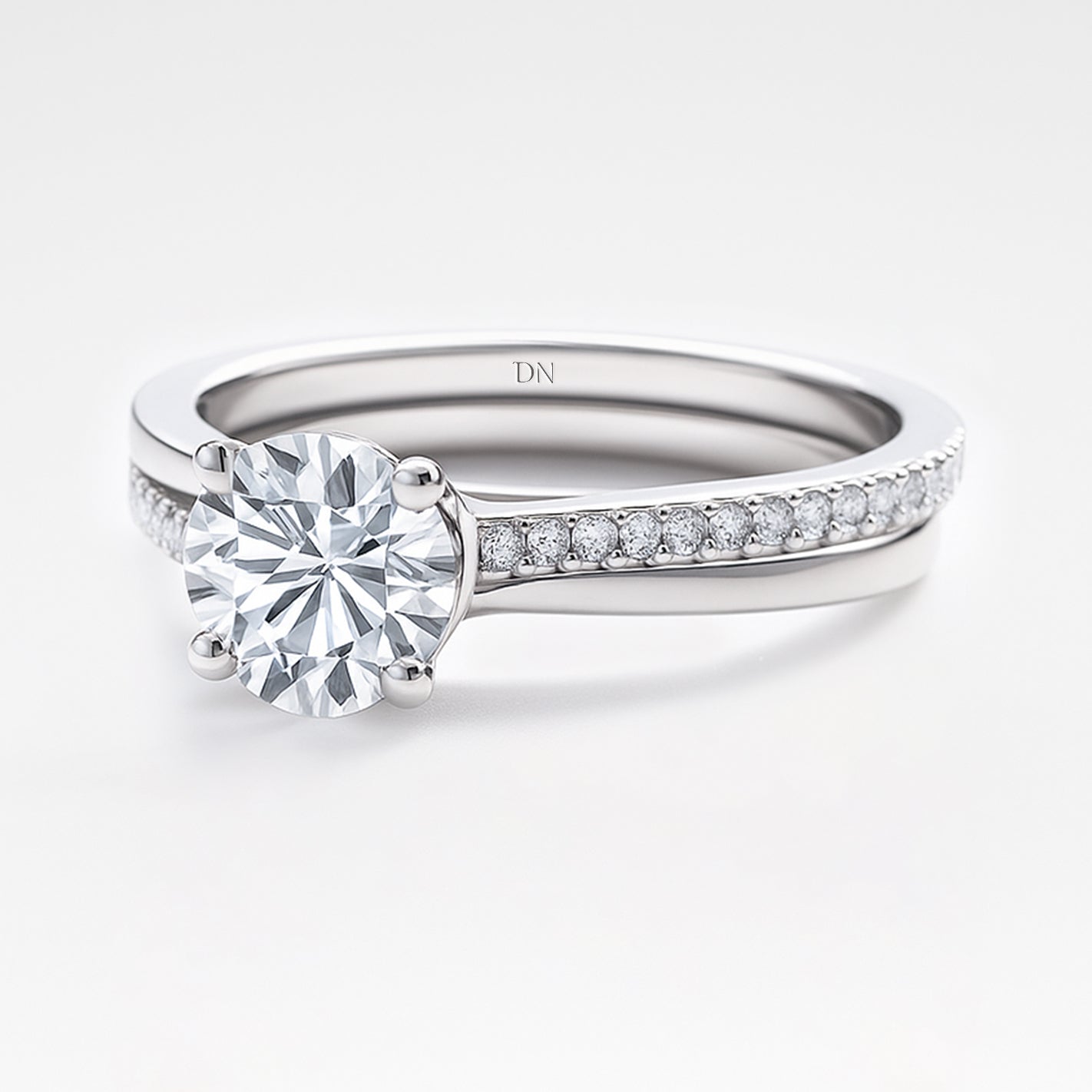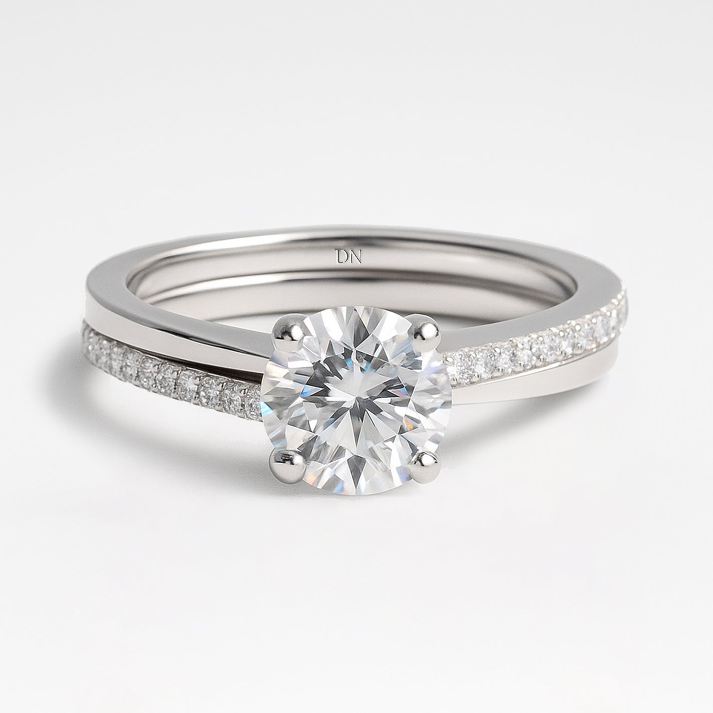 Elle Round Cut Dual-Band Platinum & Micropavé 4-Prong Lab Grown Diamond Solitaire Engagement Ring. The Elle ring redefines classic elegance with a contemporary twist. A brilliant round lab-grown diamond sits gracefully in a 4-prong platinum setting, elevated by a striking dual-band design. One band remains polished and minimal, while the other shimmers with delicate micropavé diamonds — creating a refined contrast of light and form. Sophisticated and unique, Elle is designed for those who value timeless beauty with a touch of modern artistry.