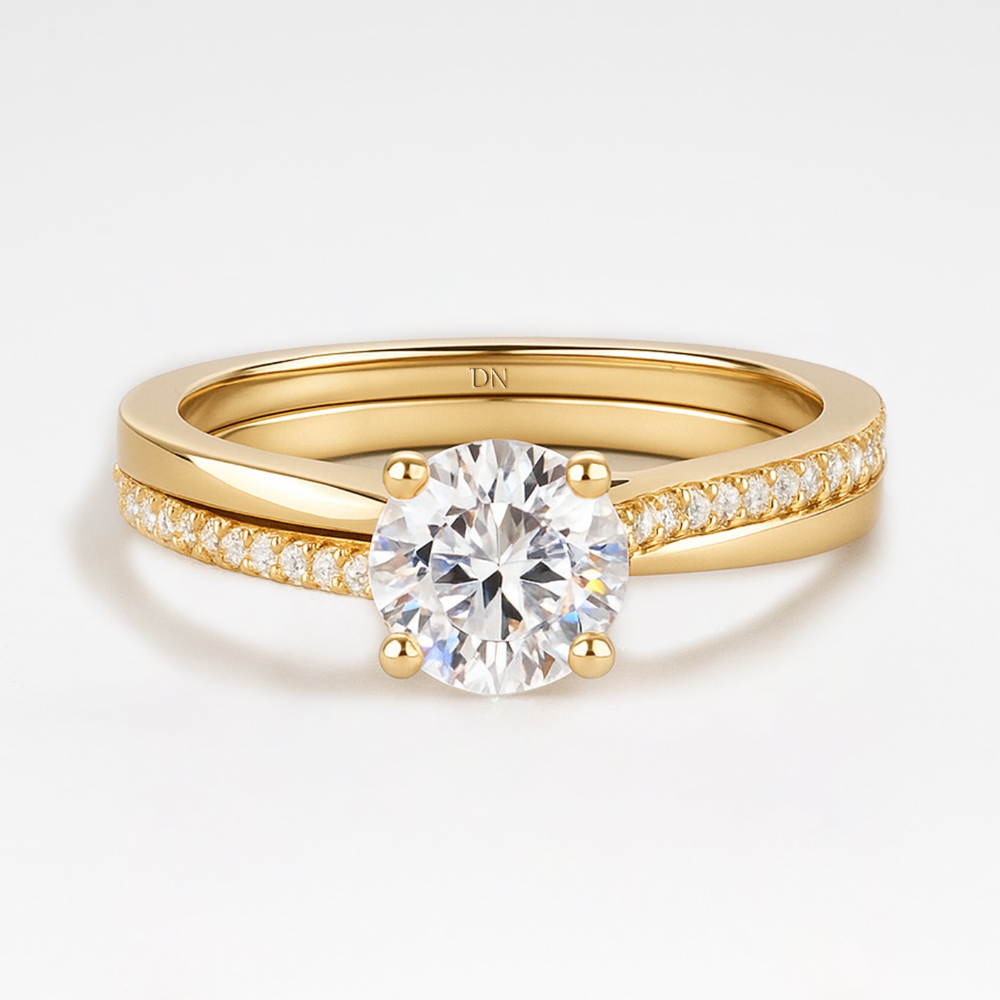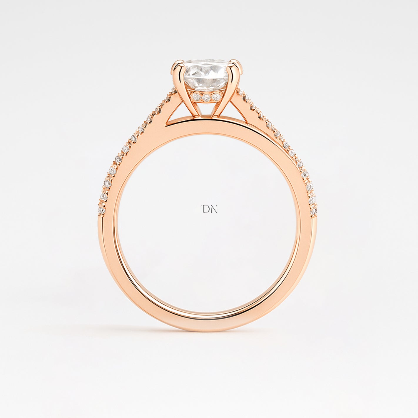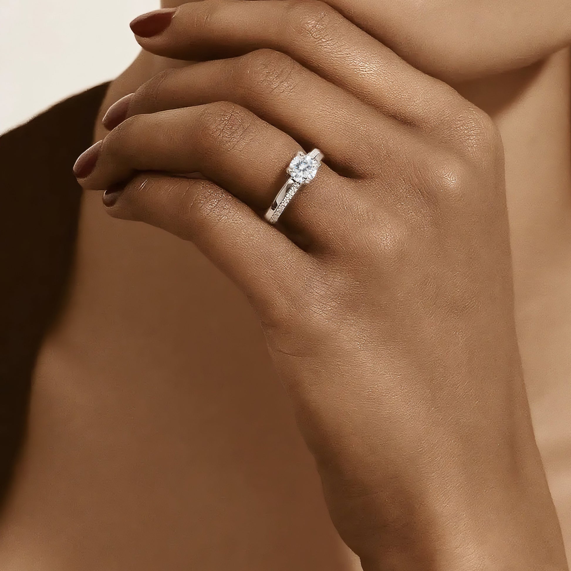 Elle Round Cut Dual-Band Platinum & Micropavé 4-Prong Lab Grown Diamond Solitaire Engagement Ring. The Elle ring redefines classic elegance with a contemporary twist. A brilliant round lab-grown diamond sits gracefully in a 4-prong platinum setting, elevated by a striking dual-band design. One band remains polished and minimal, while the other shimmers with delicate micropavé diamonds — creating a refined contrast of light and form. Sophisticated and unique, Elle is designed for those who value timeless beauty with a touch of modern artistry.