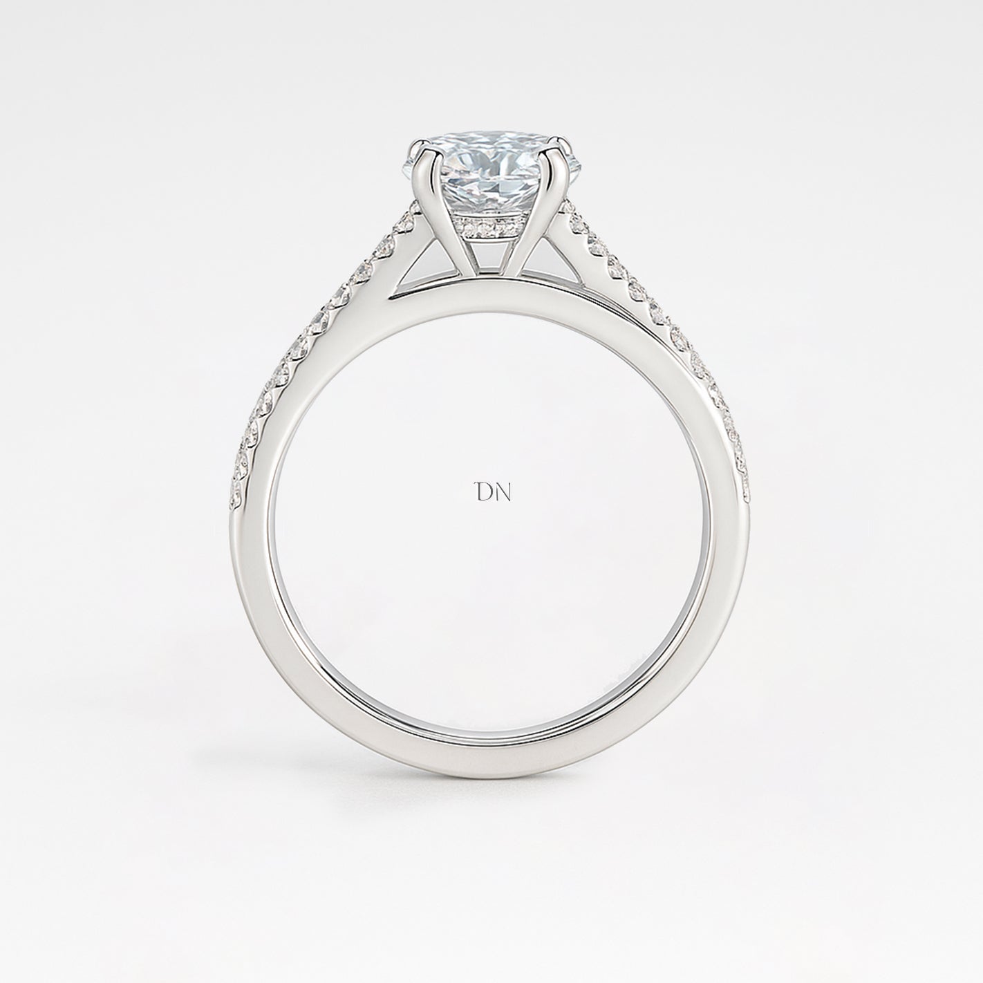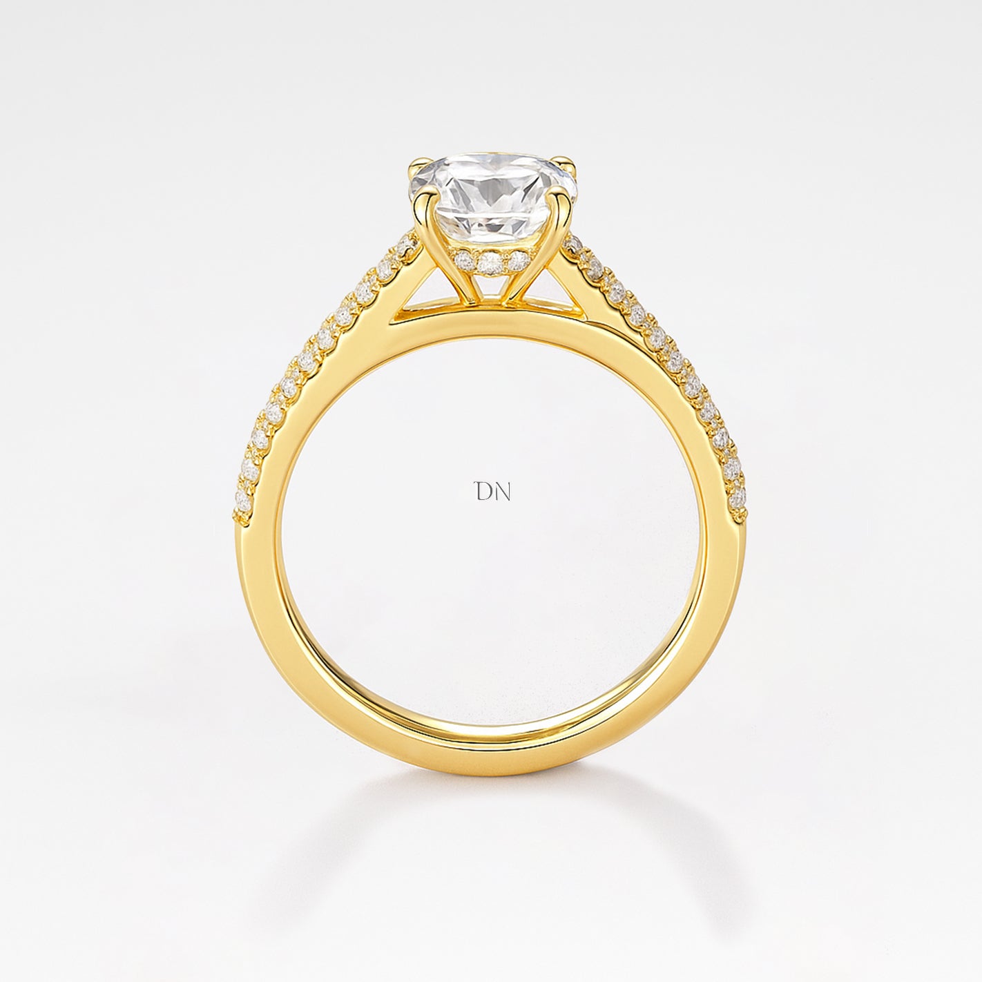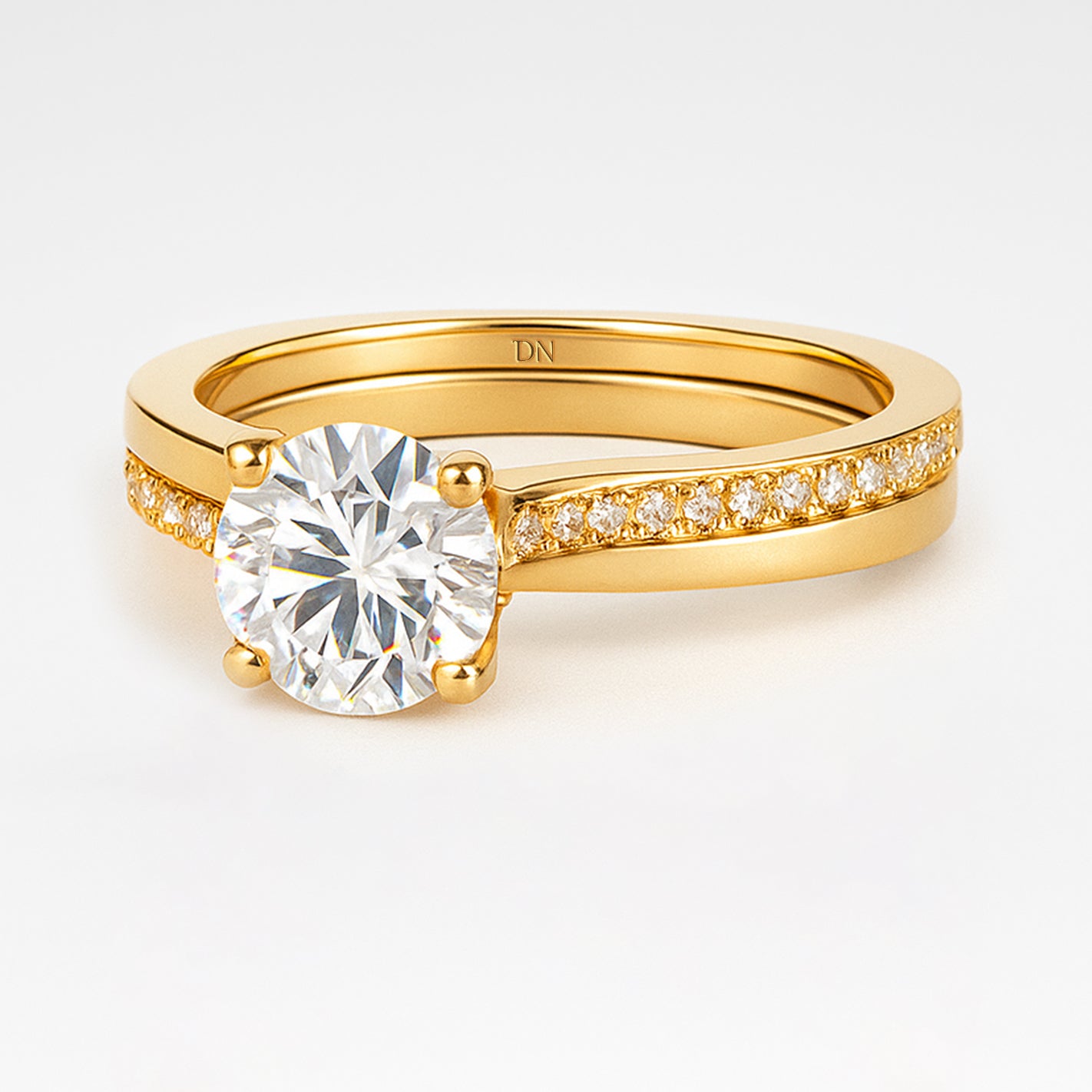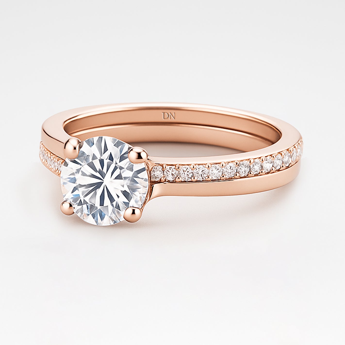 Elle Round Cut Dual-Band Platinum & Micropavé 4-Prong Lab Grown Diamond Solitaire Engagement Ring. The Elle ring redefines classic elegance with a contemporary twist. A brilliant round lab-grown diamond sits gracefully in a 4-prong platinum setting, elevated by a striking dual-band design. One band remains polished and minimal, while the other shimmers with delicate micropavé diamonds — creating a refined contrast of light and form. Sophisticated and unique, Elle is designed for those who value timeless beauty with a touch of modern artistry.