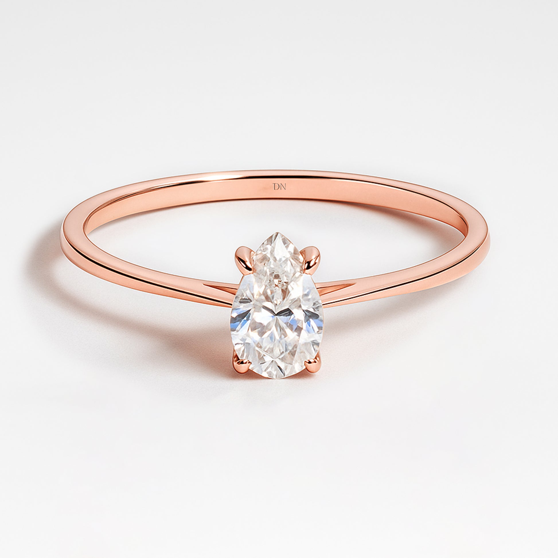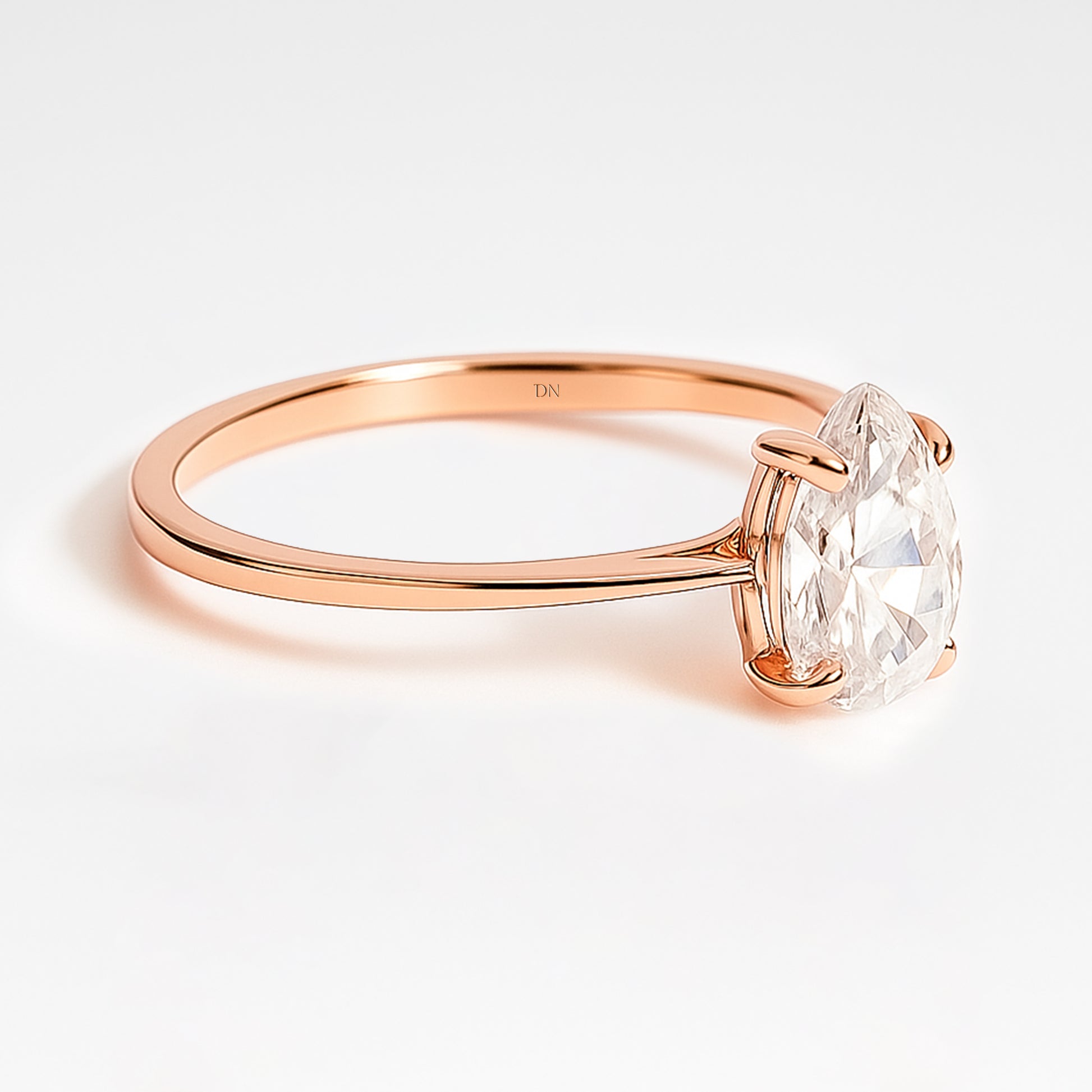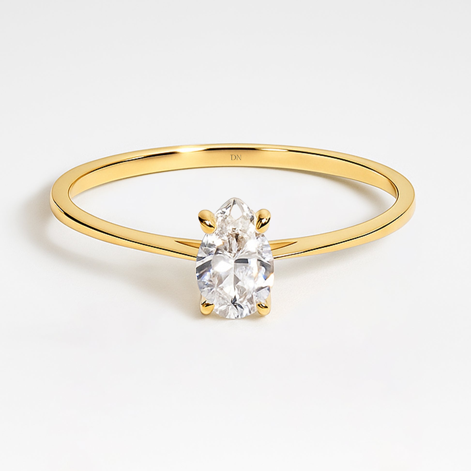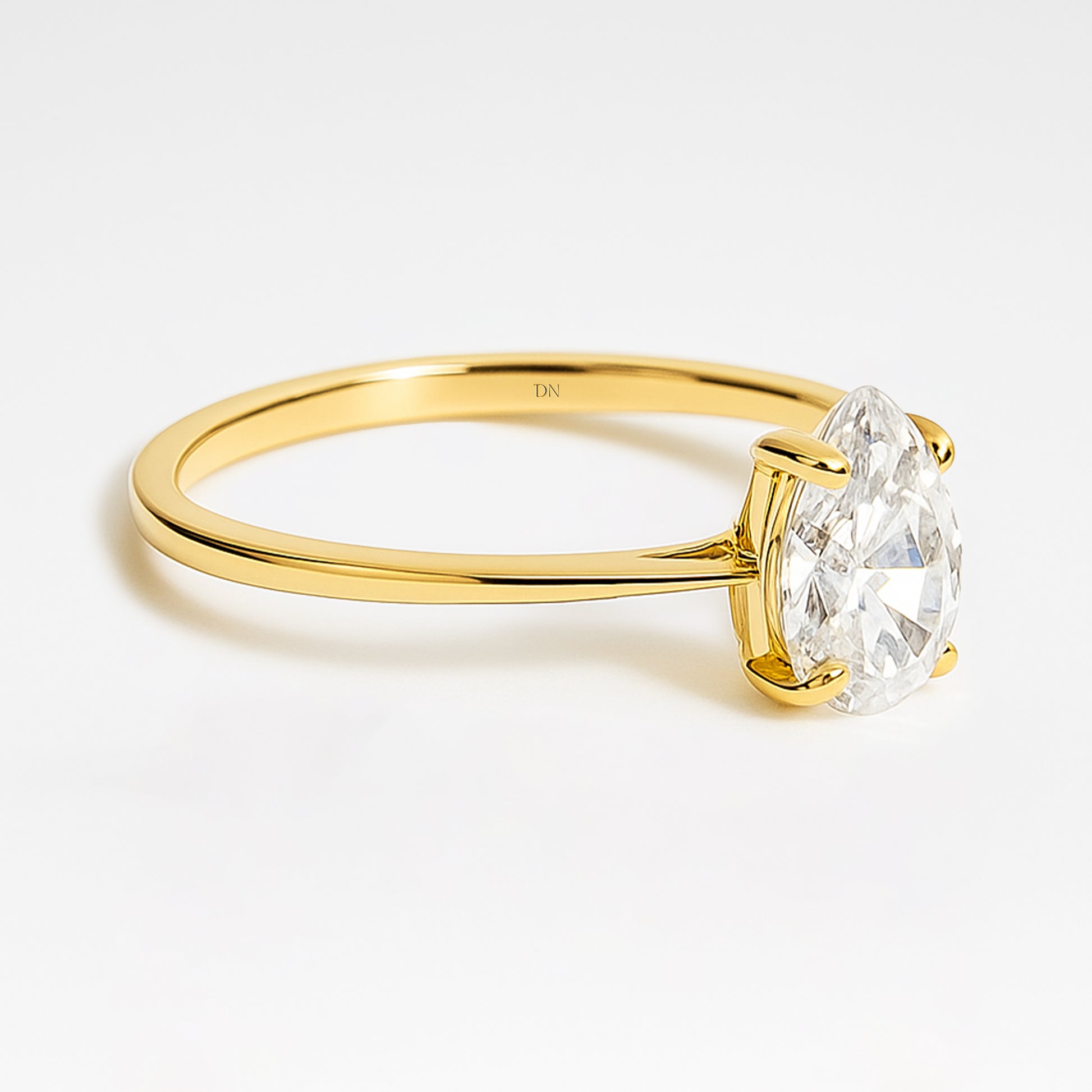 Everen Pear Cut Petite Solitaire Lab Grown Diamond Ring. Elegant and distinctive, the Everen ring features a pear cut lab grown diamond set on a slender band. Its soft teardrop shape adds a graceful touch, perfect for those who appreciate subtle beauty with a unique twist.