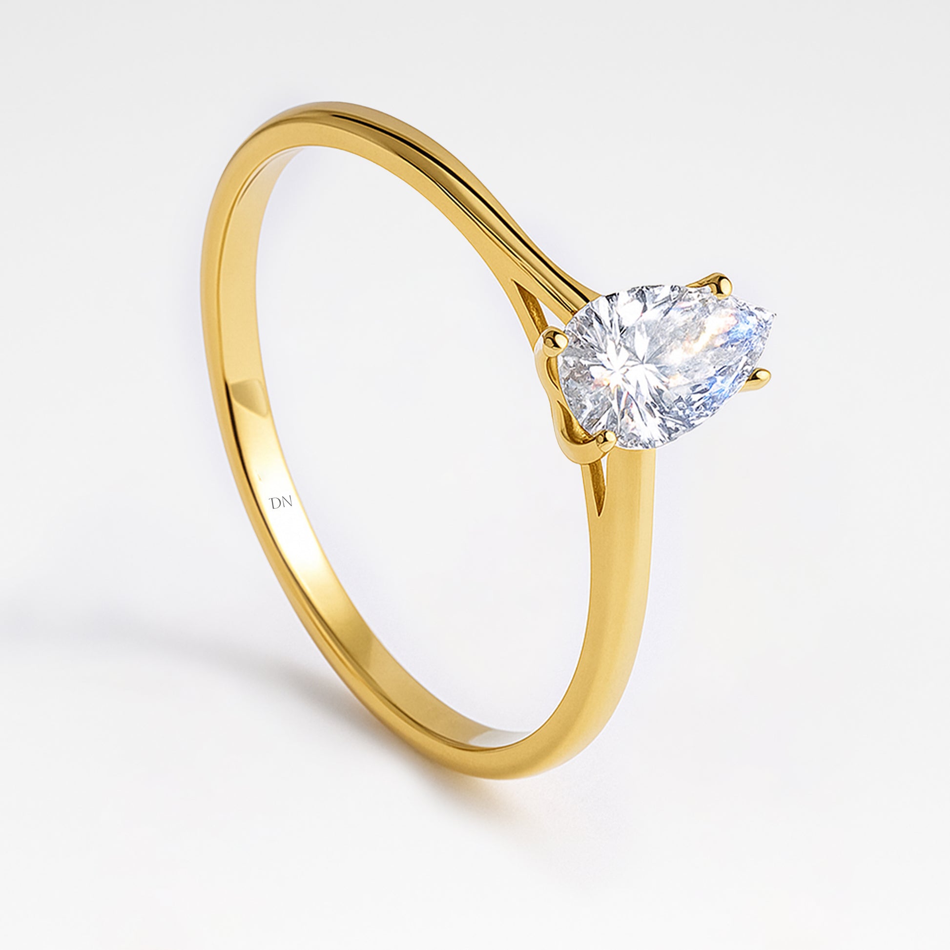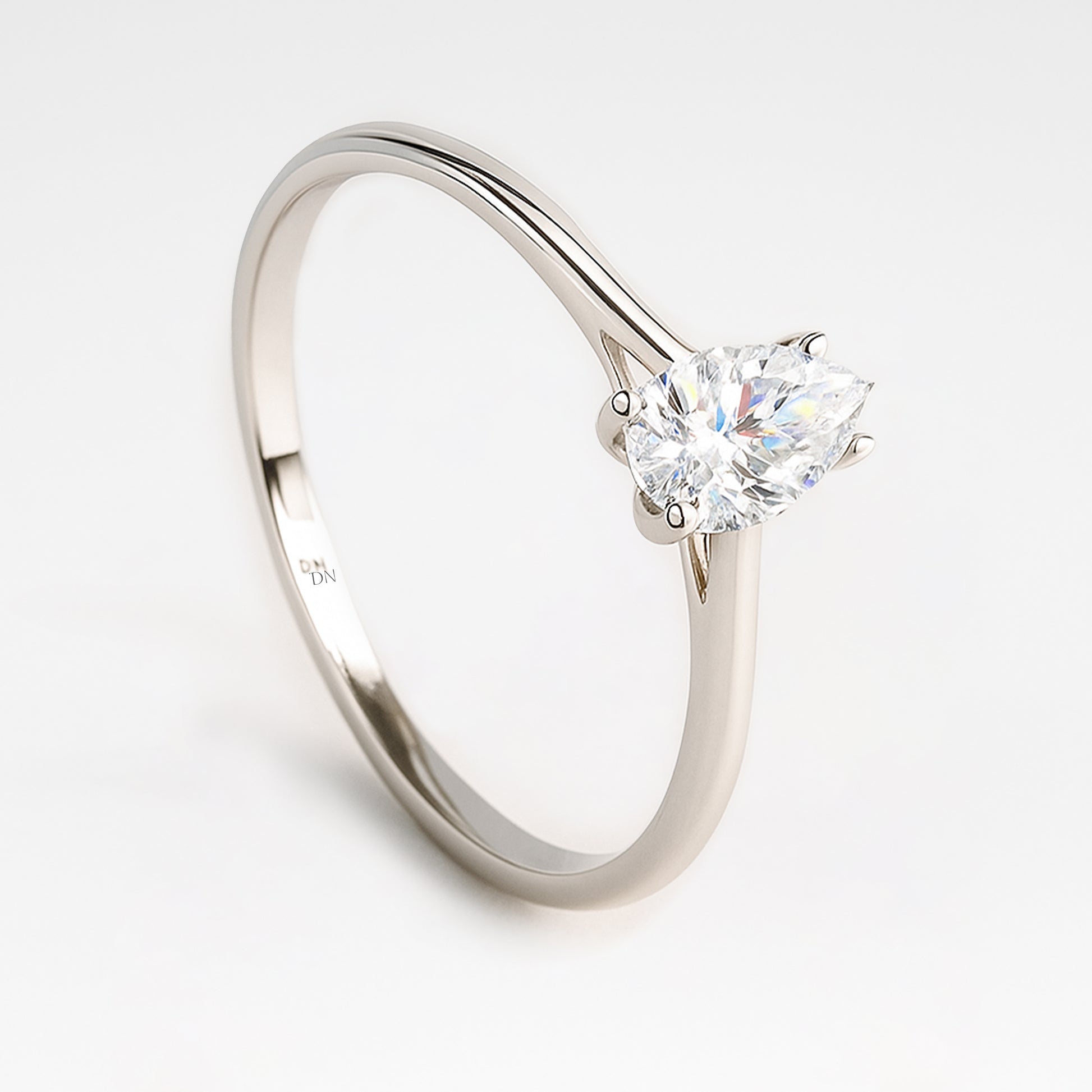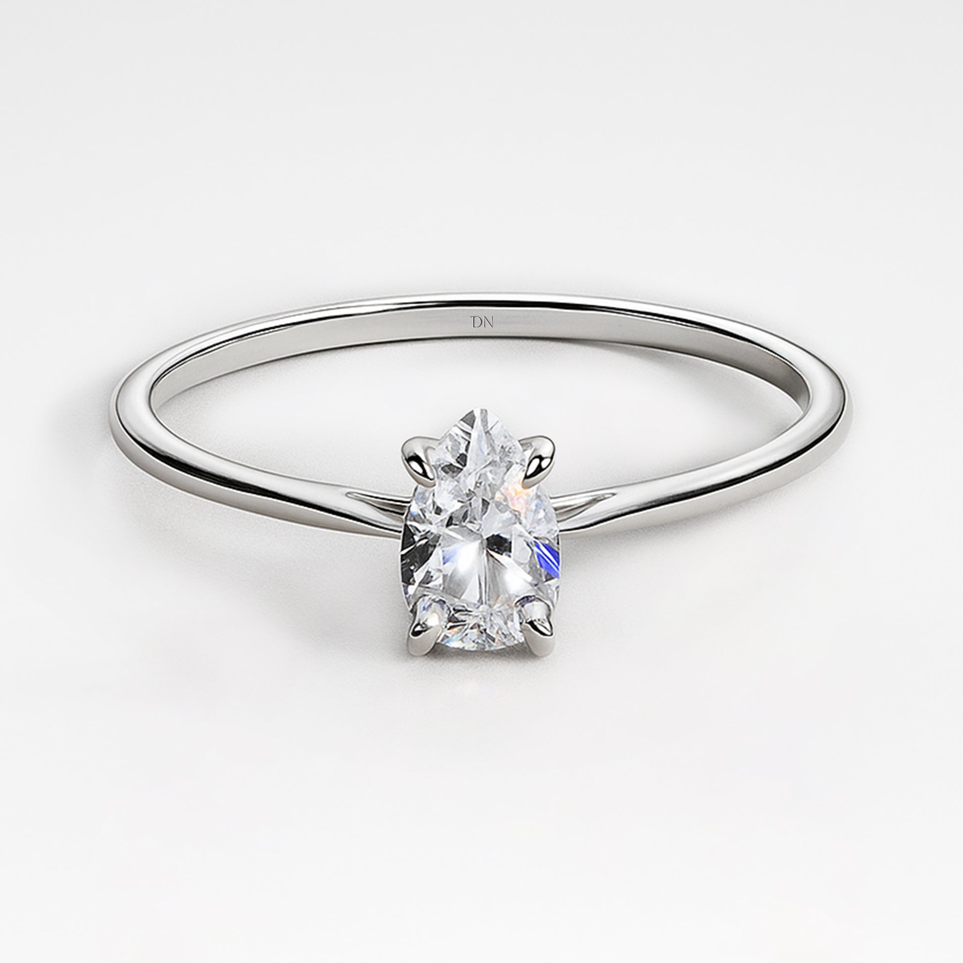 Everen Pear Cut Petite Solitaire Lab Grown Diamond Ring. Elegant and distinctive, the Everen ring features a pear cut lab grown diamond set on a slender band. Its soft teardrop shape adds a graceful touch, perfect for those who appreciate subtle beauty with a unique twist.