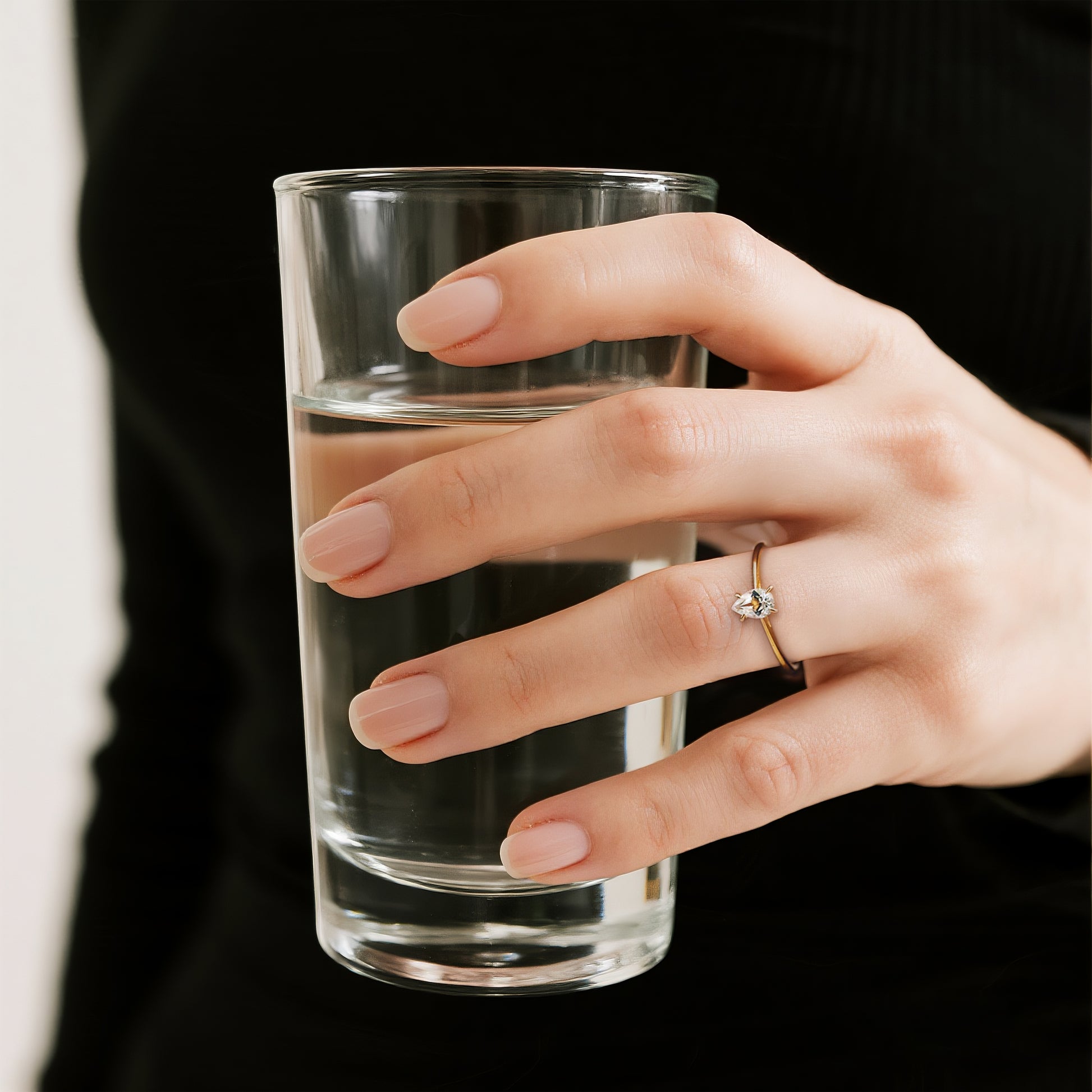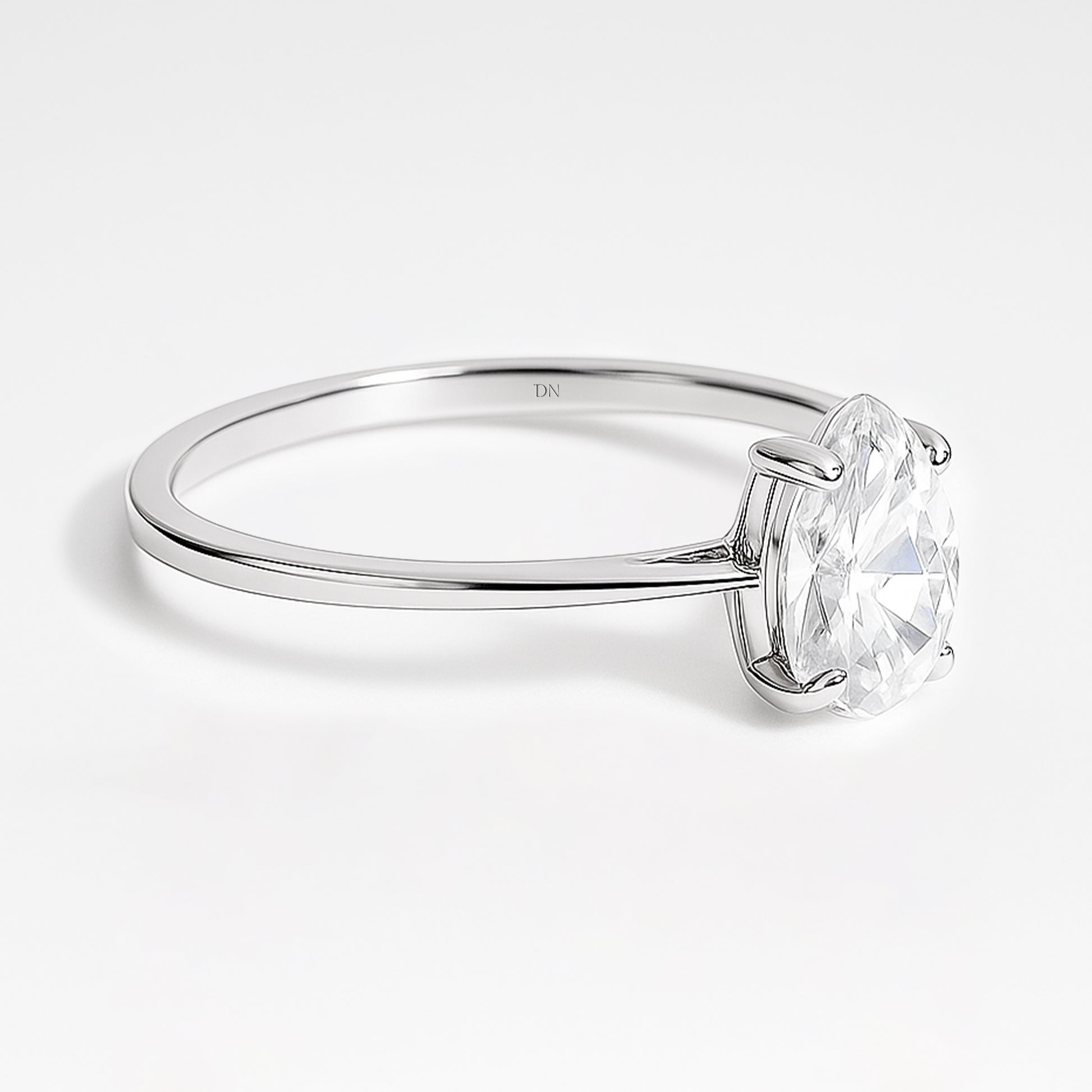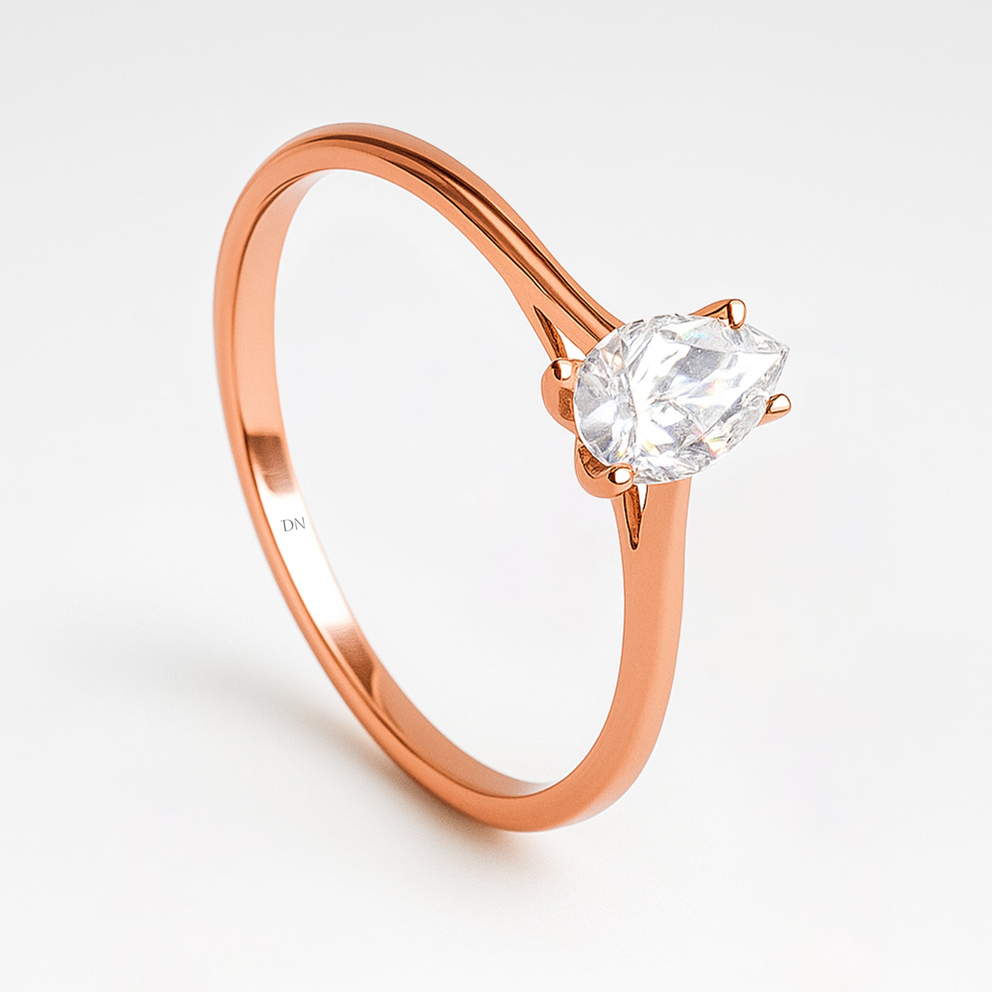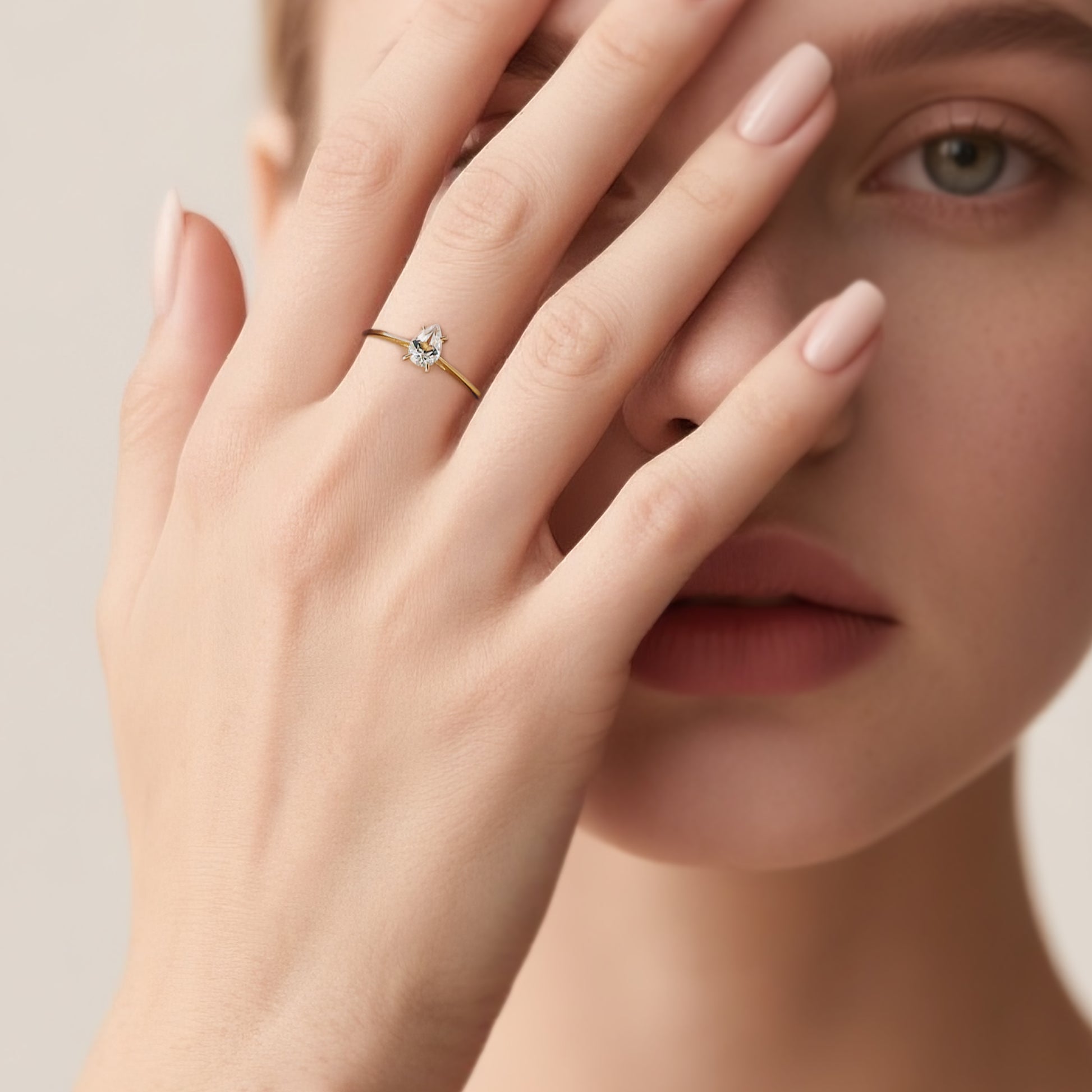 Everen Pear Cut Petite Solitaire Lab Grown Diamond Ring. Elegant and distinctive, the Everen ring features a pear cut lab grown diamond set on a slender band. Its soft teardrop shape adds a graceful touch, perfect for those who appreciate subtle beauty with a unique twist.
