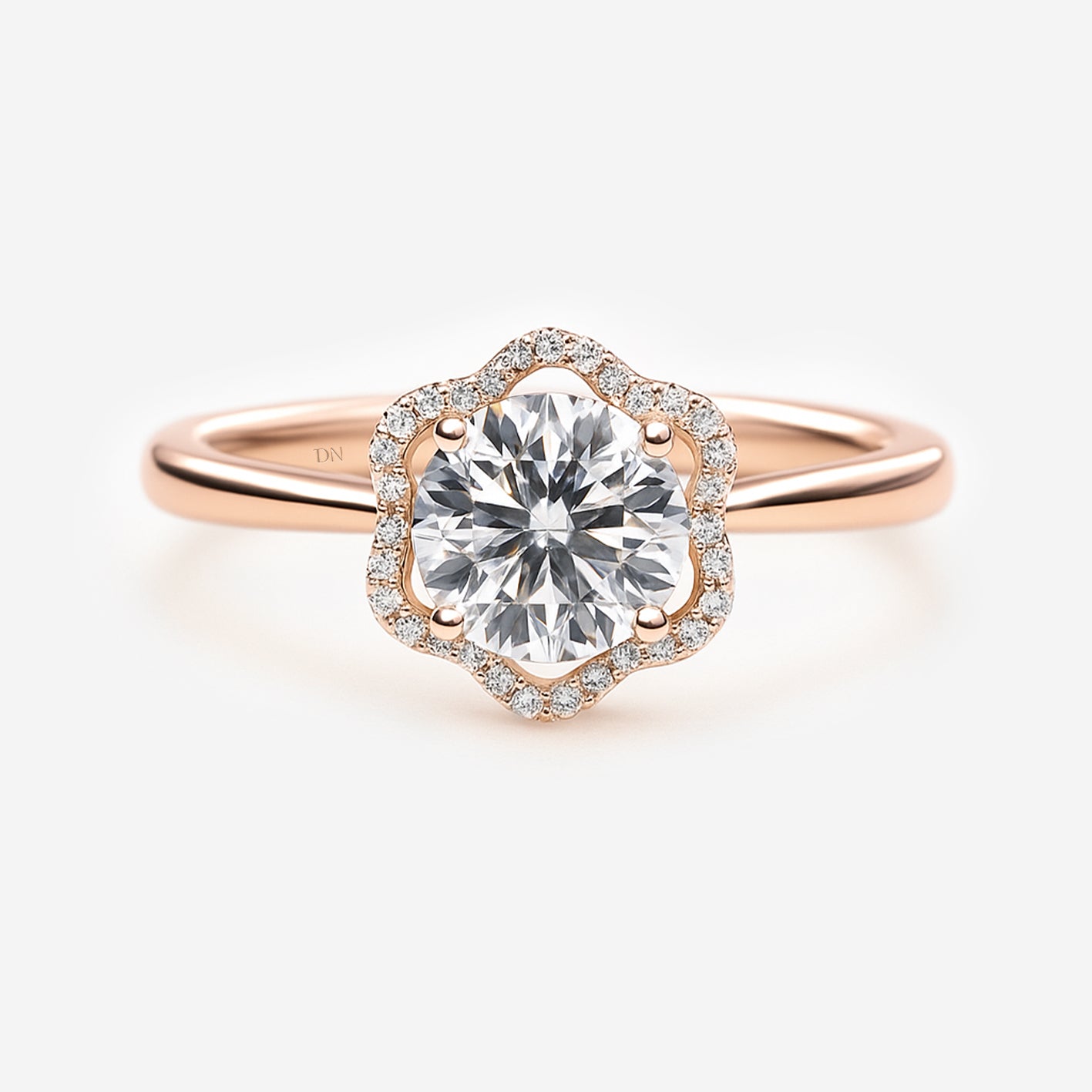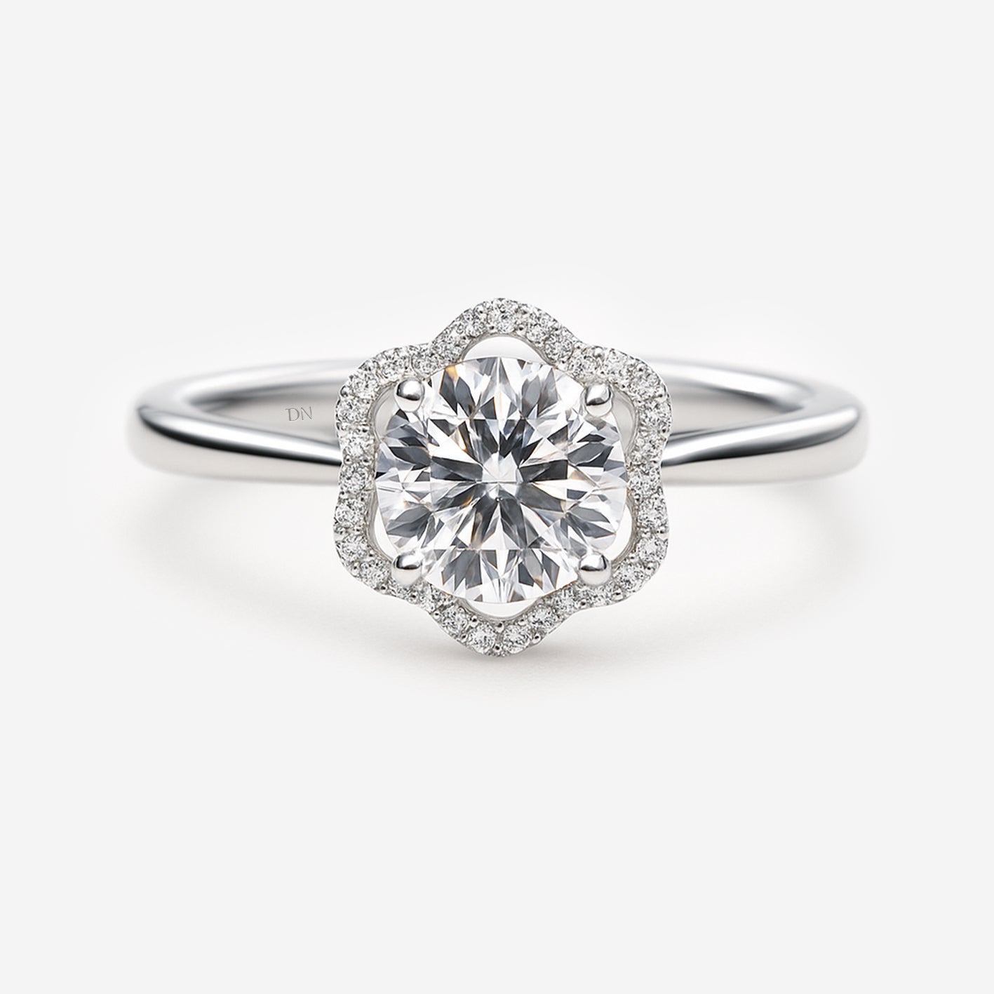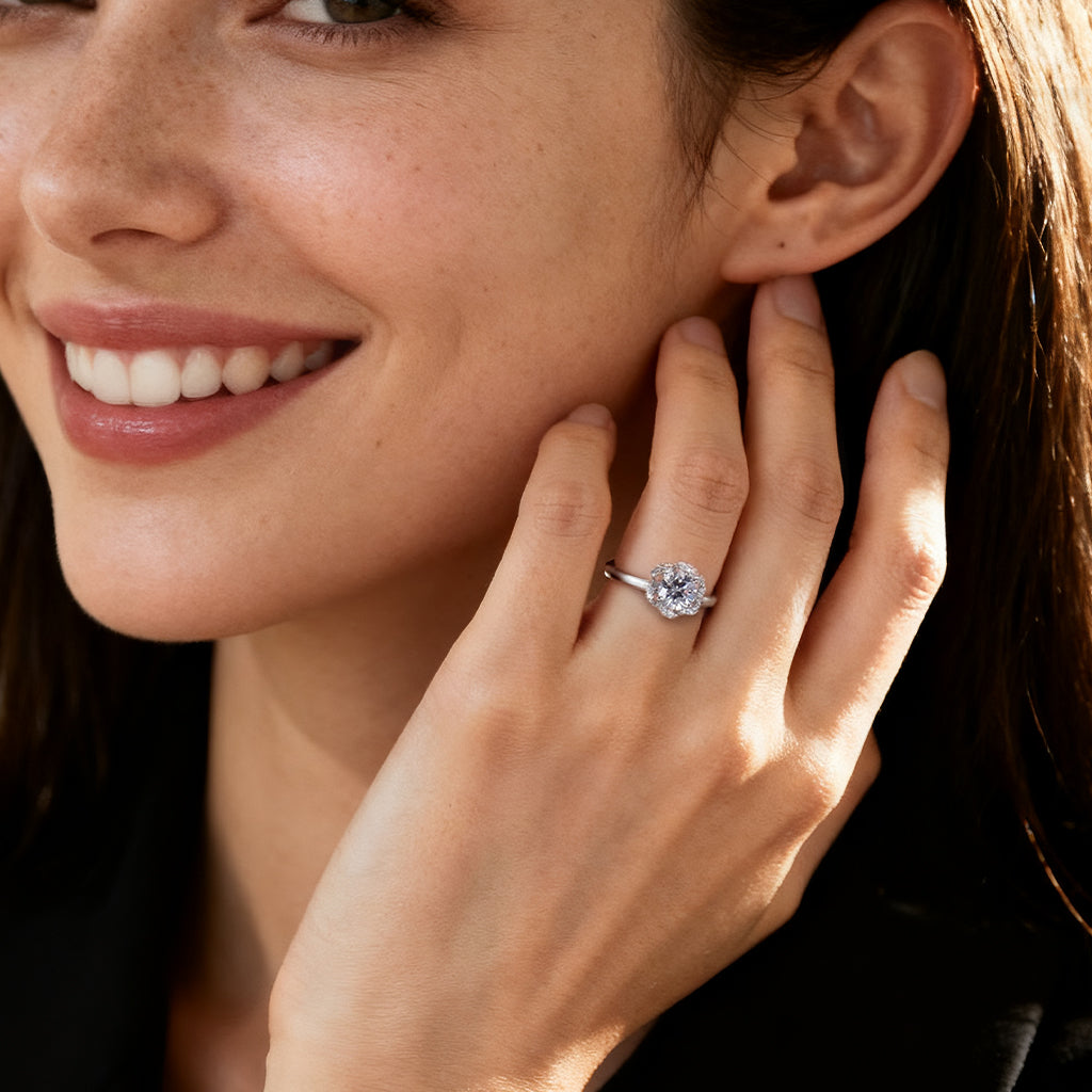 Florin draws inspiration from nature’s elegance, featuring a round center diamond encircled by a halo shaped like delicate petals. The floral silhouette enhances sparkle while softening the geometry, creating a design that feels graceful and romantic. Set on a slender band, Florin is a refined expression of beauty with a touch of organic charm.