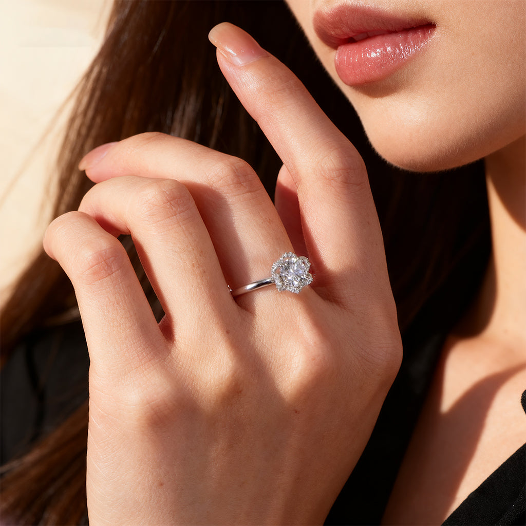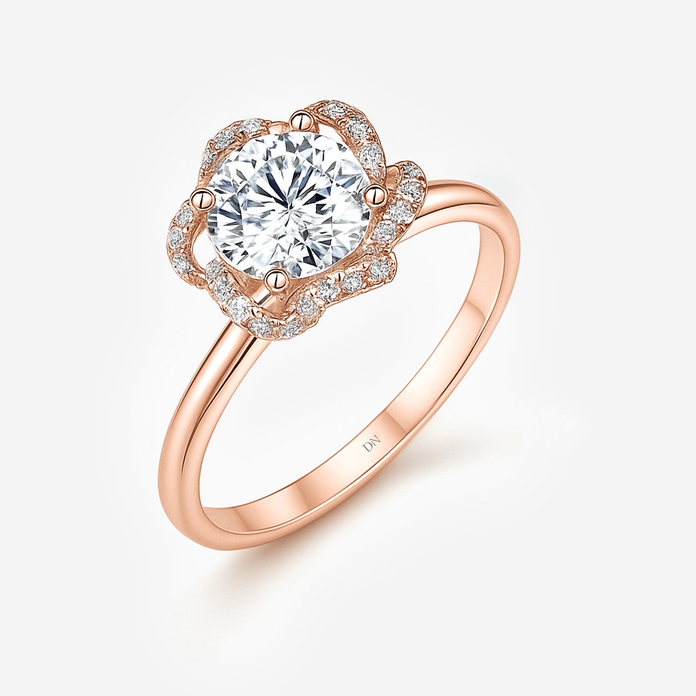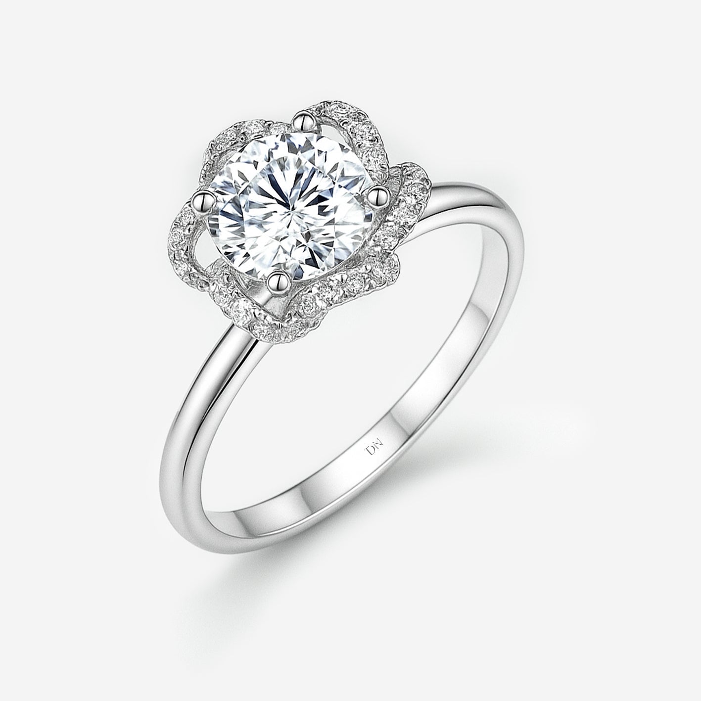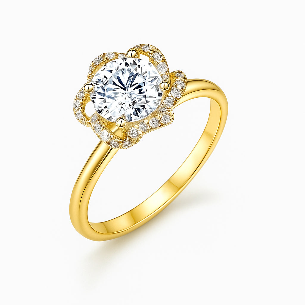 Florin draws inspiration from nature’s elegance, featuring a round center diamond encircled by a halo shaped like delicate petals. The floral silhouette enhances sparkle while softening the geometry, creating a design that feels graceful and romantic. Set on a slender band, Florin is a refined expression of beauty with a touch of organic charm.