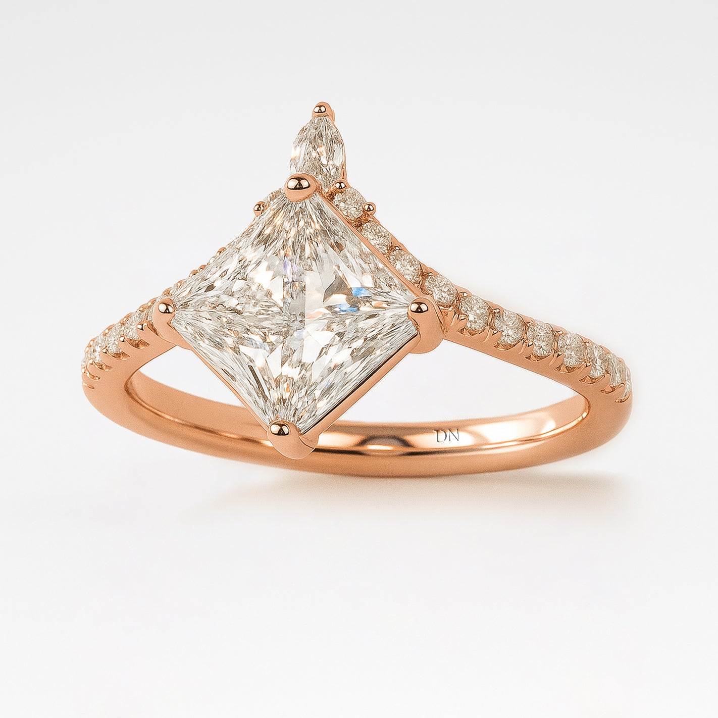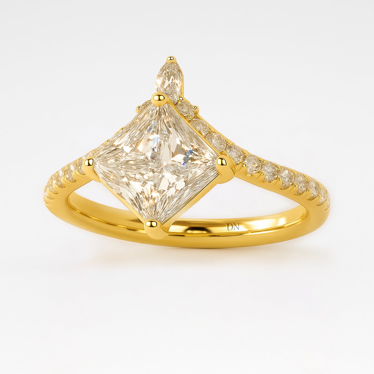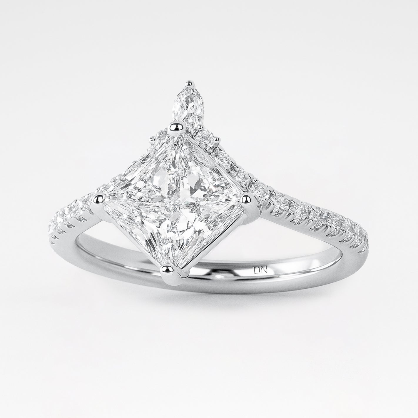 Janice Princess Cut Lab Grown Diamond Chevron Engagement Ring with Side Accents. Strikingly structured yet effortlessly elegant, the Janice ring features a crisp princess-cut lab-grown diamond set atop a graceful chevron-shaped band. Delicate side stones accent the angled silhouette, adding sparkle and visual intrigue. With its bold lines and modern geometry, Janice is a confident expression of individuality and refined romance.