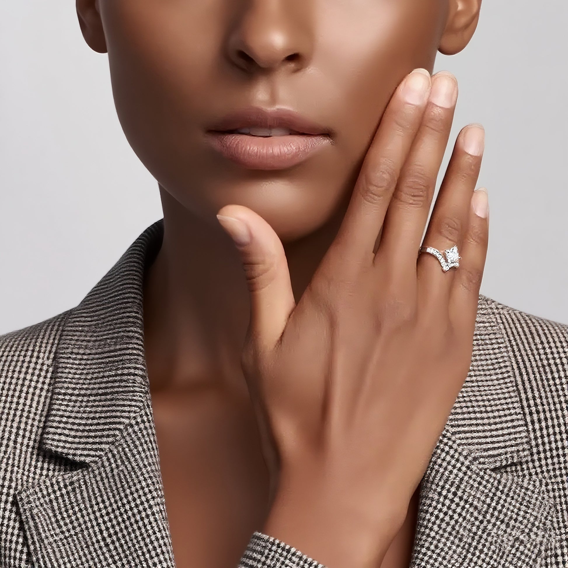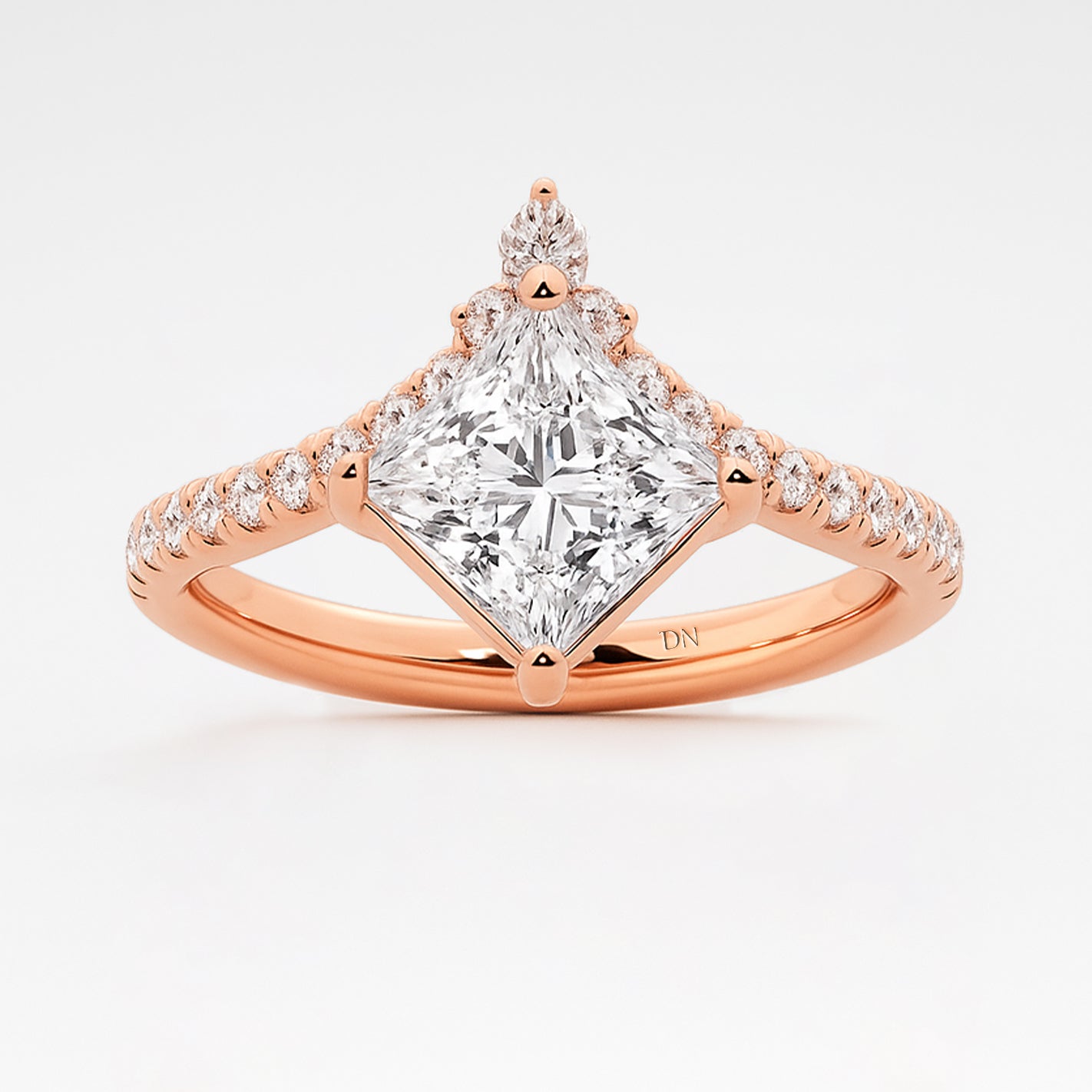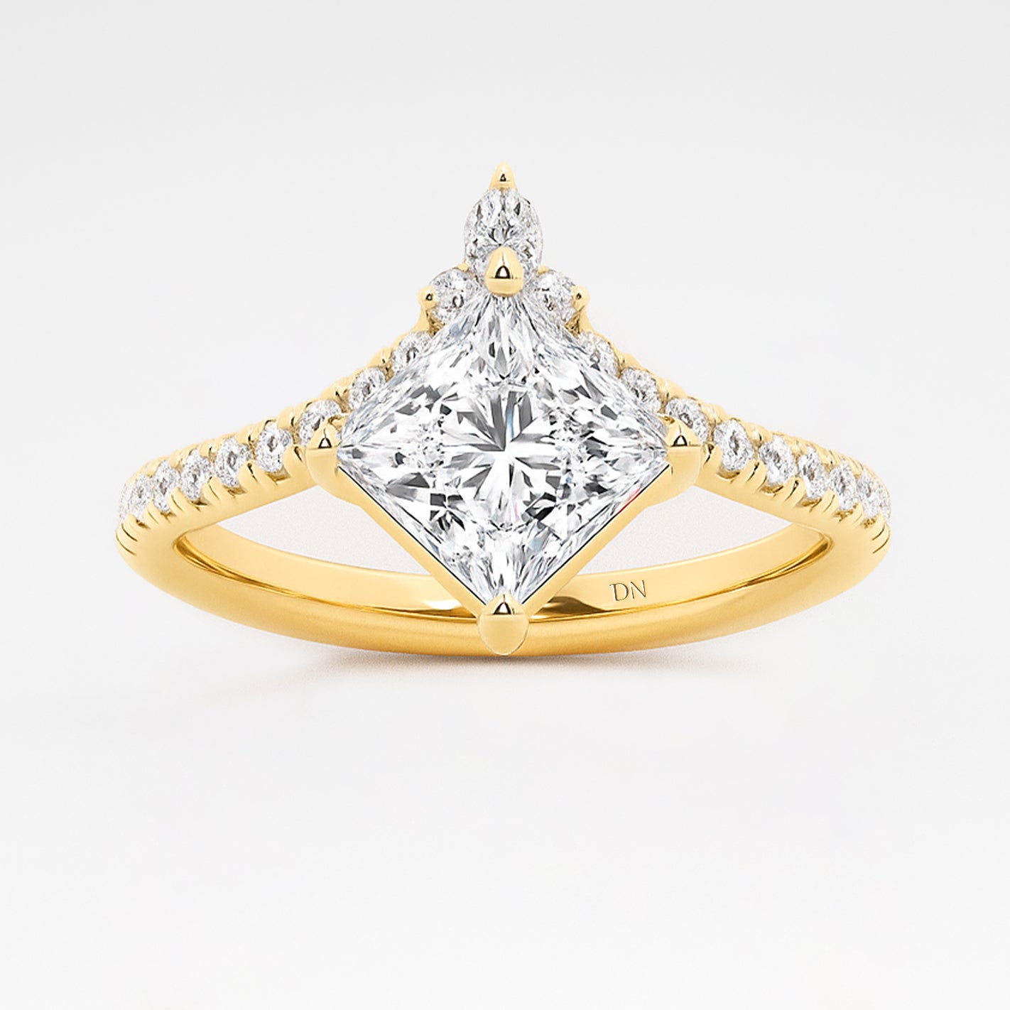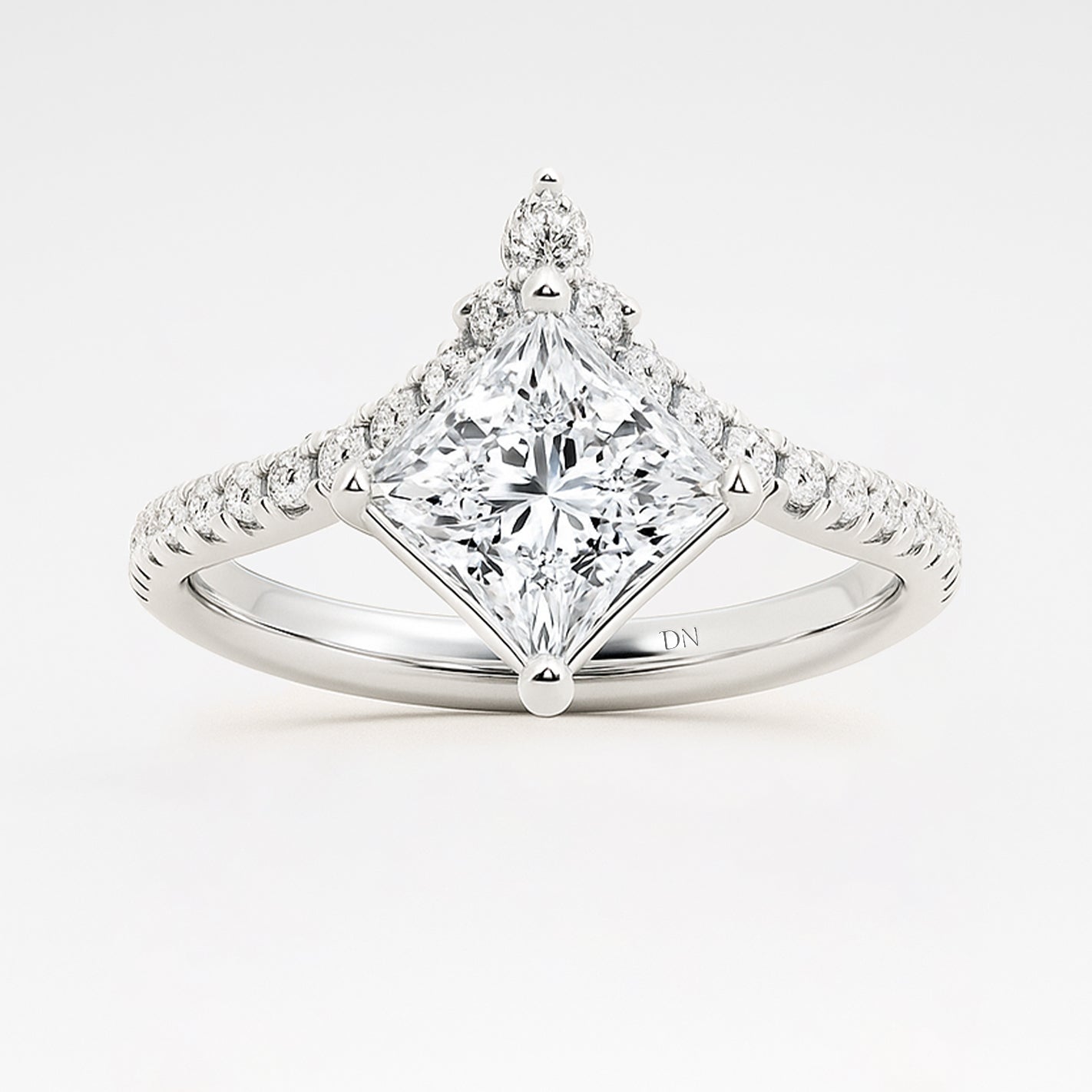 Janice Princess Cut Lab Grown Diamond Chevron Engagement Ring with Side Accents. Strikingly structured yet effortlessly elegant, the Janice ring features a crisp princess-cut lab-grown diamond set atop a graceful chevron-shaped band. Delicate side stones accent the angled silhouette, adding sparkle and visual intrigue. With its bold lines and modern geometry, Janice is a confident expression of individuality and refined romance.