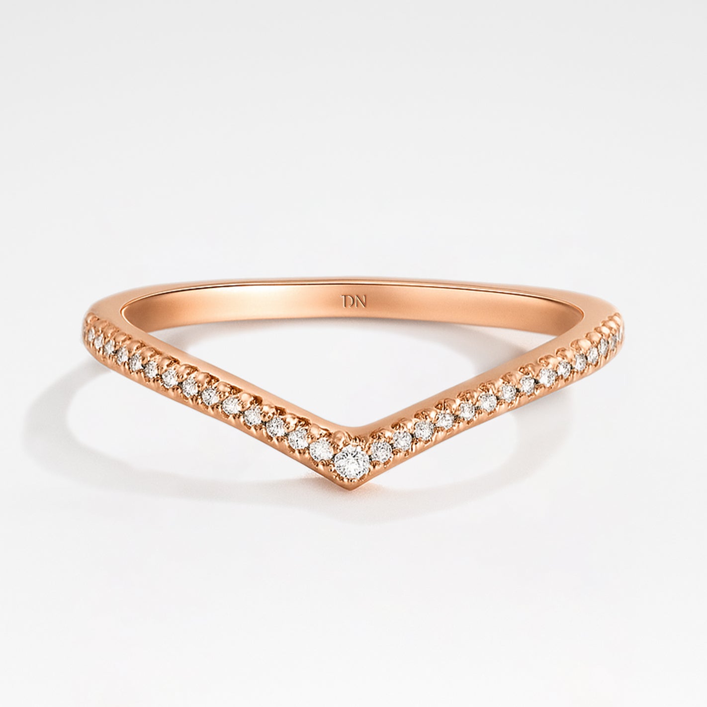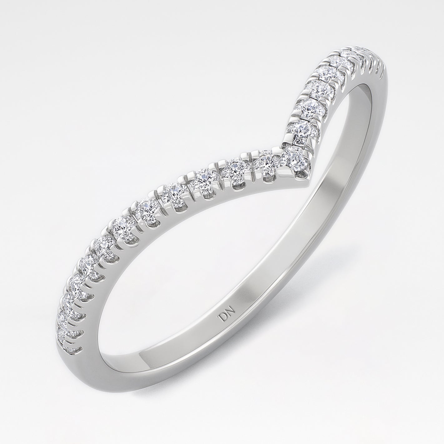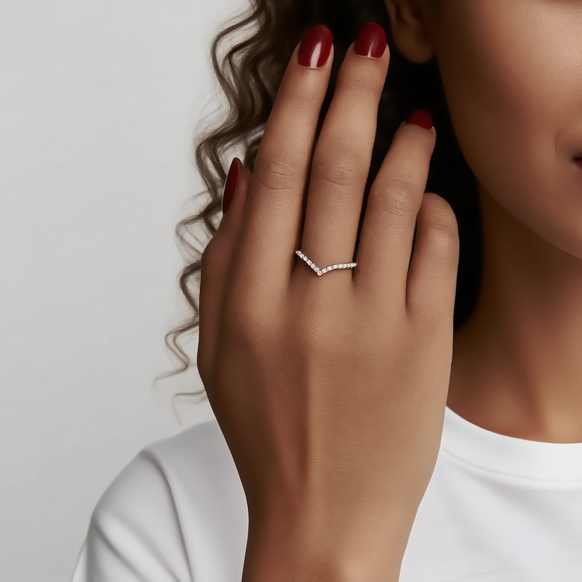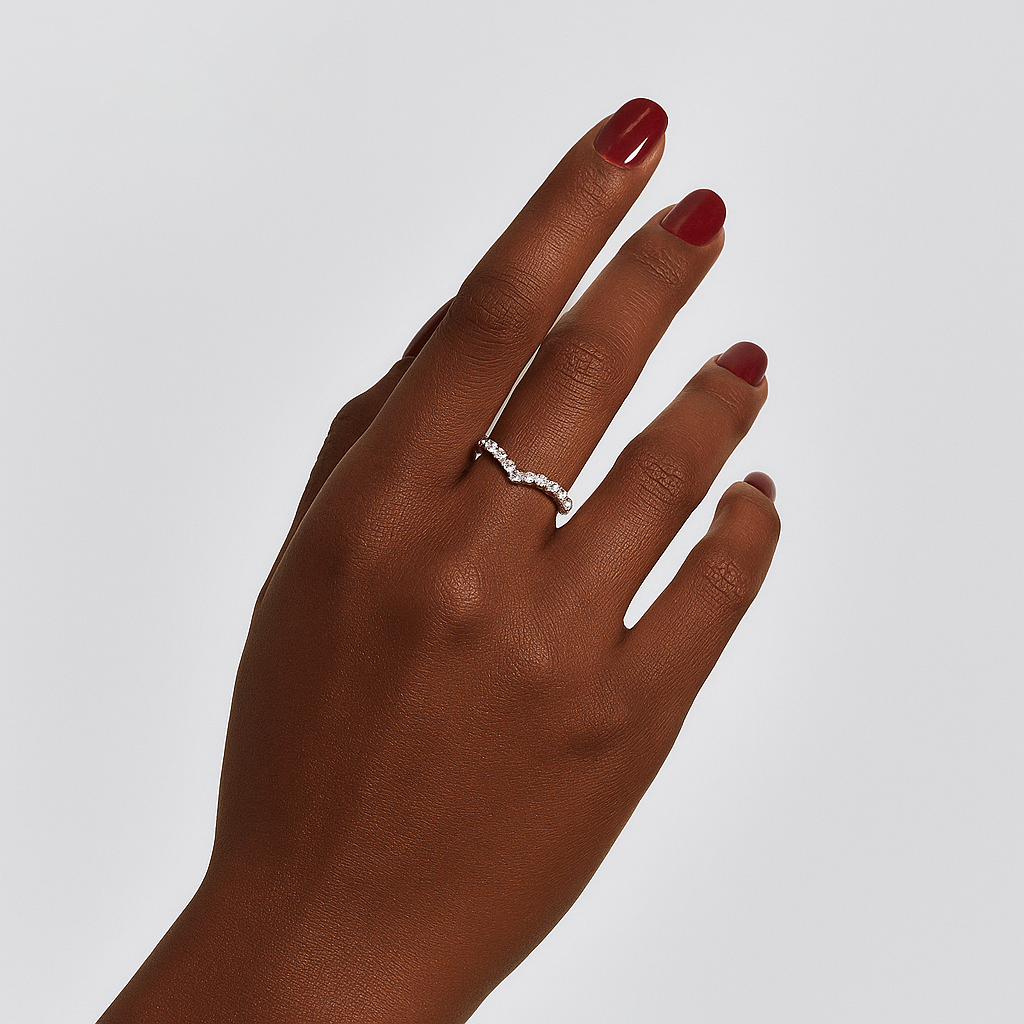 Liora Thin Pavé Lab Grown Diamond Eternity Band with Curve. Delicate with a hint of sparkle, the Liora band features a slender curved silhouette lined with lab-grown pavé diamonds. Designed to gently contour around an engagement ring or shine on its own, this eternity band adds a soft, graceful accent to any stack. Understated yet luminous, Liora is the perfect blend of subtle charm and modern elegance.