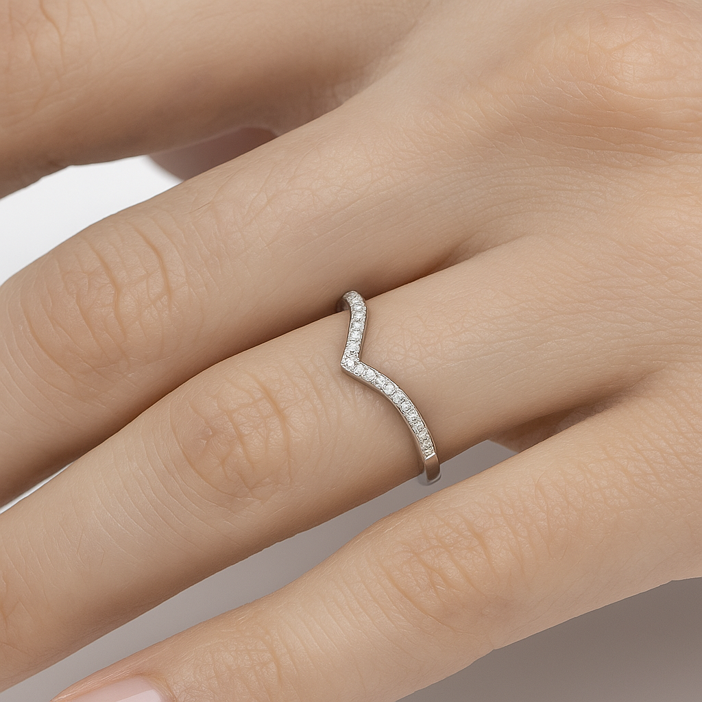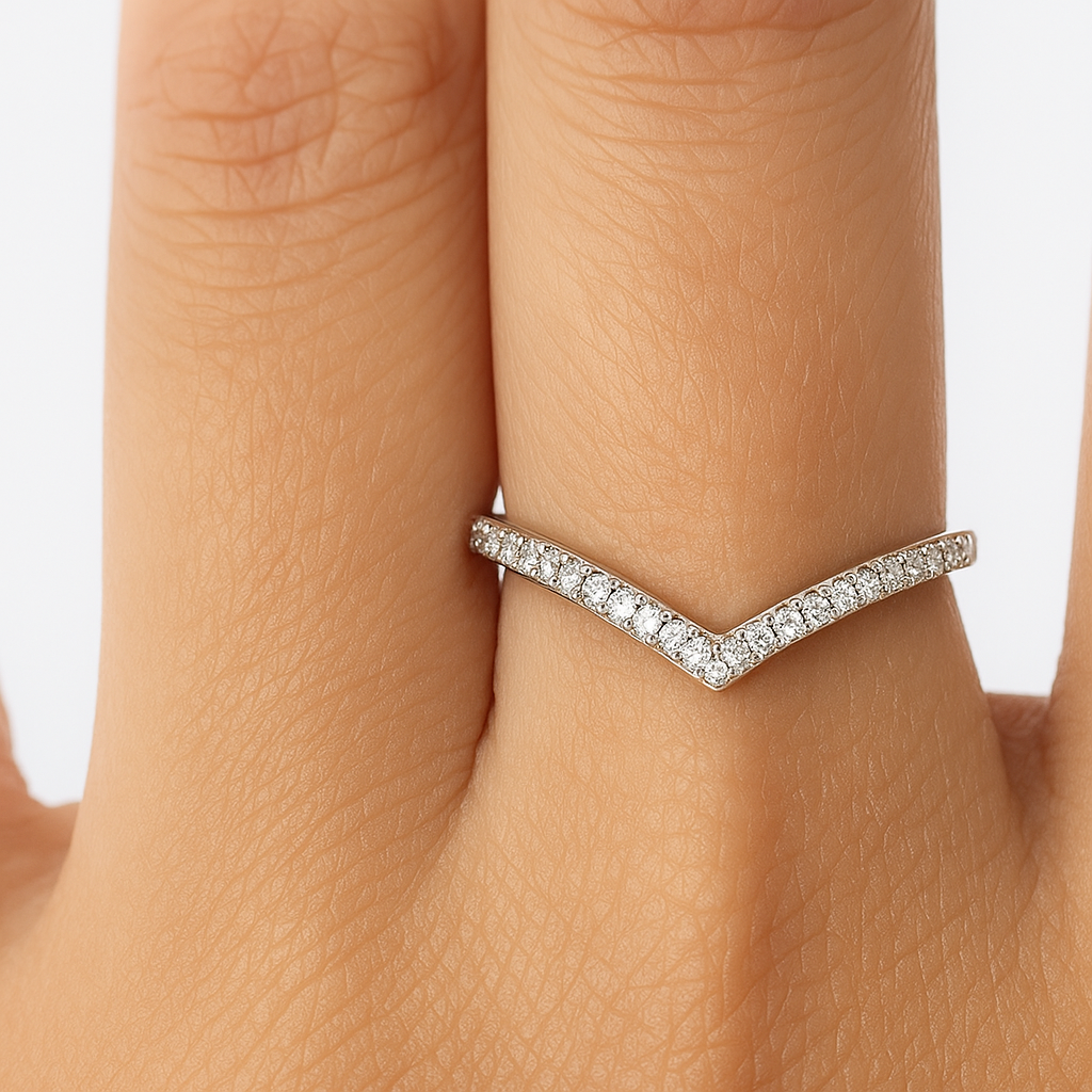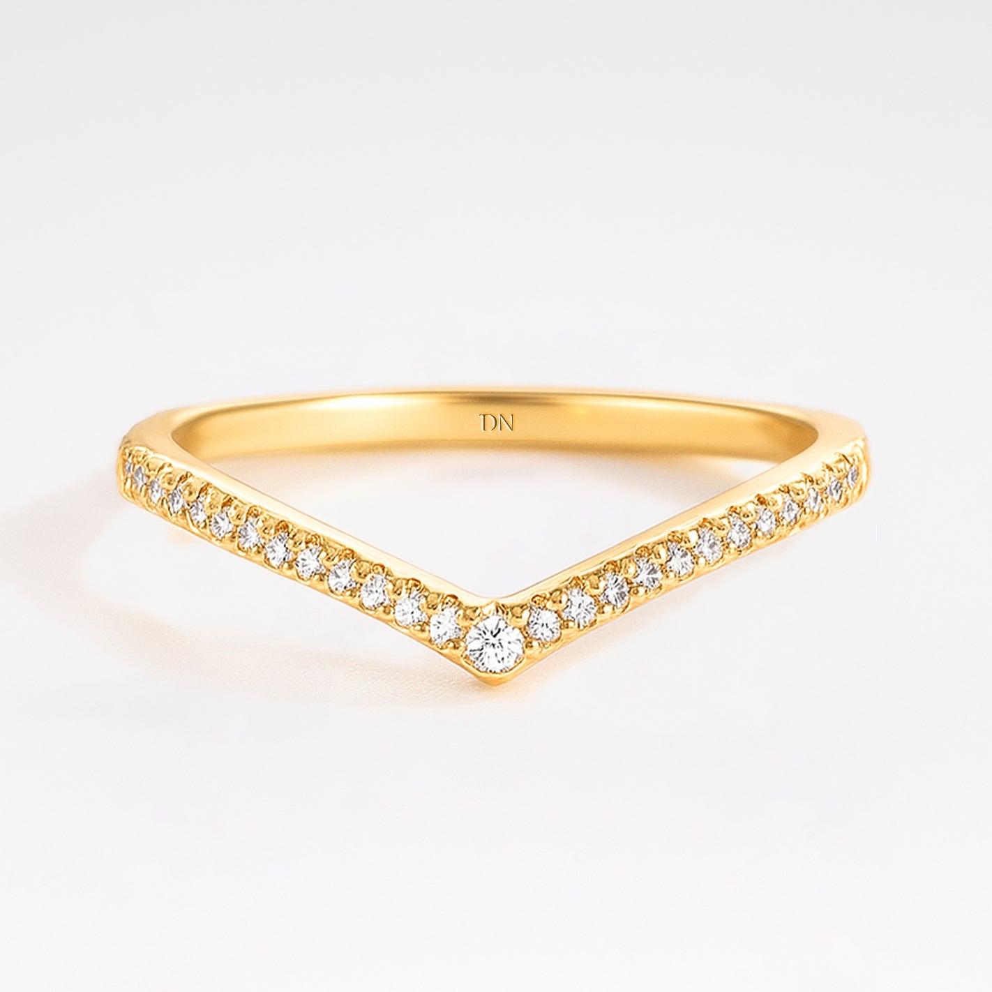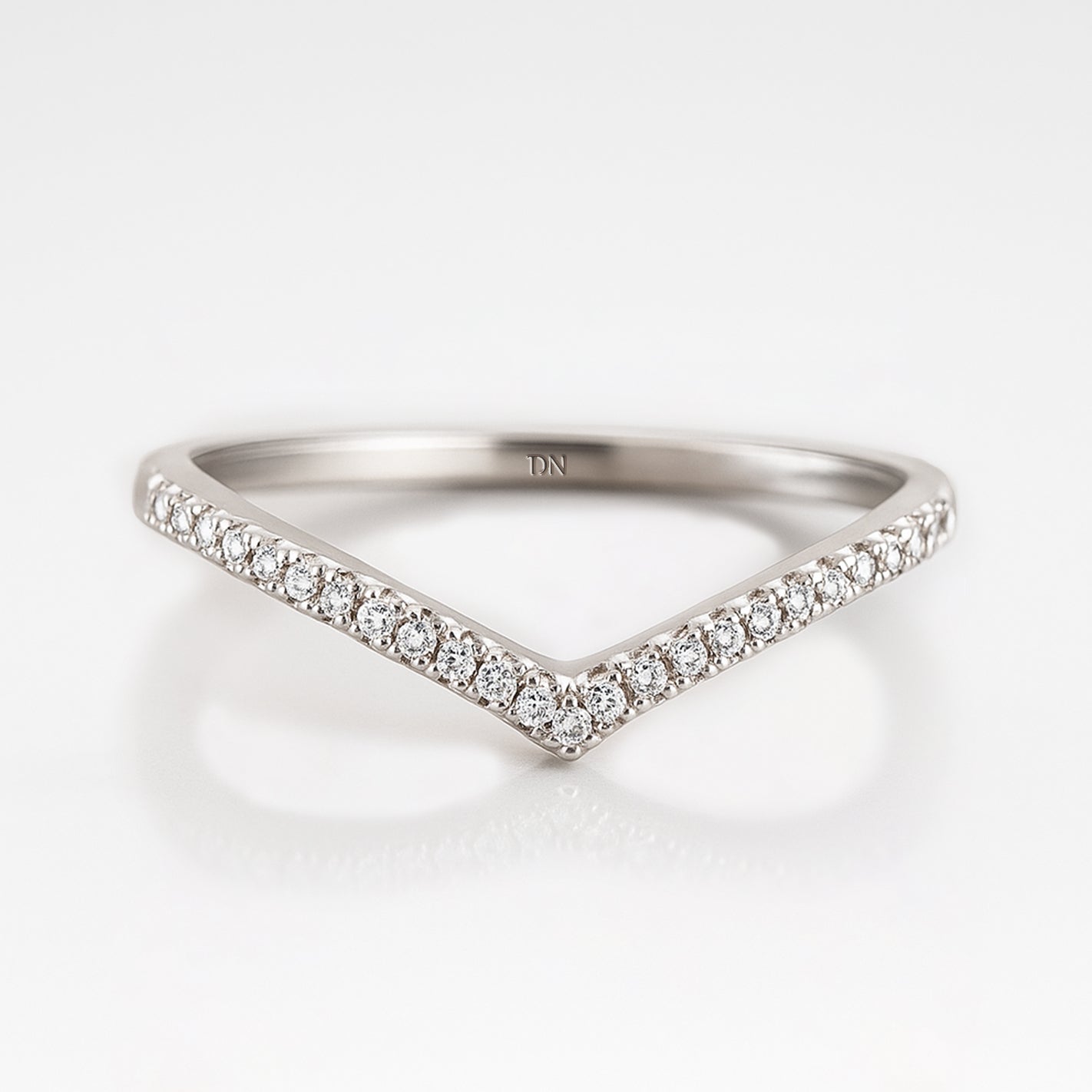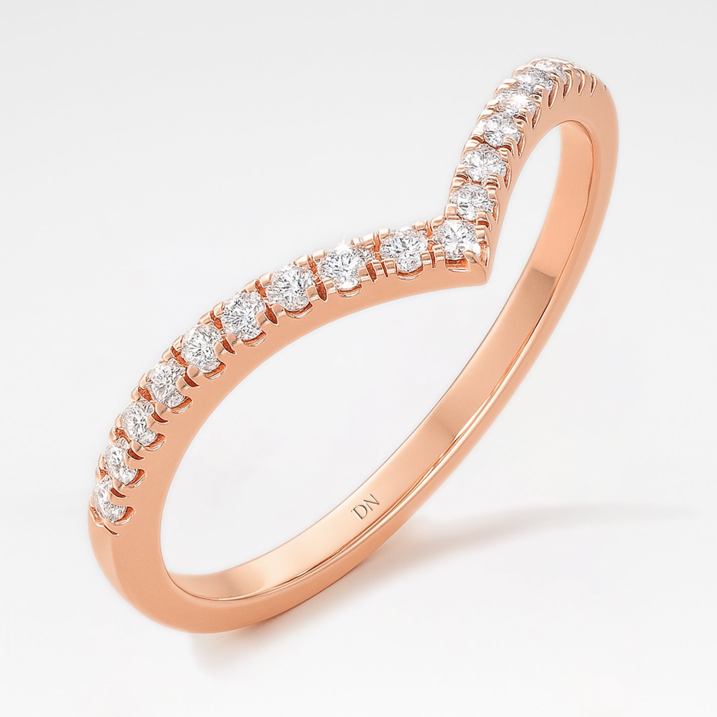 Liora Thin Pavé Lab Grown Diamond Eternity Band with Curve. Delicate with a hint of sparkle, the Liora band features a slender curved silhouette lined with lab-grown pavé diamonds. Designed to gently contour around an engagement ring or shine on its own, this eternity band adds a soft, graceful accent to any stack. Understated yet luminous, Liora is the perfect blend of subtle charm and modern elegance.