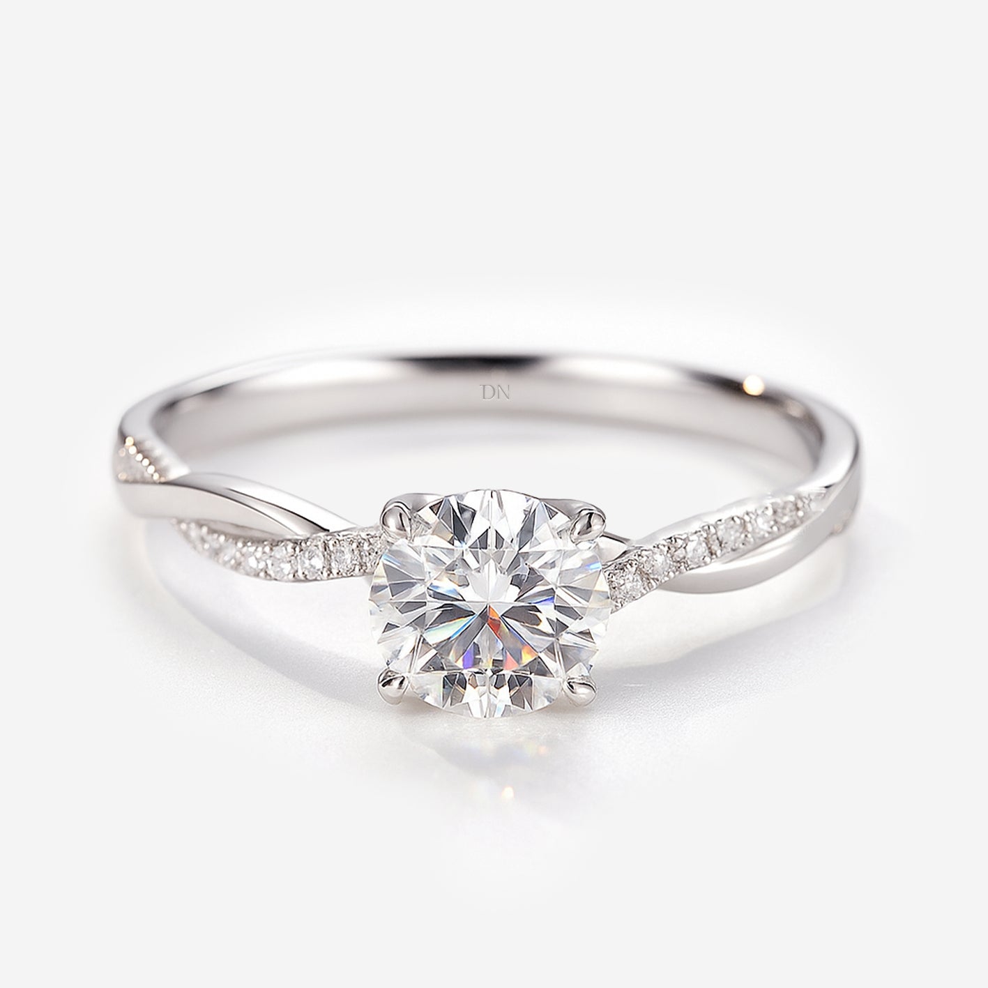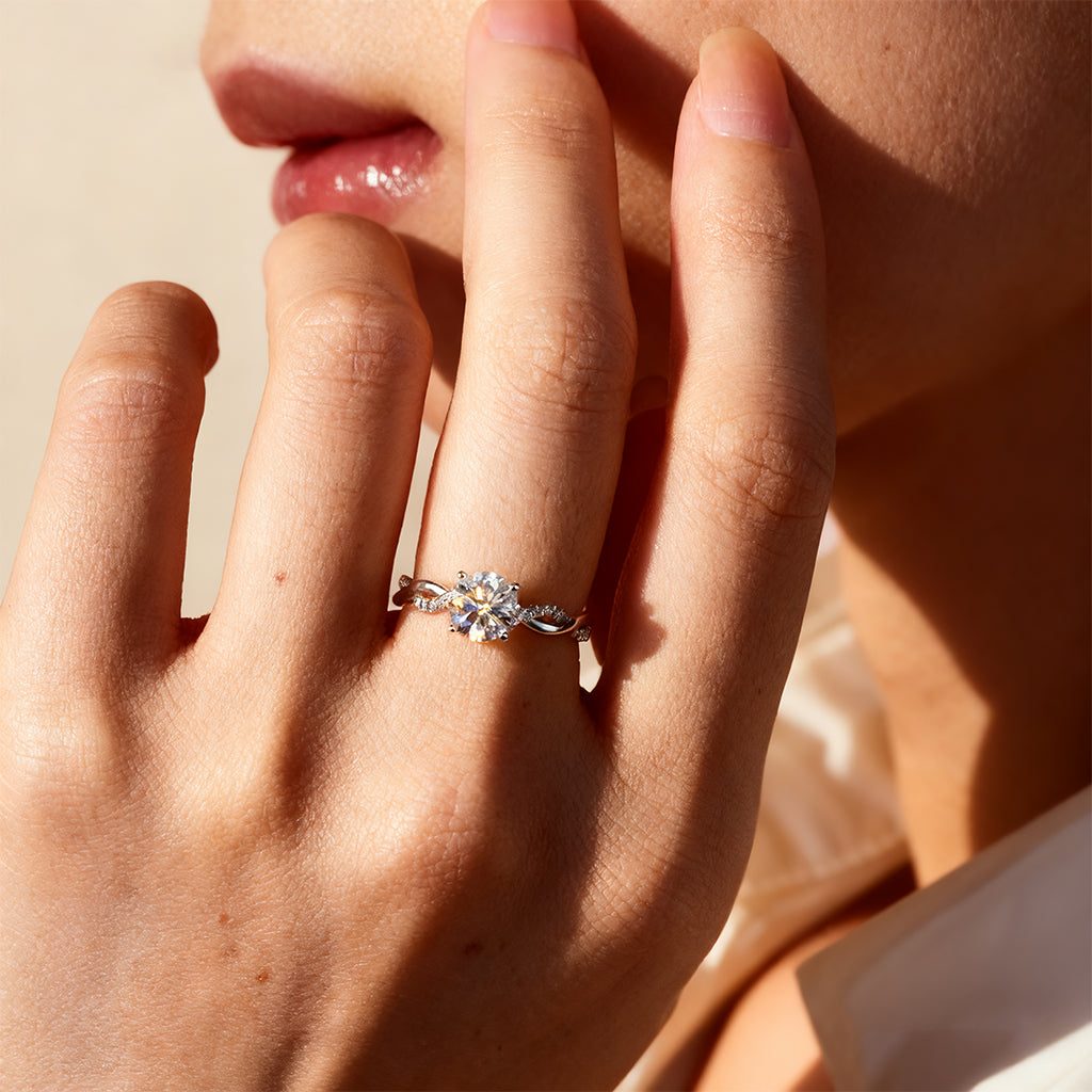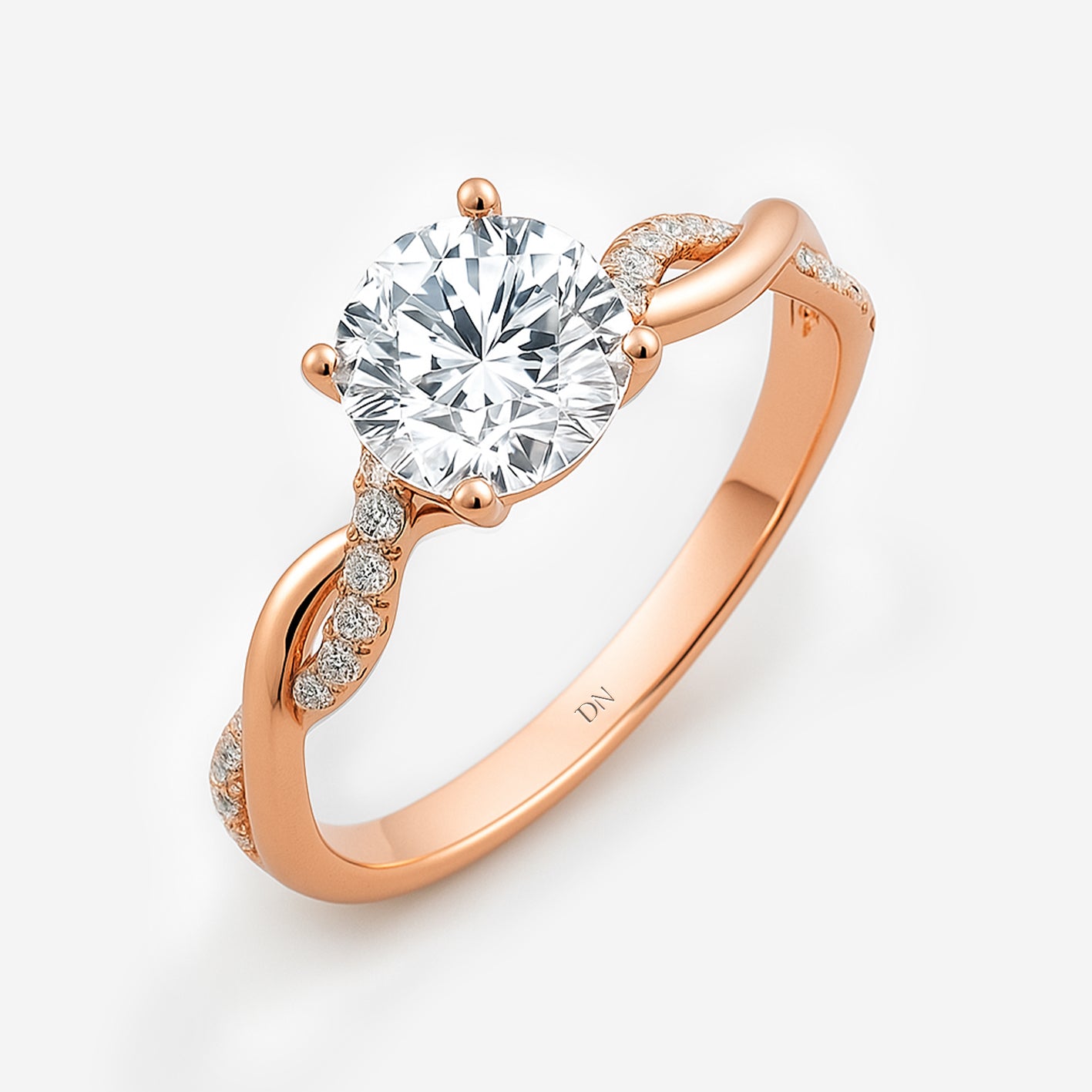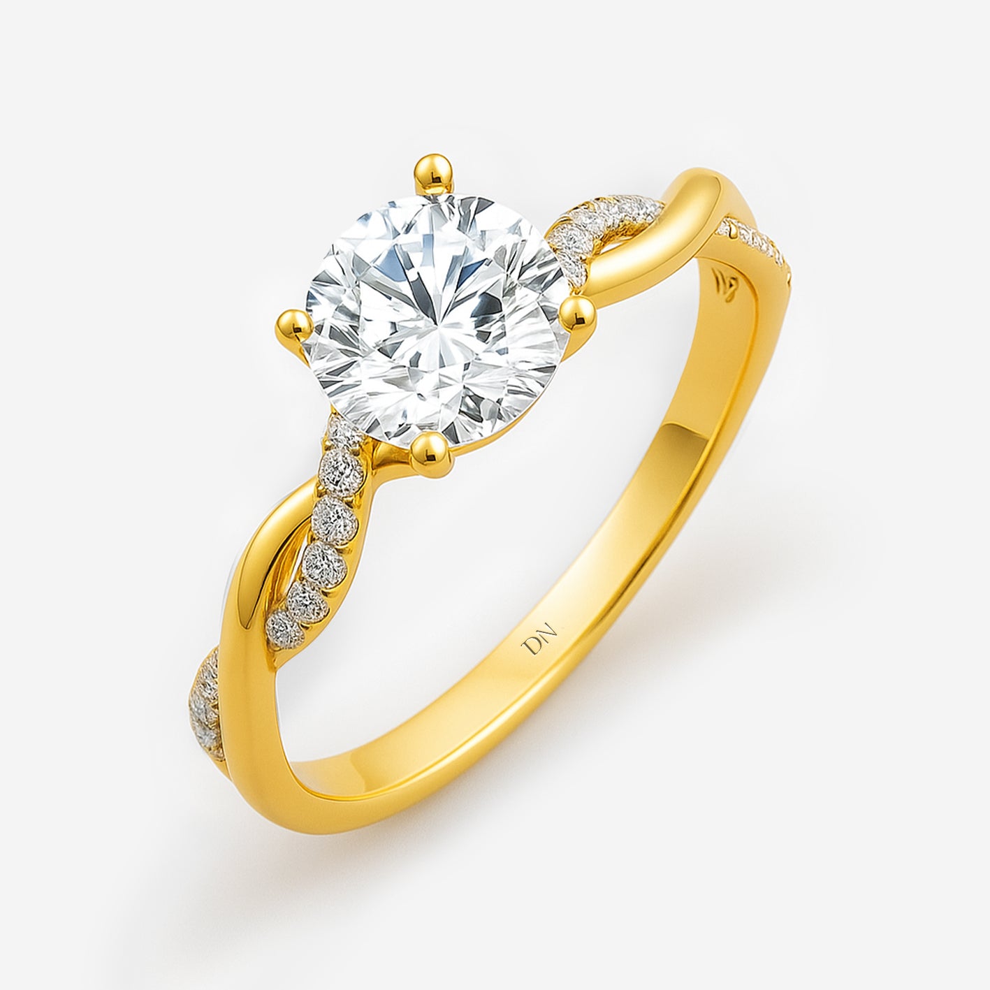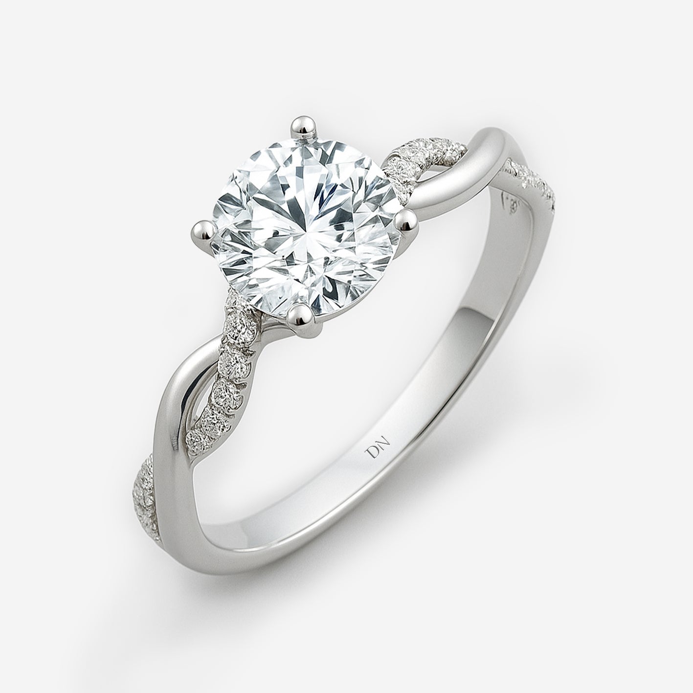 Lyana brings together brilliance and artistry through its round center diamond and elegantly twisted band. The pavé-set accents flow along the intertwining shank, adding texture and sparkle that highlight the central stone. Balancing fluid movement with refined craftsmanship, Lyana is designed to express both grace and individuality.