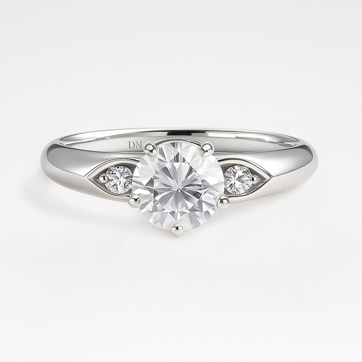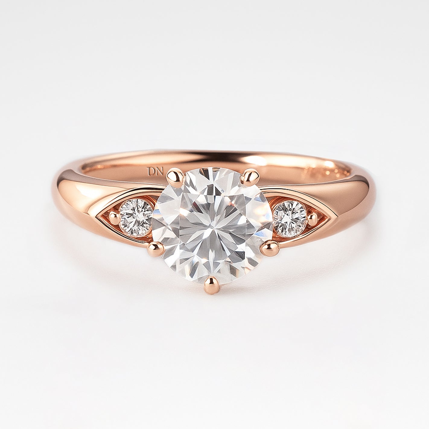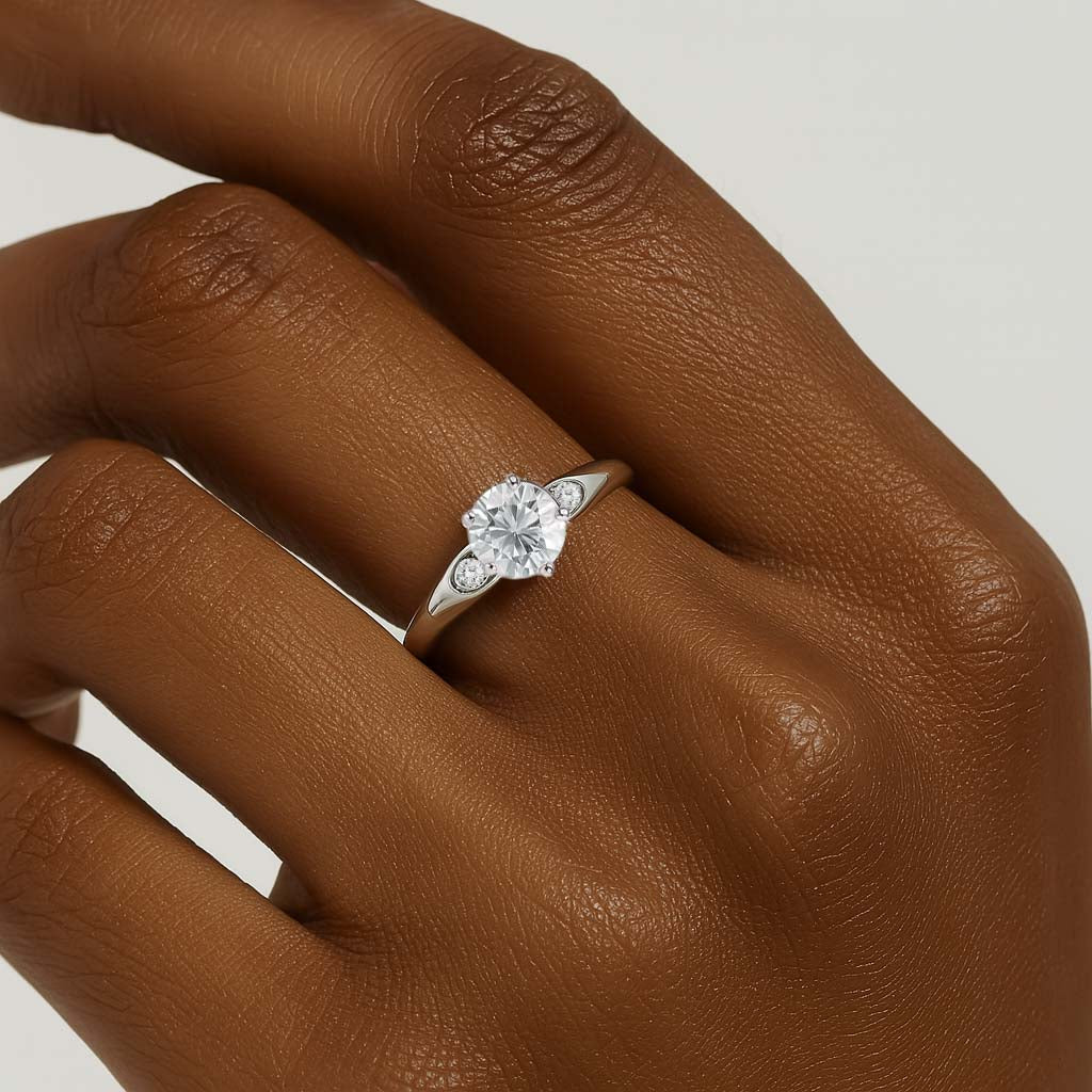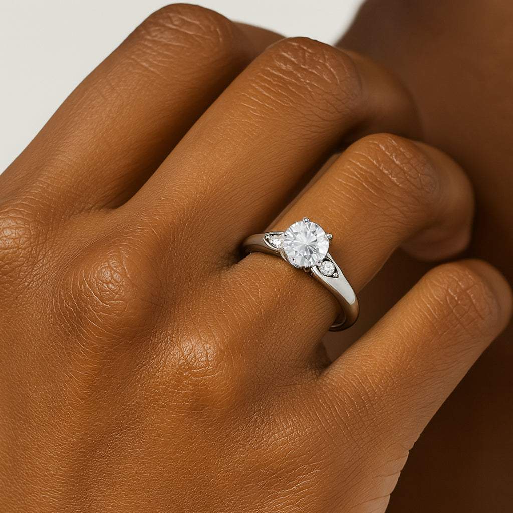 Elegant and refined, the Maeve ring features a round lab-grown diamond flanked by sculpted side motifs inspired by marquise silhouettes. Nestled within the softly contoured band, the accent stones add a subtle sparkle and vintage charm. With its graceful symmetry and poetic detailing, Maeve evokes timeless romance with a modern touch.