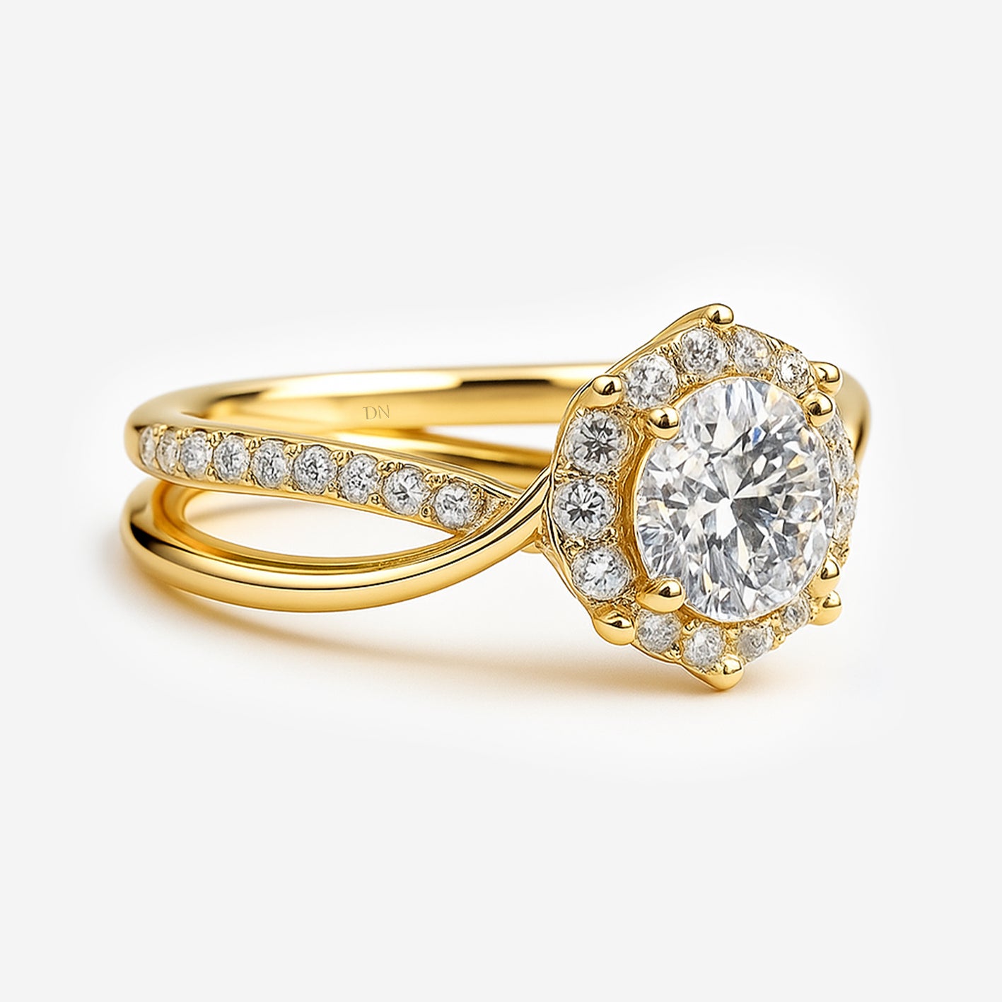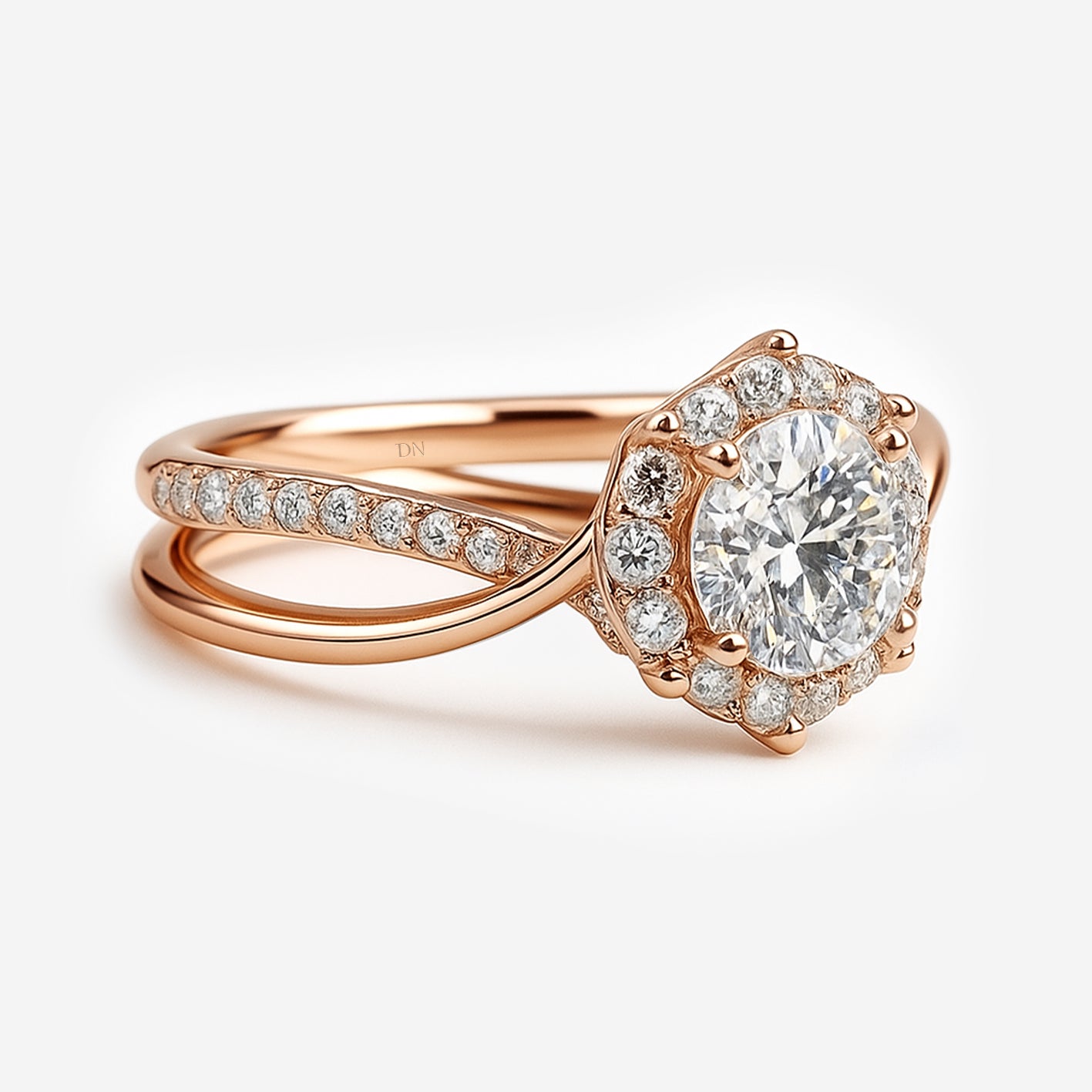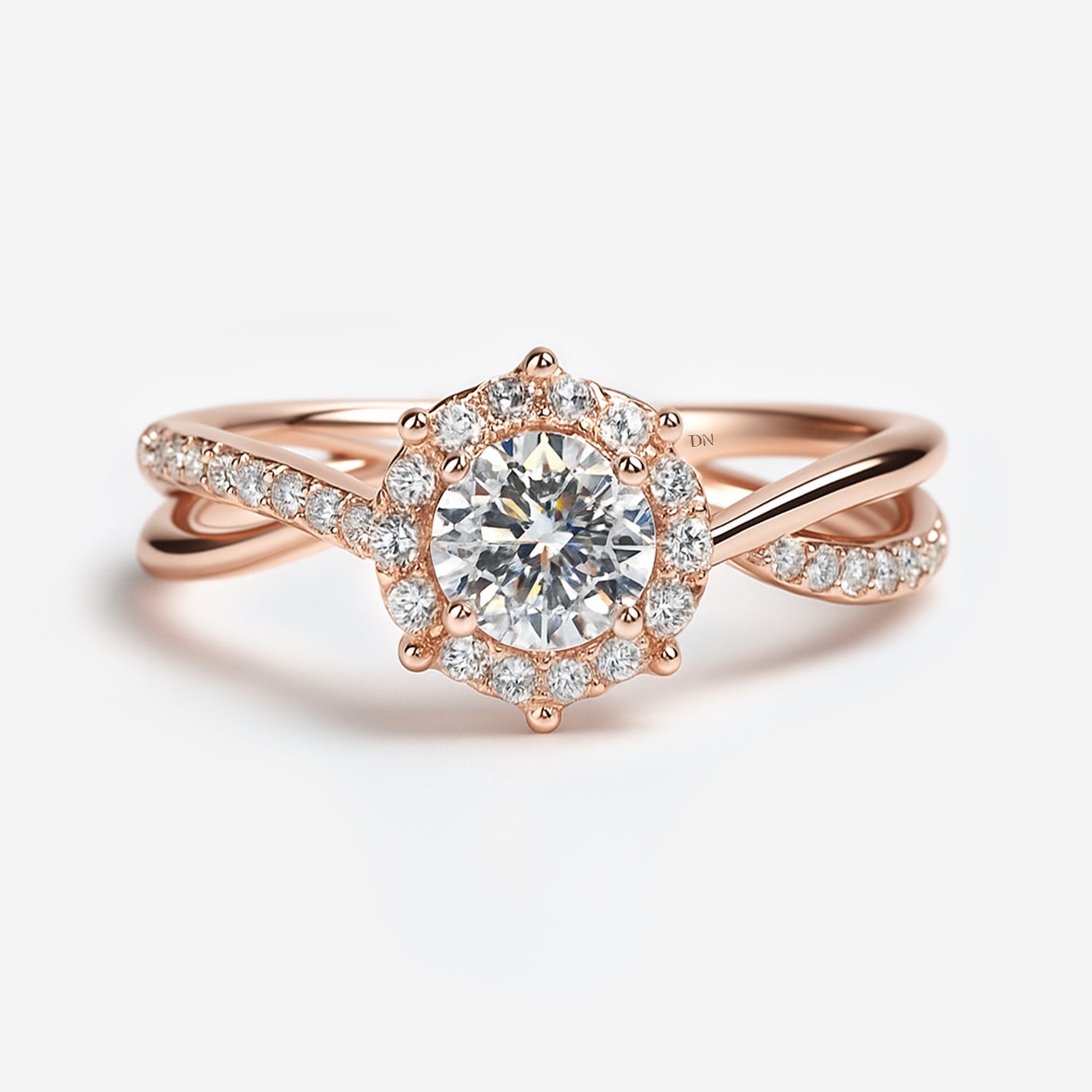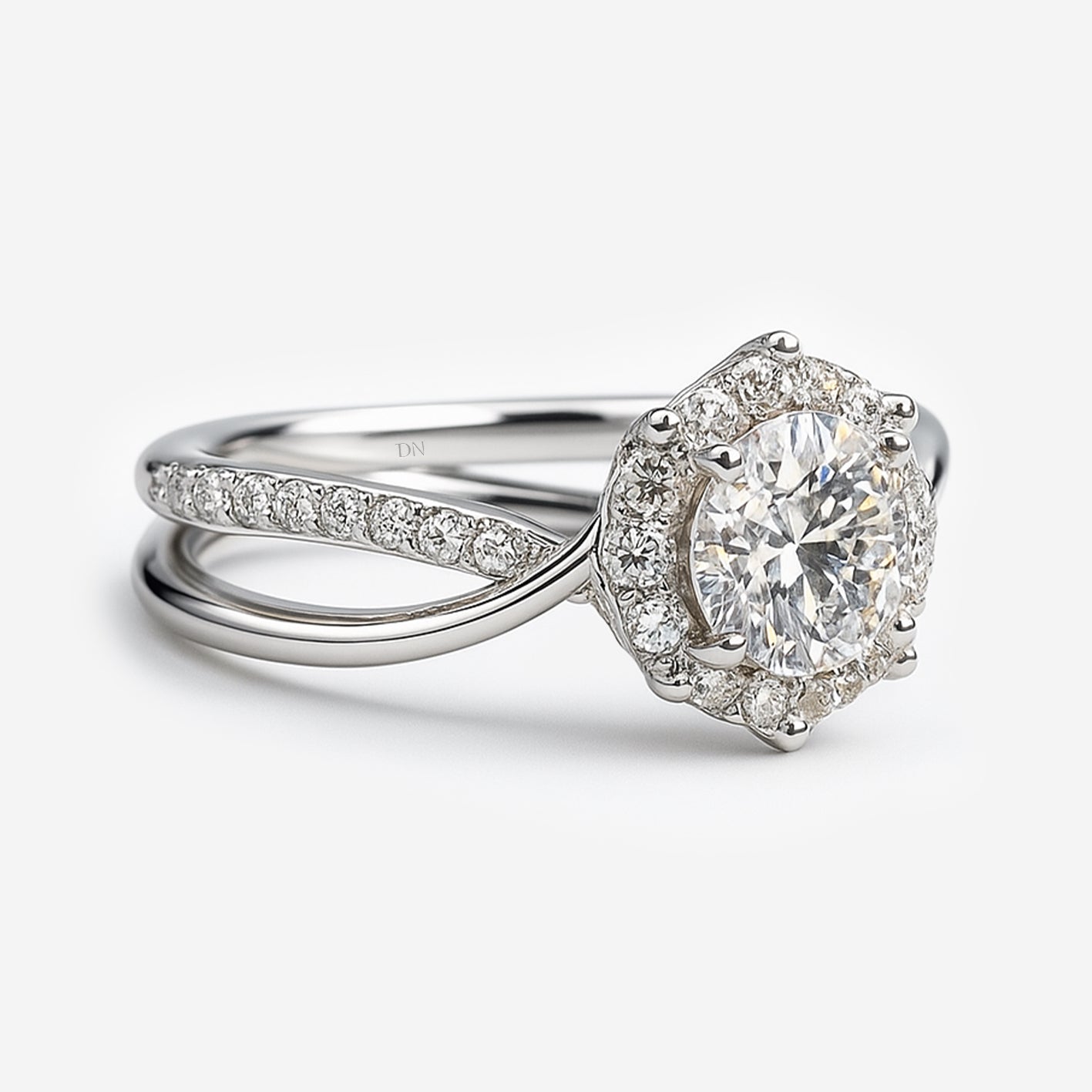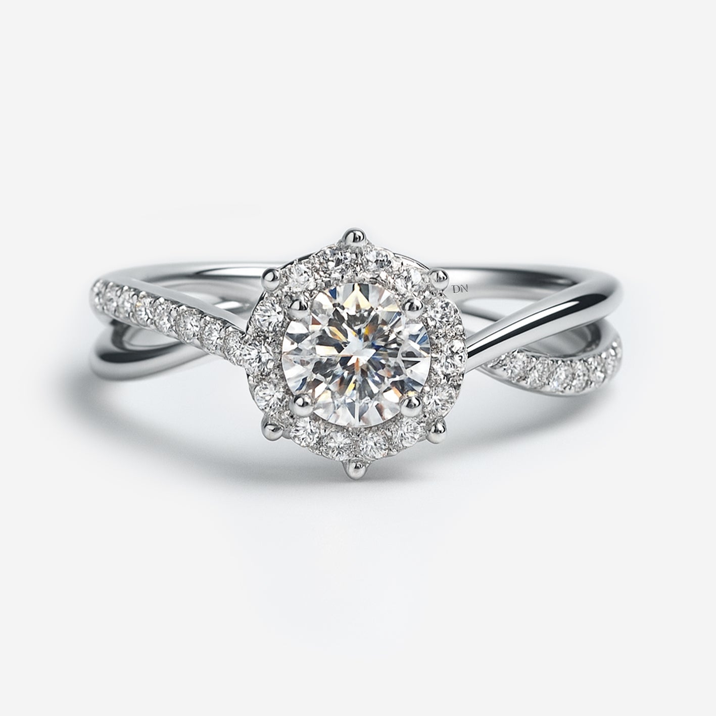 Selwyn showcases a brilliant round center diamond framed by a delicate halo, amplifying its fire and luminosity. The twisted pavé band introduces graceful movement, creating a design that feels both refined and dynamic. A perfect balance of radiance and artistry, Selwyn reflects elegance in every detail.