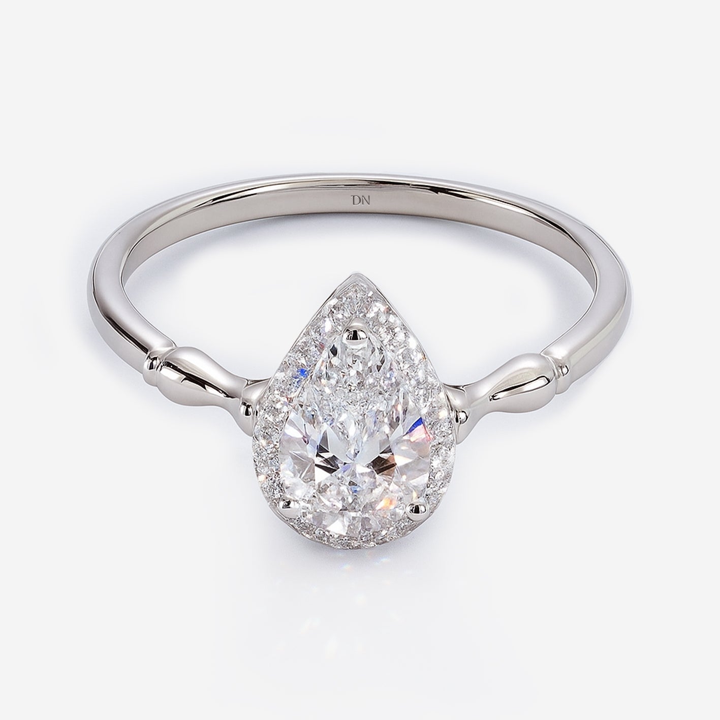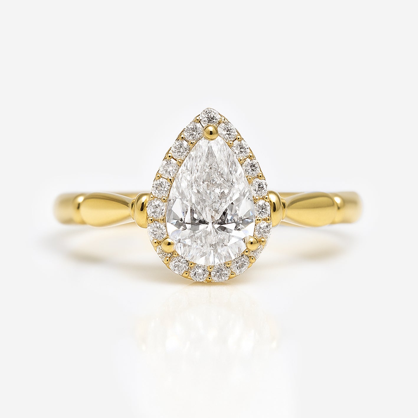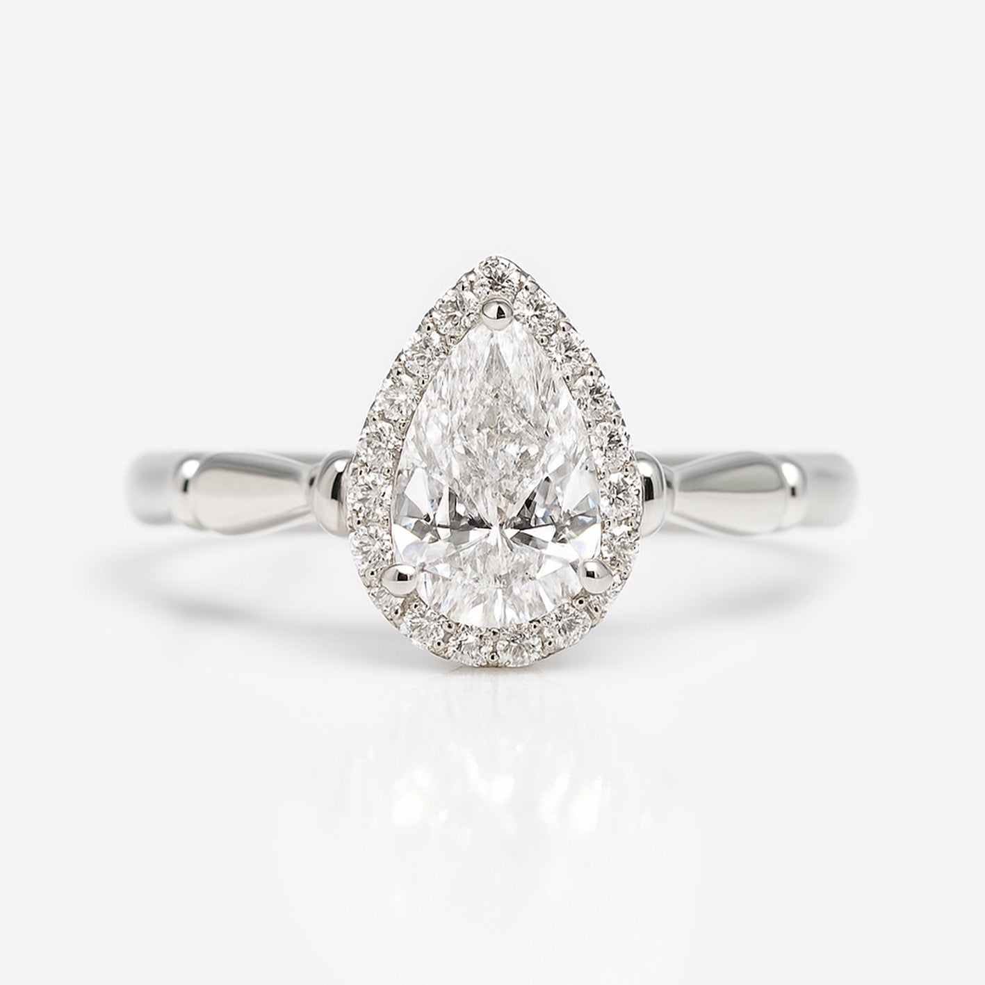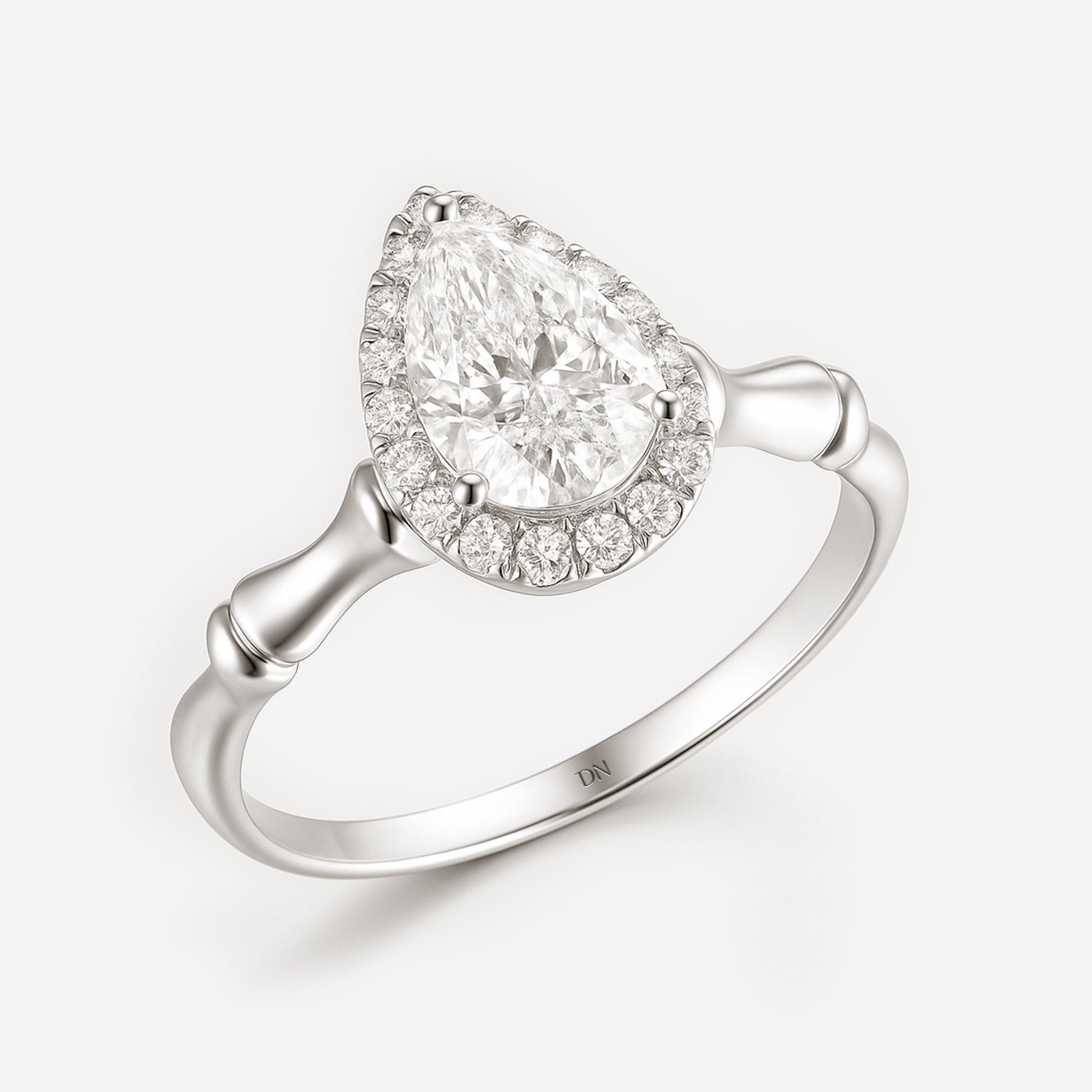 Serenya highlights the elegance of a pear-cut center diamond framed by a halo of pavé accents, creating a luminous teardrop silhouette. The band is crafted with subtle contours that add depth and refinement, enhancing both comfort and visual intrigue. With its balance of radiant sparkle and thoughtful design, Serenya embodies grace with a distinctive modern touch.