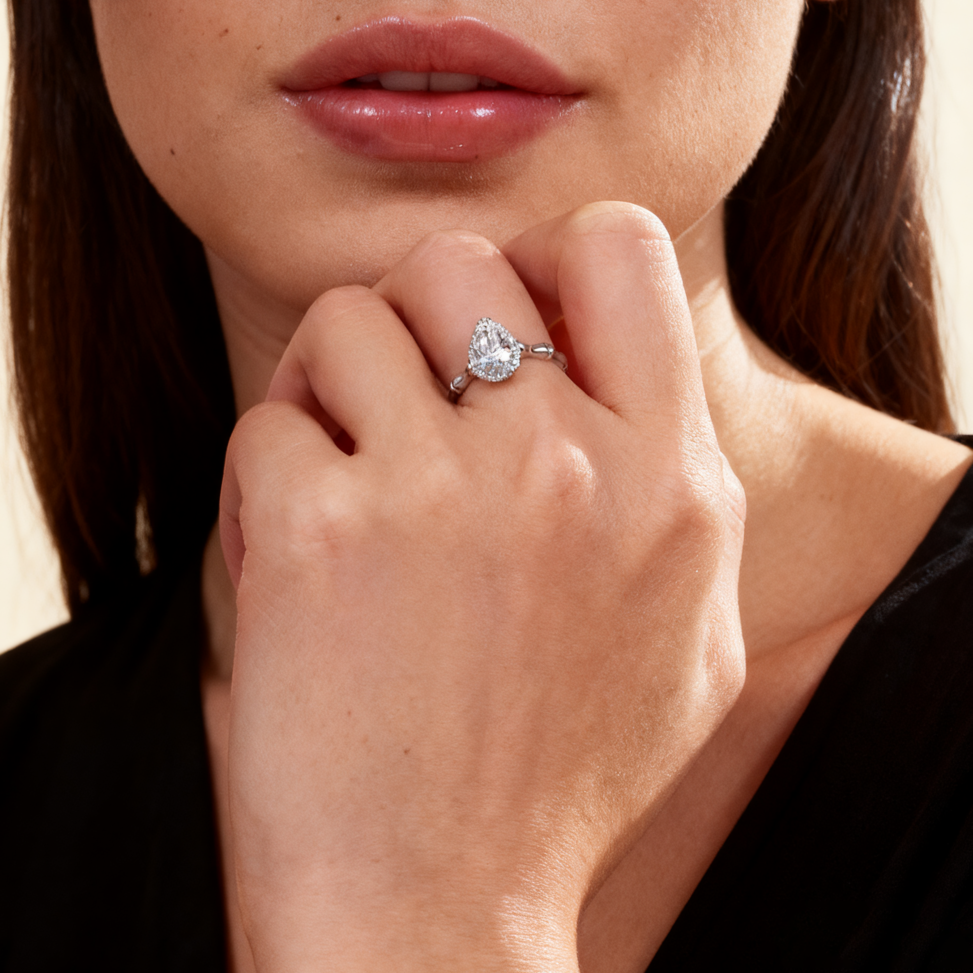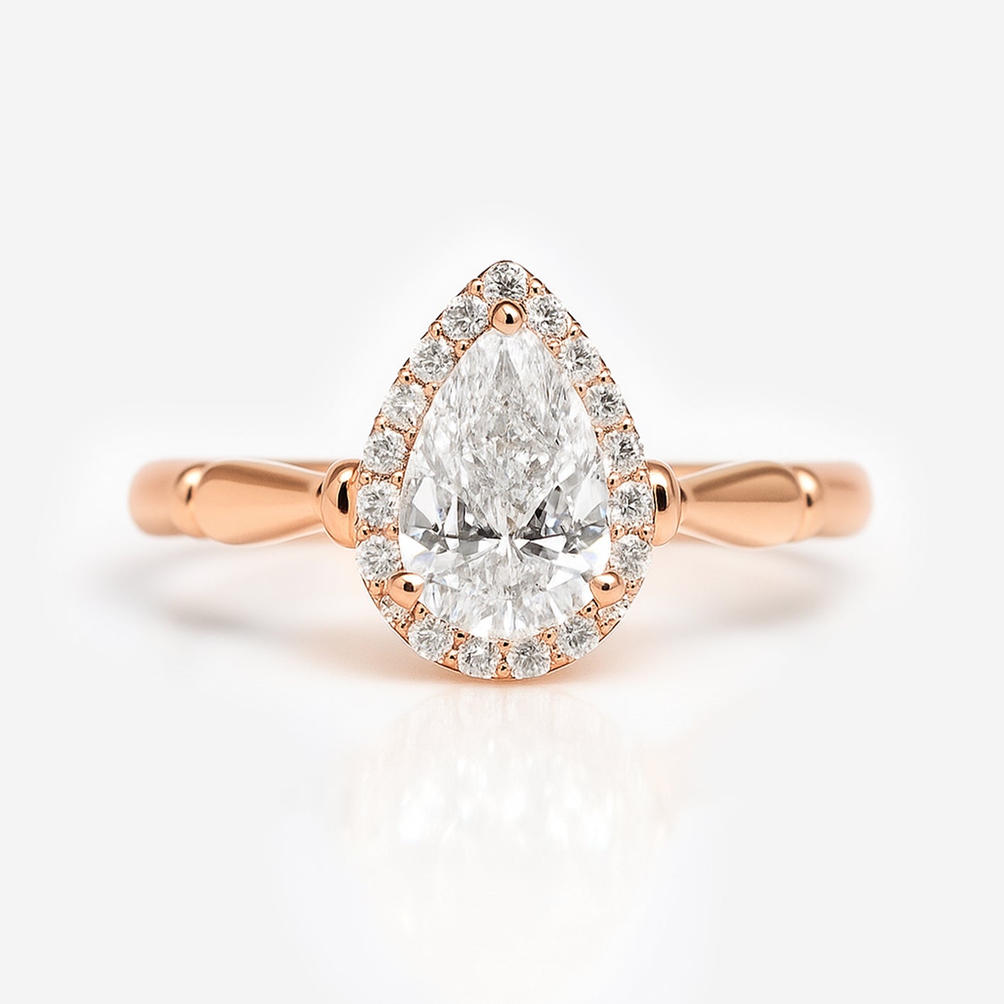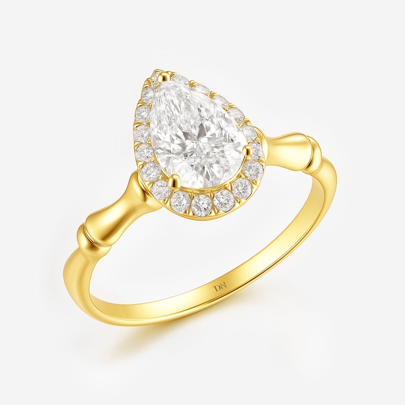 Serenya highlights the elegance of a pear-cut center diamond framed by a halo of pavé accents, creating a luminous teardrop silhouette. The band is crafted with subtle contours that add depth and refinement, enhancing both comfort and visual intrigue. With its balance of radiant sparkle and thoughtful design, Serenya embodies grace with a distinctive modern touch.