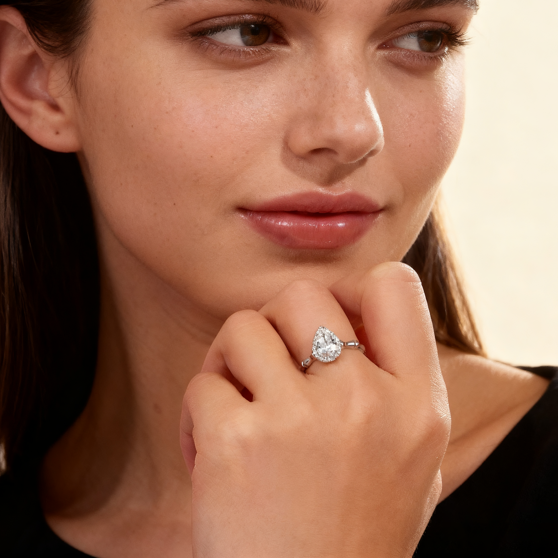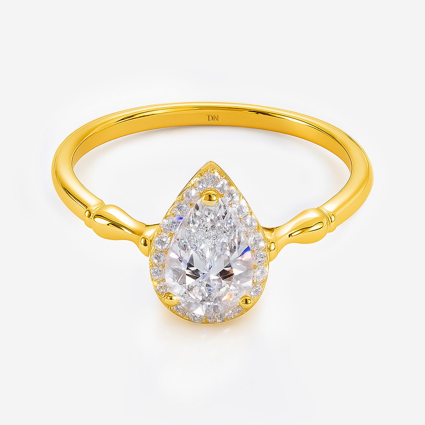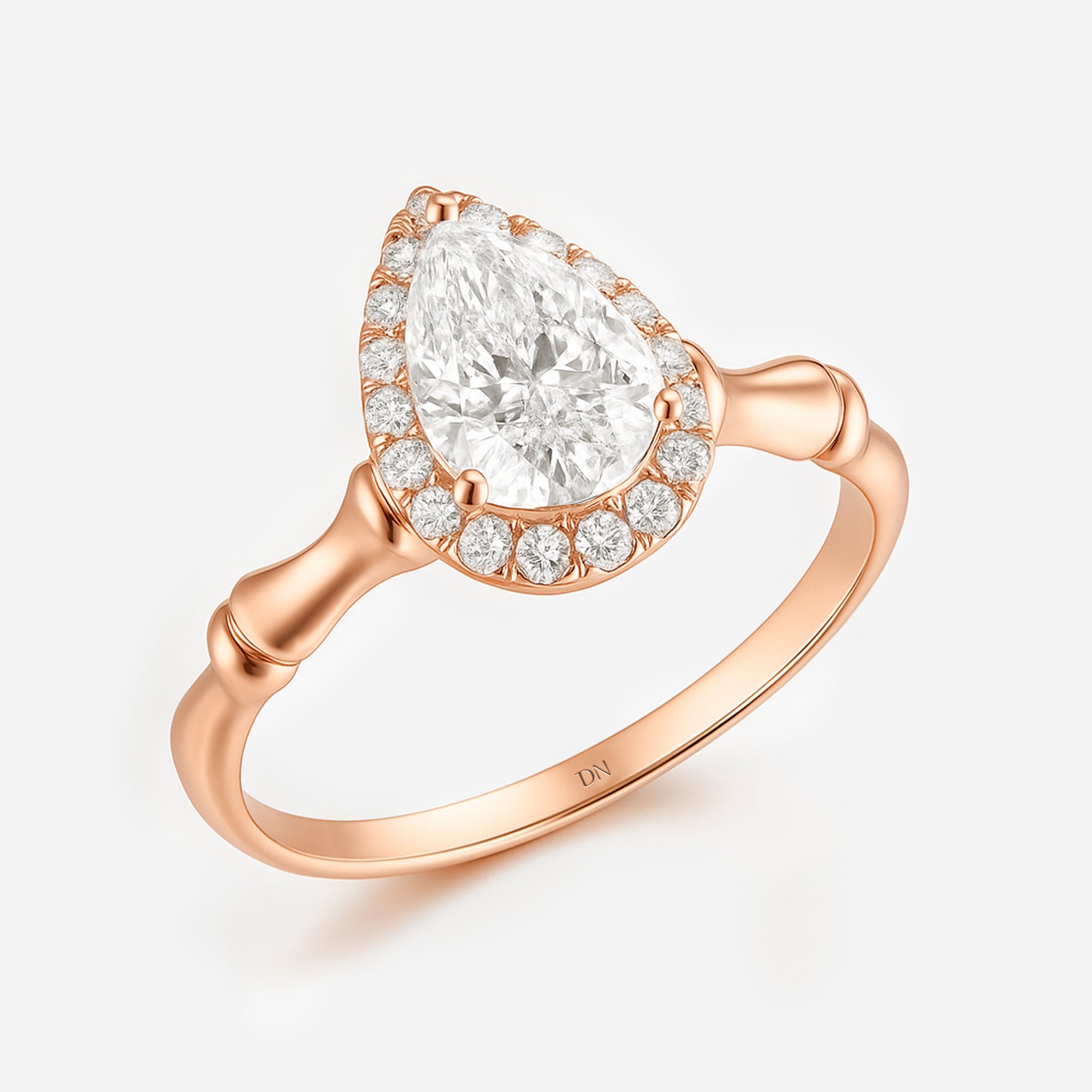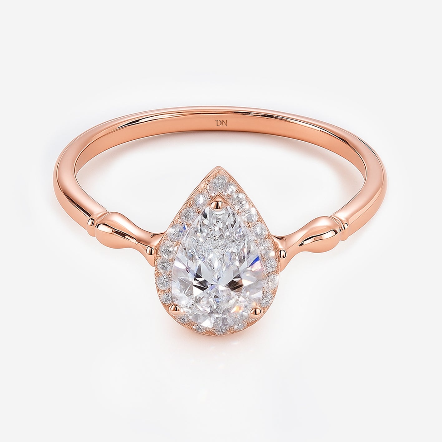 Serenya highlights the elegance of a pear-cut center diamond framed by a halo of pavé accents, creating a luminous teardrop silhouette. The band is crafted with subtle contours that add depth and refinement, enhancing both comfort and visual intrigue. With its balance of radiant sparkle and thoughtful design, Serenya embodies grace with a distinctive modern touch.