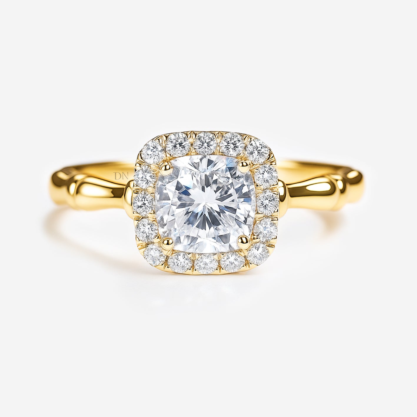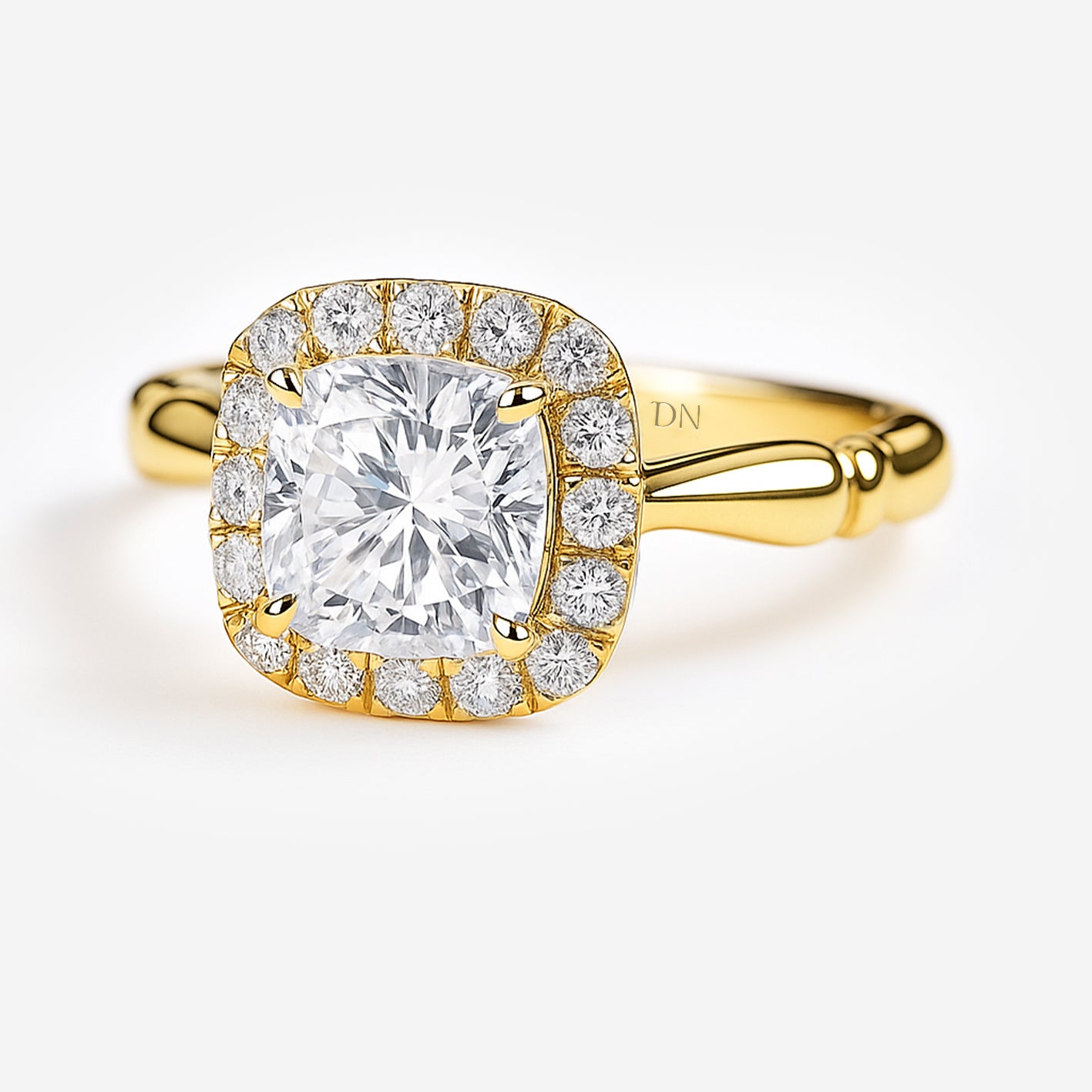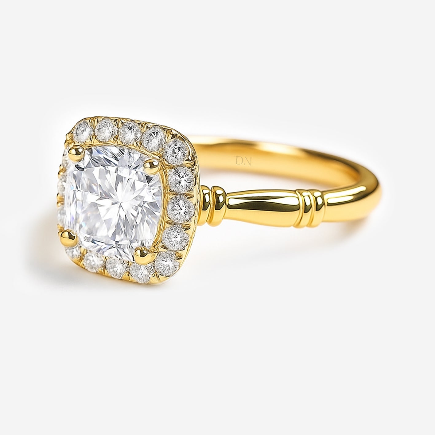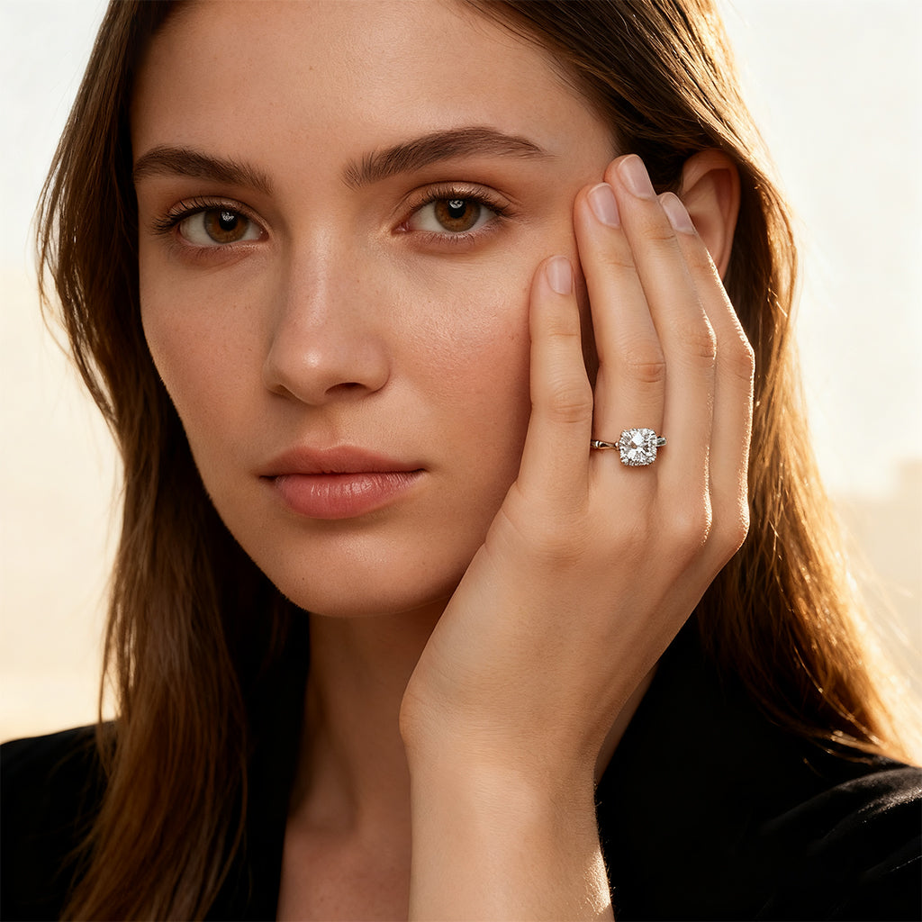 Serenyaan takes on a new expression with a cushion-cut center diamond, surrounded by a halo of pavé accents that amplify its brilliance. The soft square silhouette combines the elegance of round curves with defined edges, creating a harmonious balance of sparkle and structure. Set on a refined band, this design highlights the diamond’s fire while offering a graceful, contemporary look.