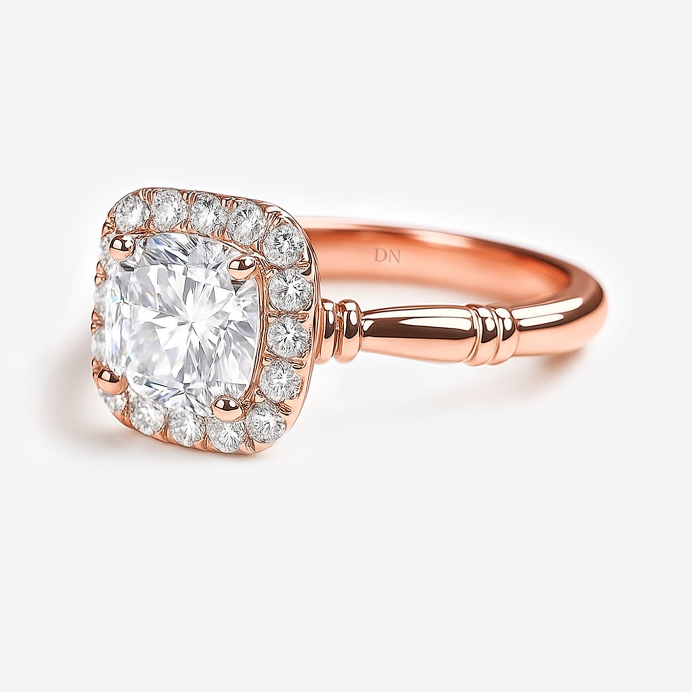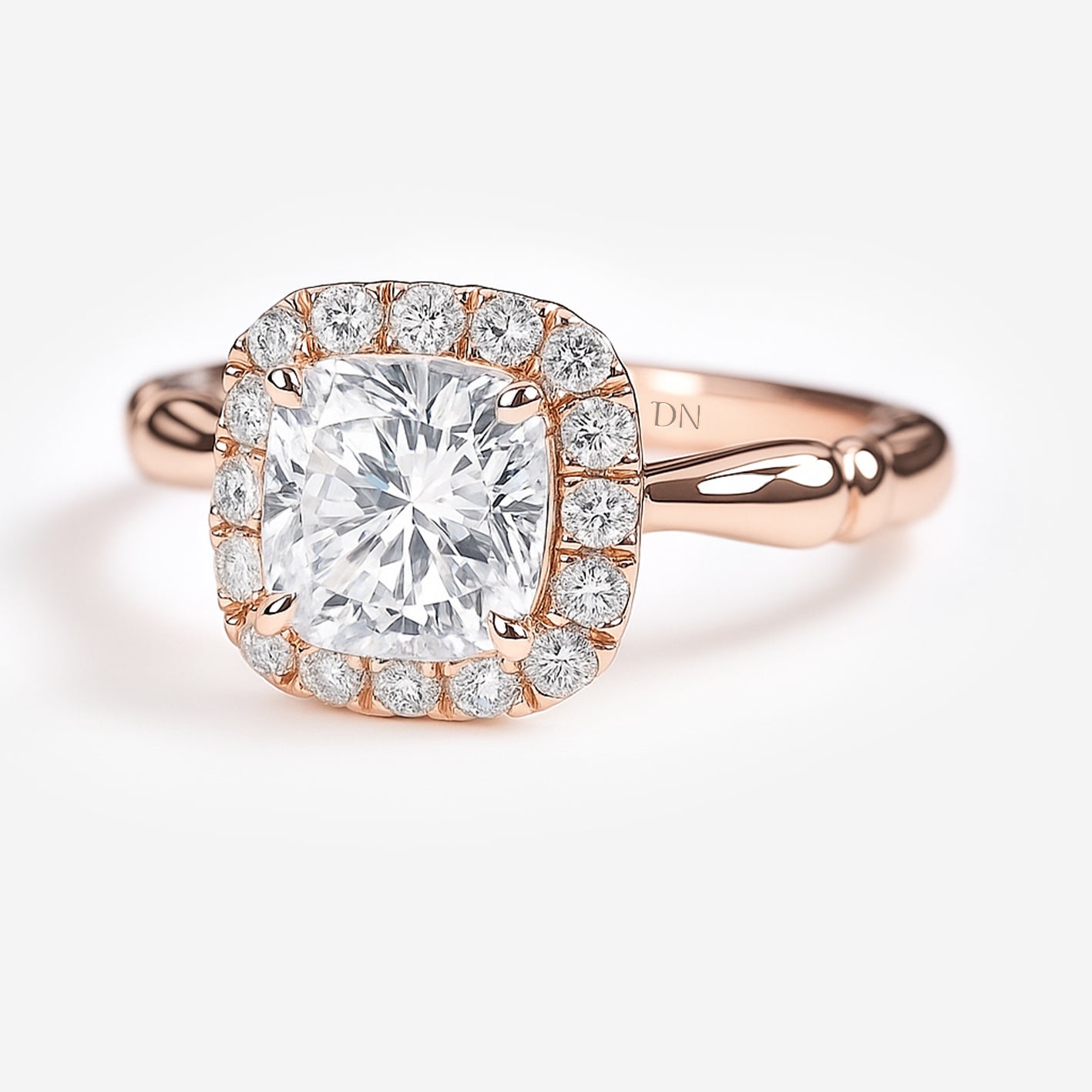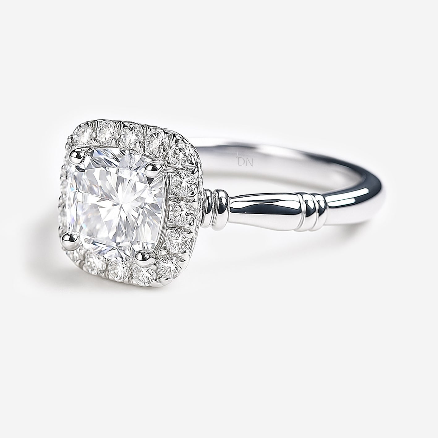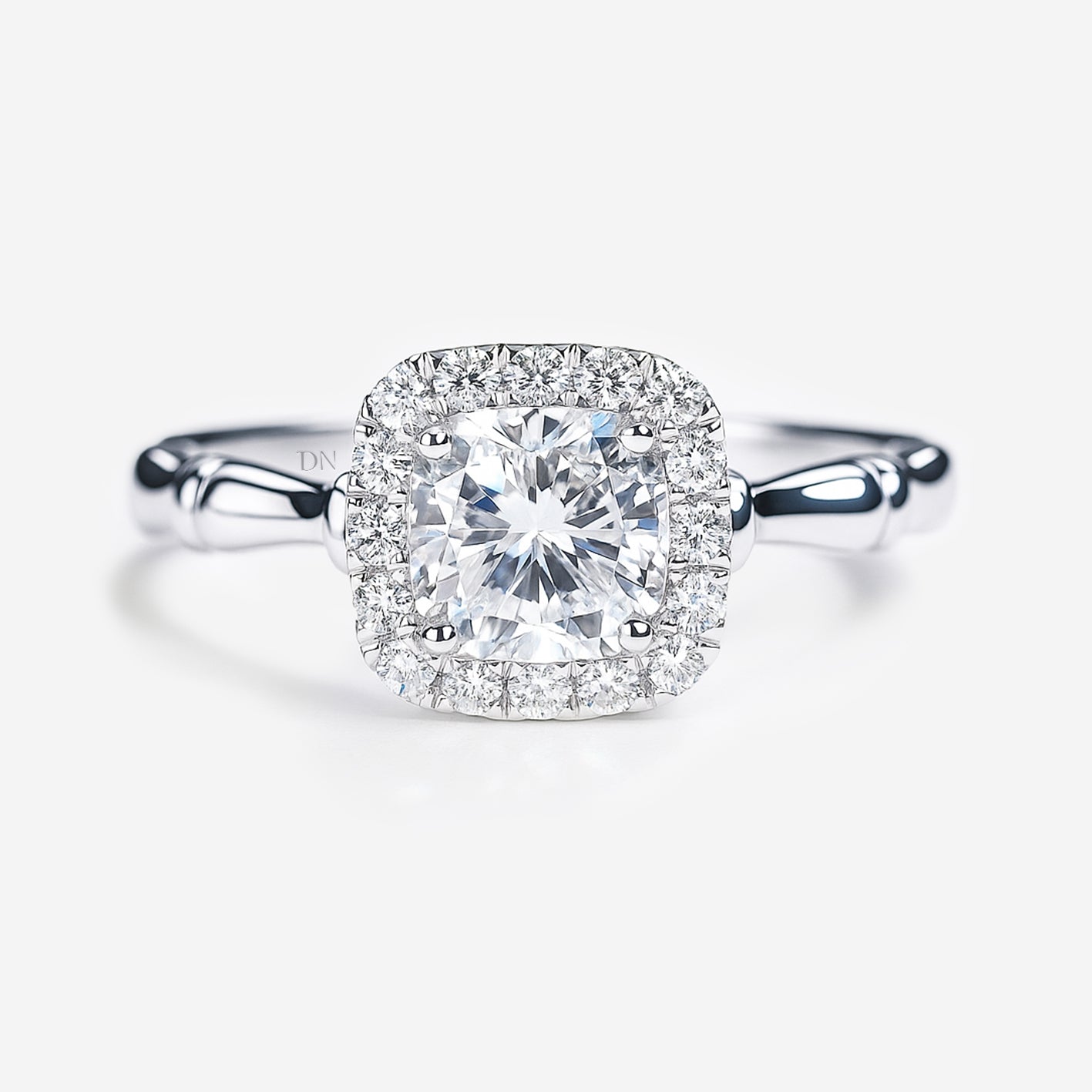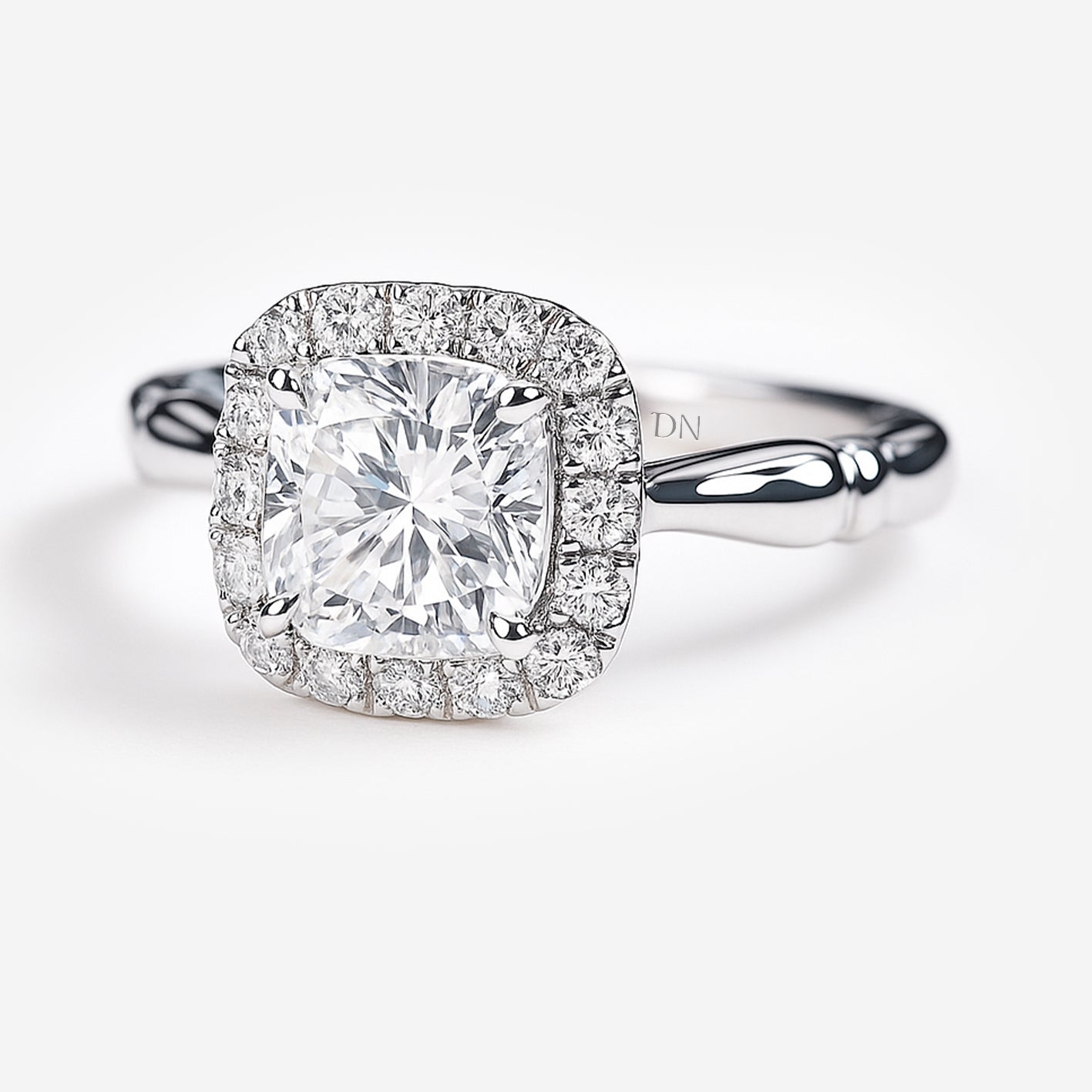 Serenyaan takes on a new expression with a cushion-cut center diamond, surrounded by a halo of pavé accents that amplify its brilliance. The soft square silhouette combines the elegance of round curves with defined edges, creating a harmonious balance of sparkle and structure. Set on a refined band, this design highlights the diamond’s fire while offering a graceful, contemporary look.