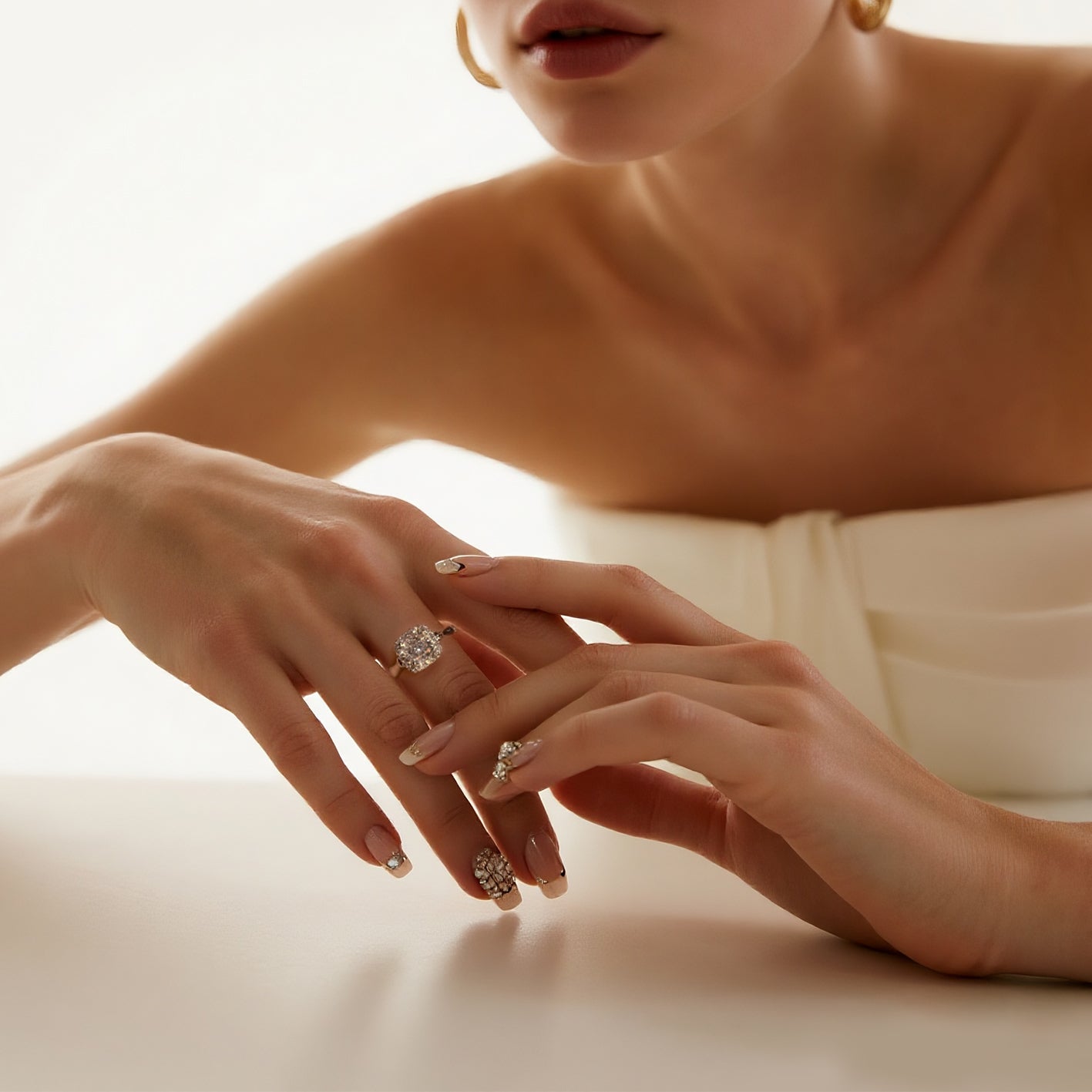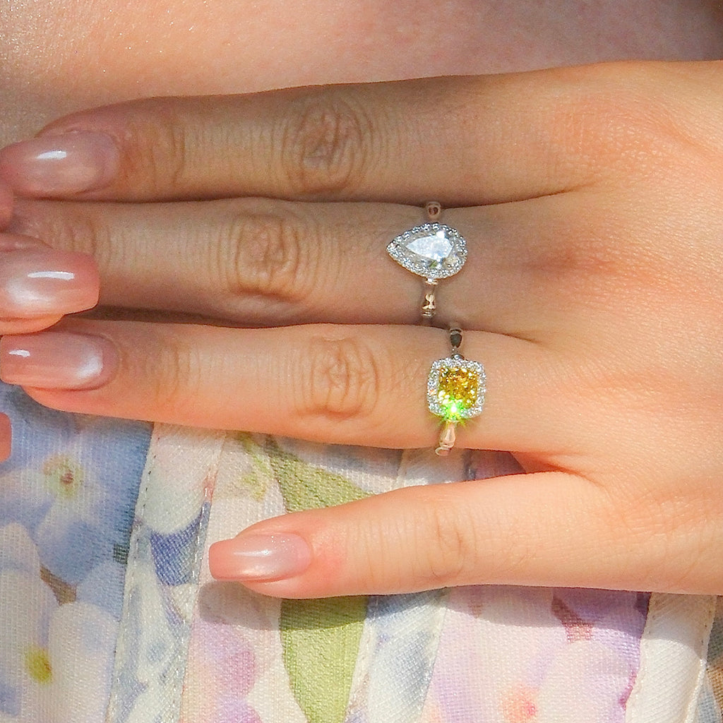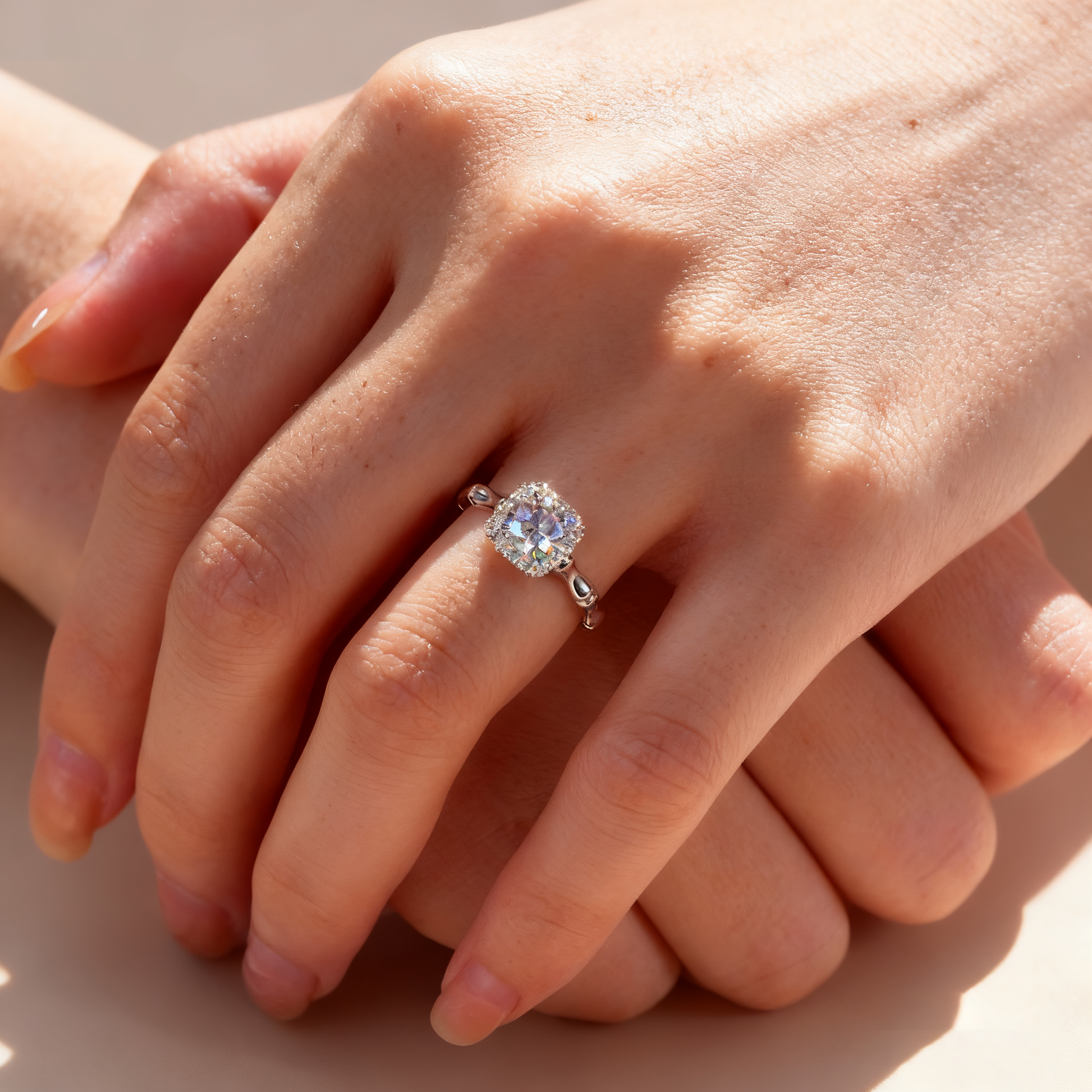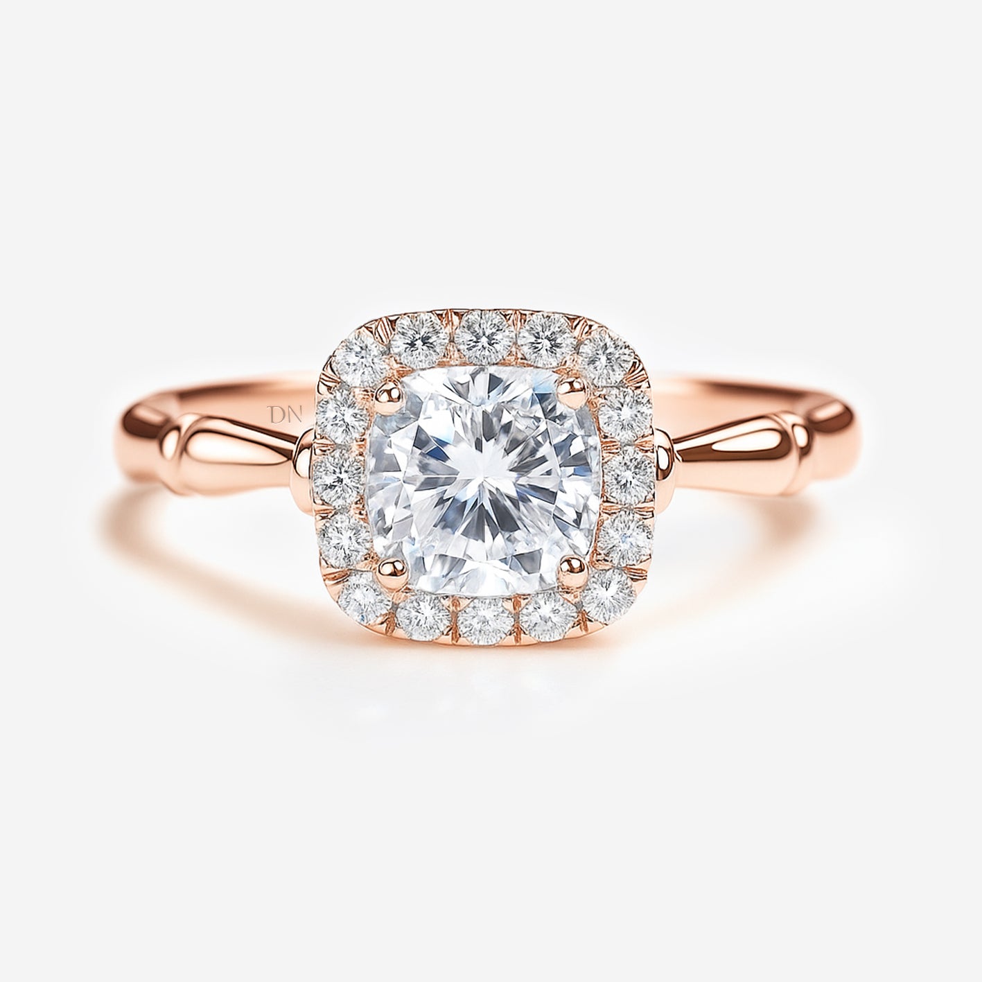 Serenyaan takes on a new expression with a cushion-cut center diamond, surrounded by a halo of pavé accents that amplify its brilliance. The soft square silhouette combines the elegance of round curves with defined edges, creating a harmonious balance of sparkle and structure. Set on a refined band, this design highlights the diamond’s fire while offering a graceful, contemporary look.