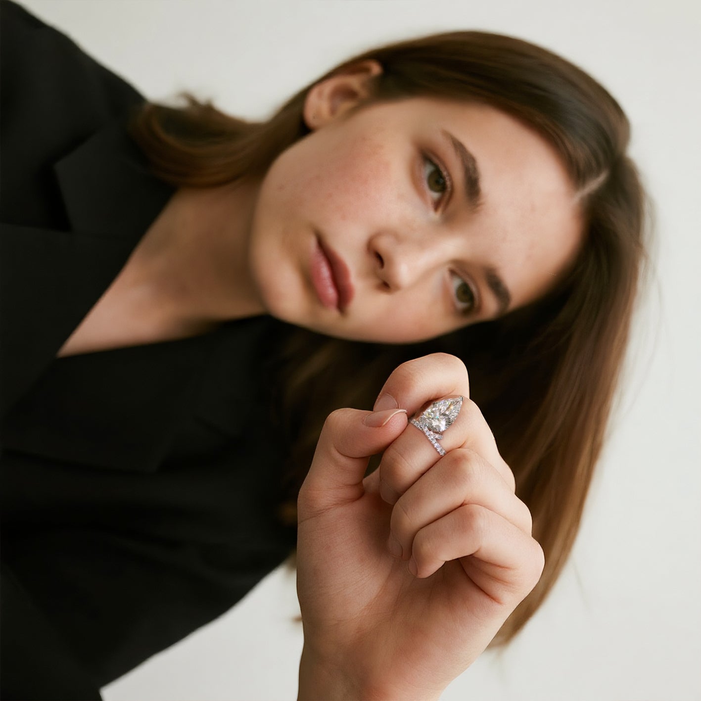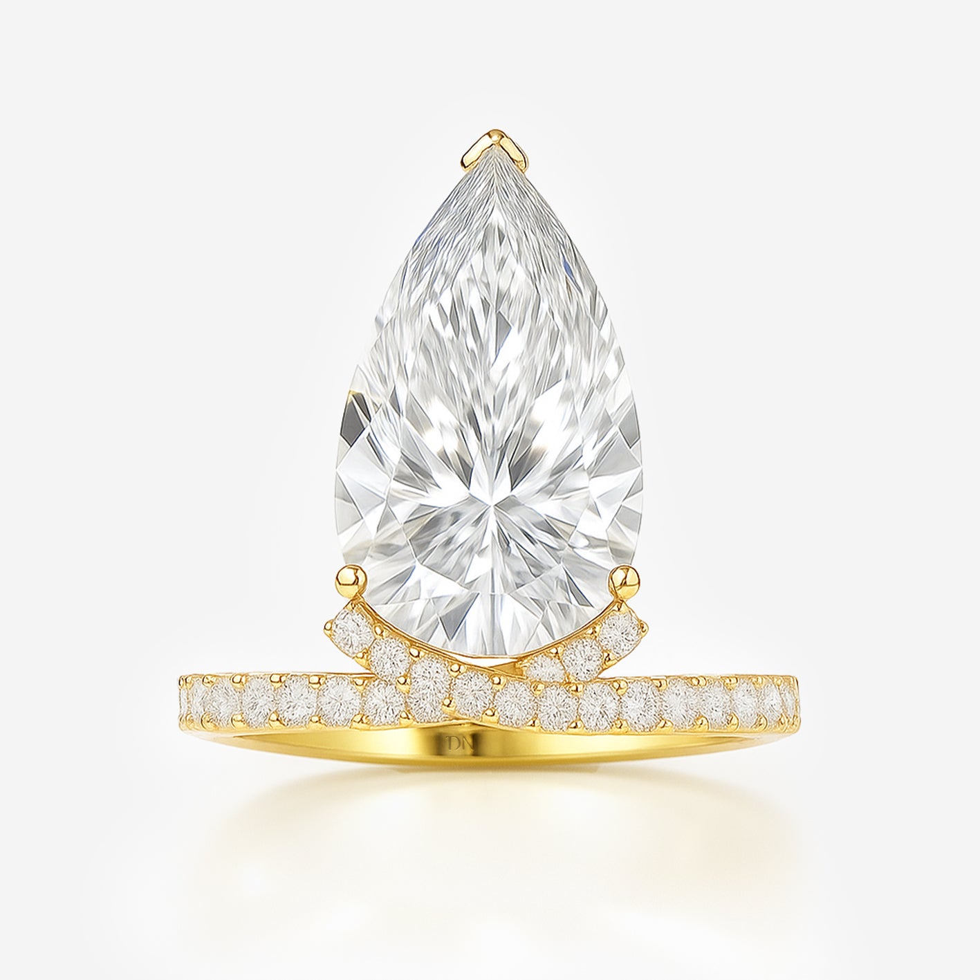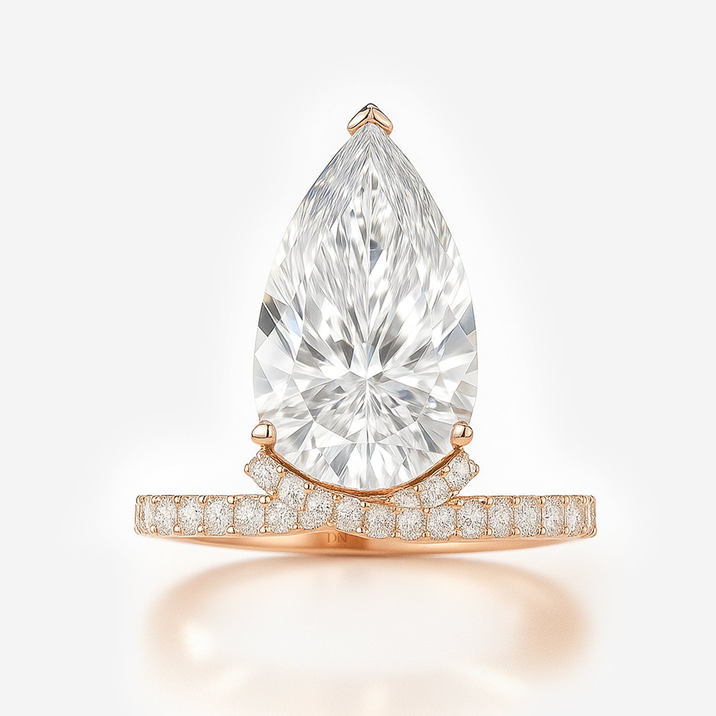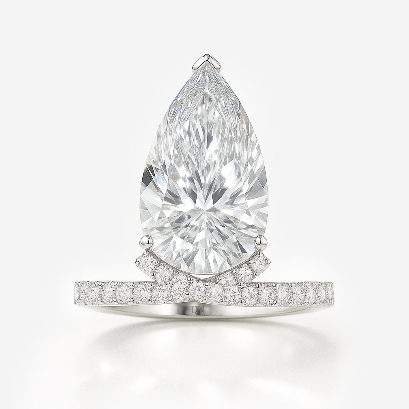 Sylven embodies quiet luxury through its refined pear-cut centerpiece, where gentle curves converge to a poised tip. The elongated shape amplifies brilliance while adding an elegant length to the finger. A pavé-set band frames the design with subtle radiance, ensuring every angle catches the light. Modern, graceful, and timeless—Sylven is a statement of elegance designed for those who appreciate distinction in simplicity.